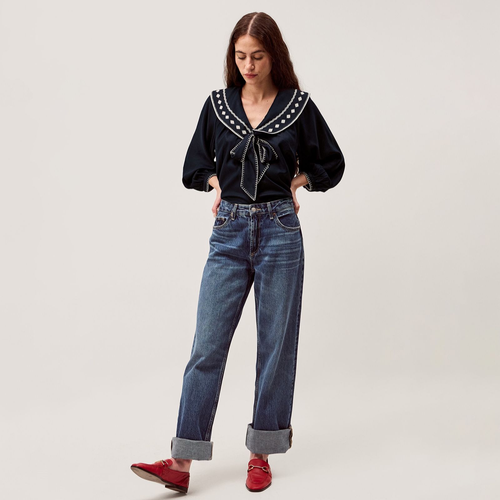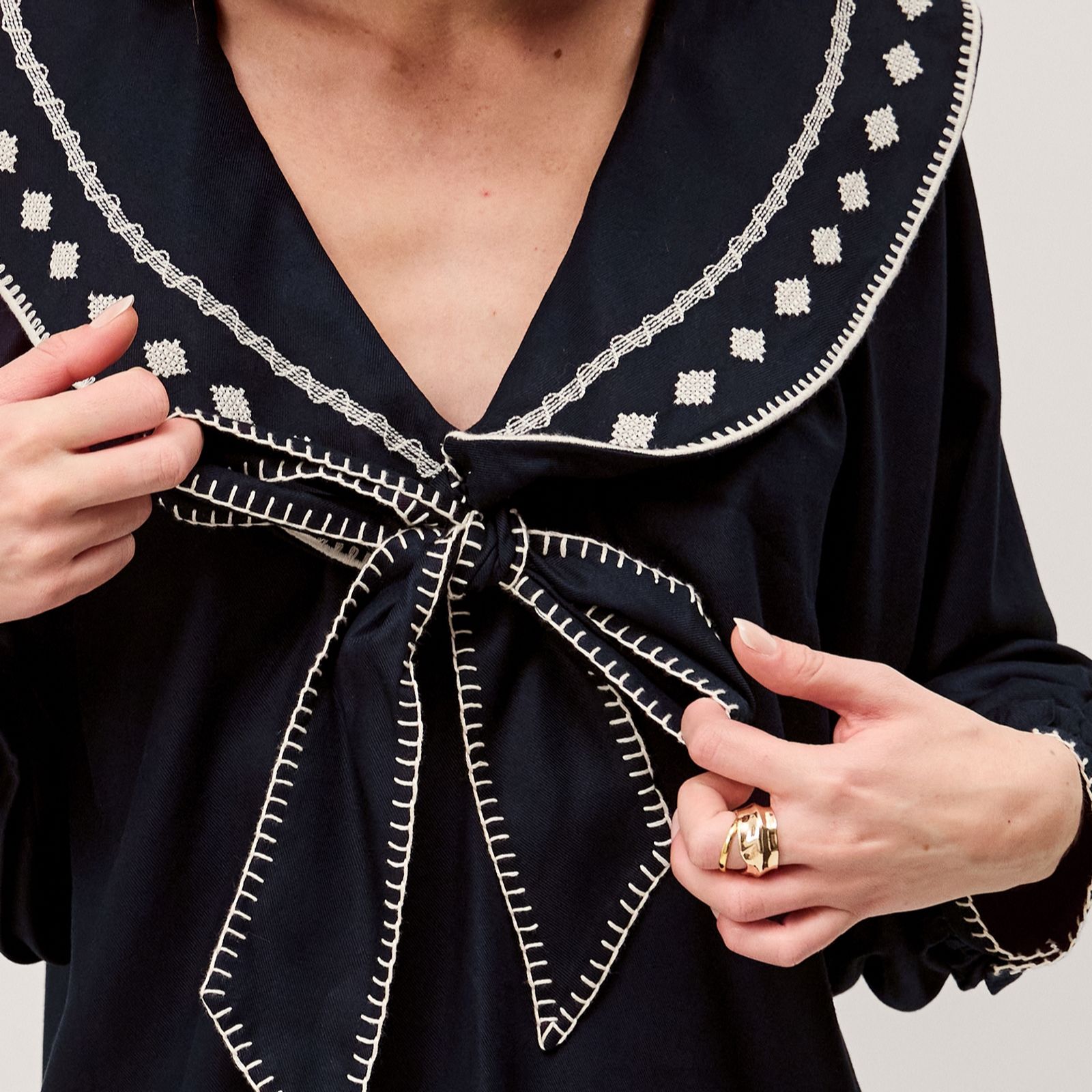 - Oversized, embroidered sailor collar ending in a bow at the chest