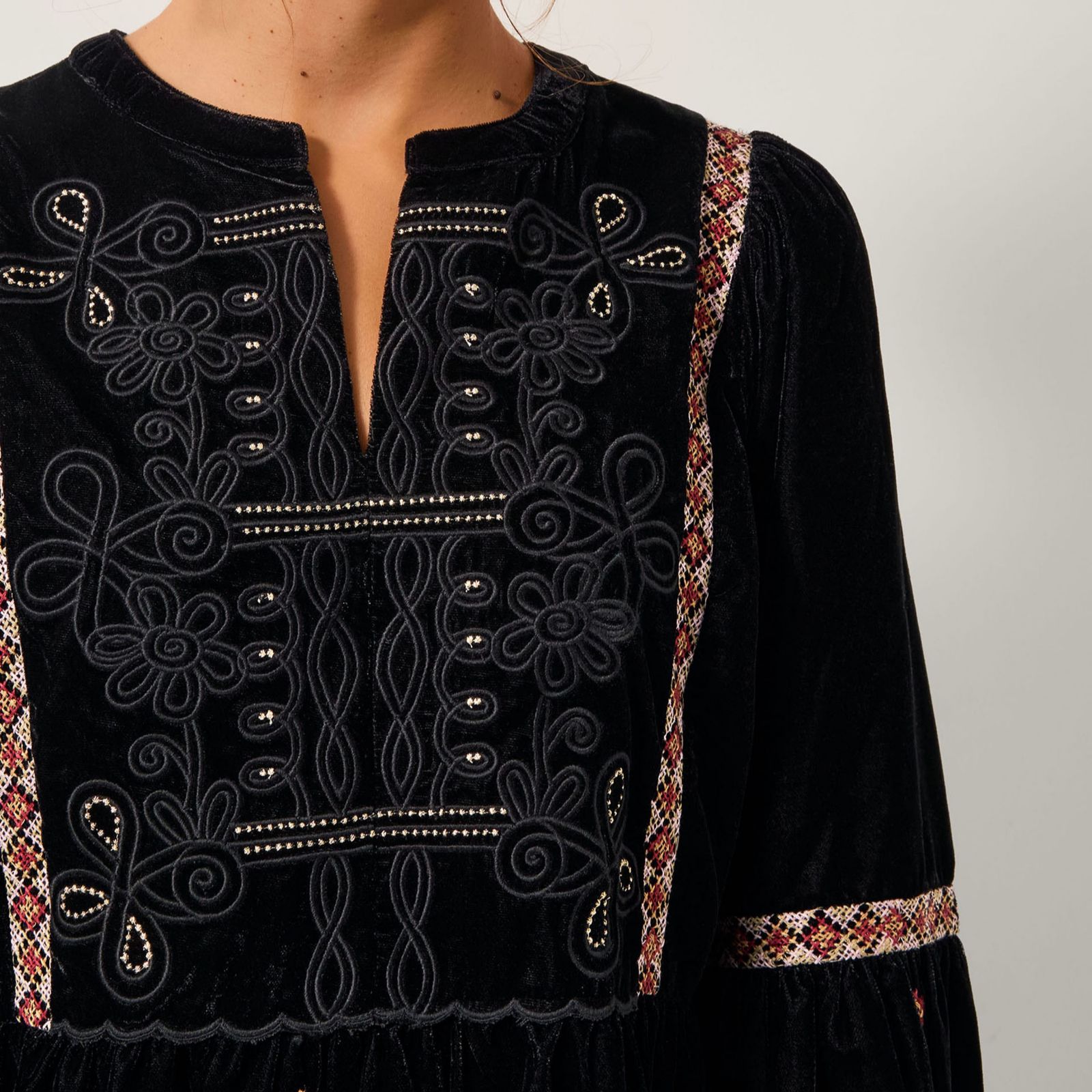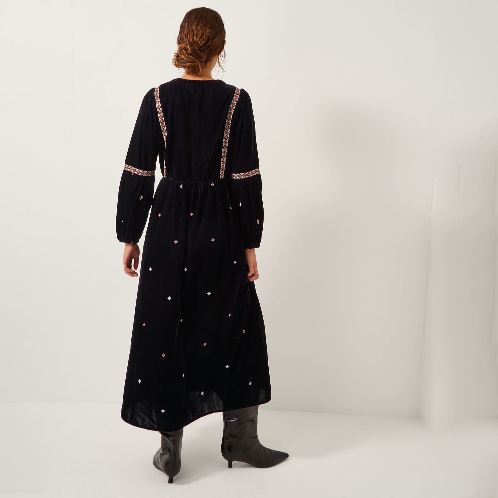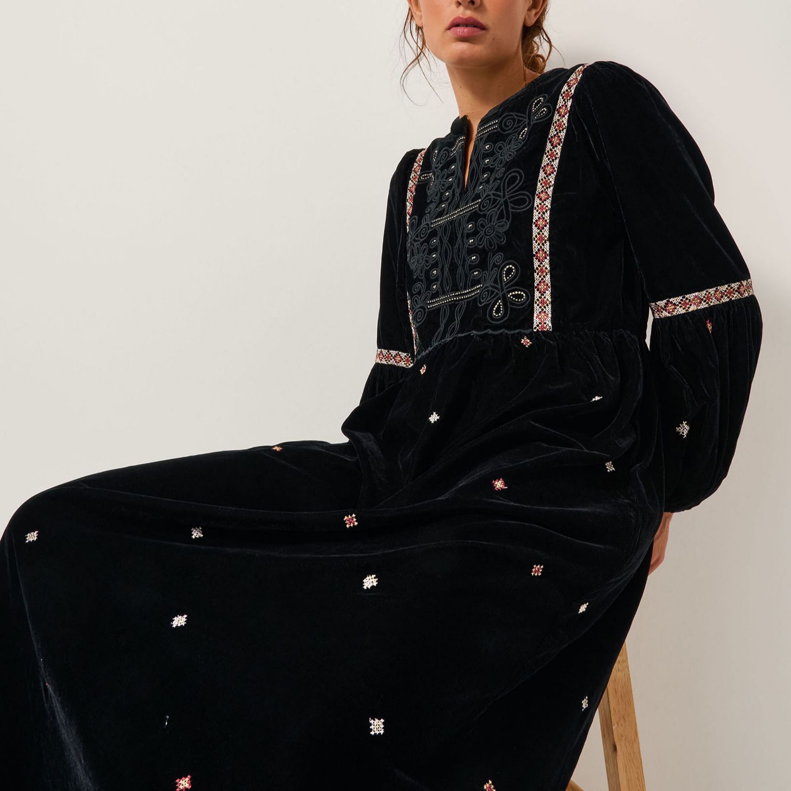 Exude bohemian charm in the Noni velvet embroidered dress from Monsoon, where intricate loopy floral embroidery and colourful tapestry details adorn a timeless black backdrop. Perfect for autumn gatherings, dinner dates or simply adding a touch of artistry to your everyday, this dress transitions effortlessly from day to night. Pair with ankle boots and a cosy scarf for a chic seasonal look.