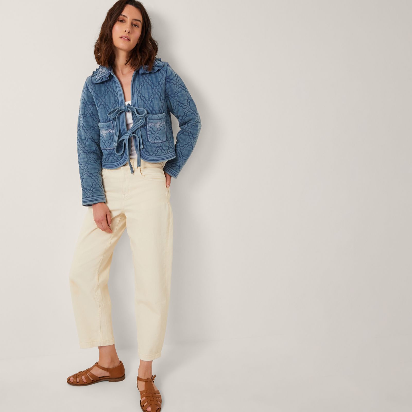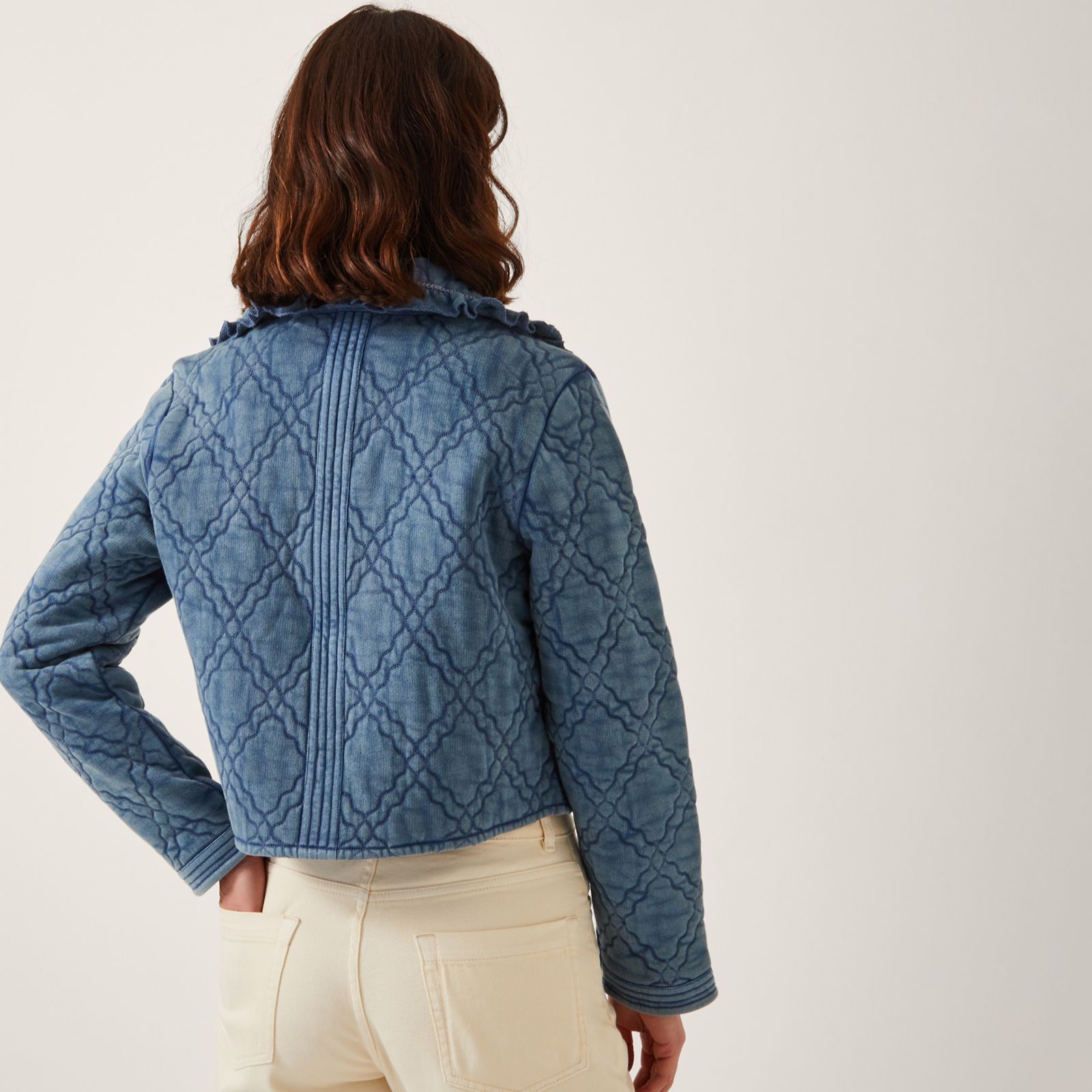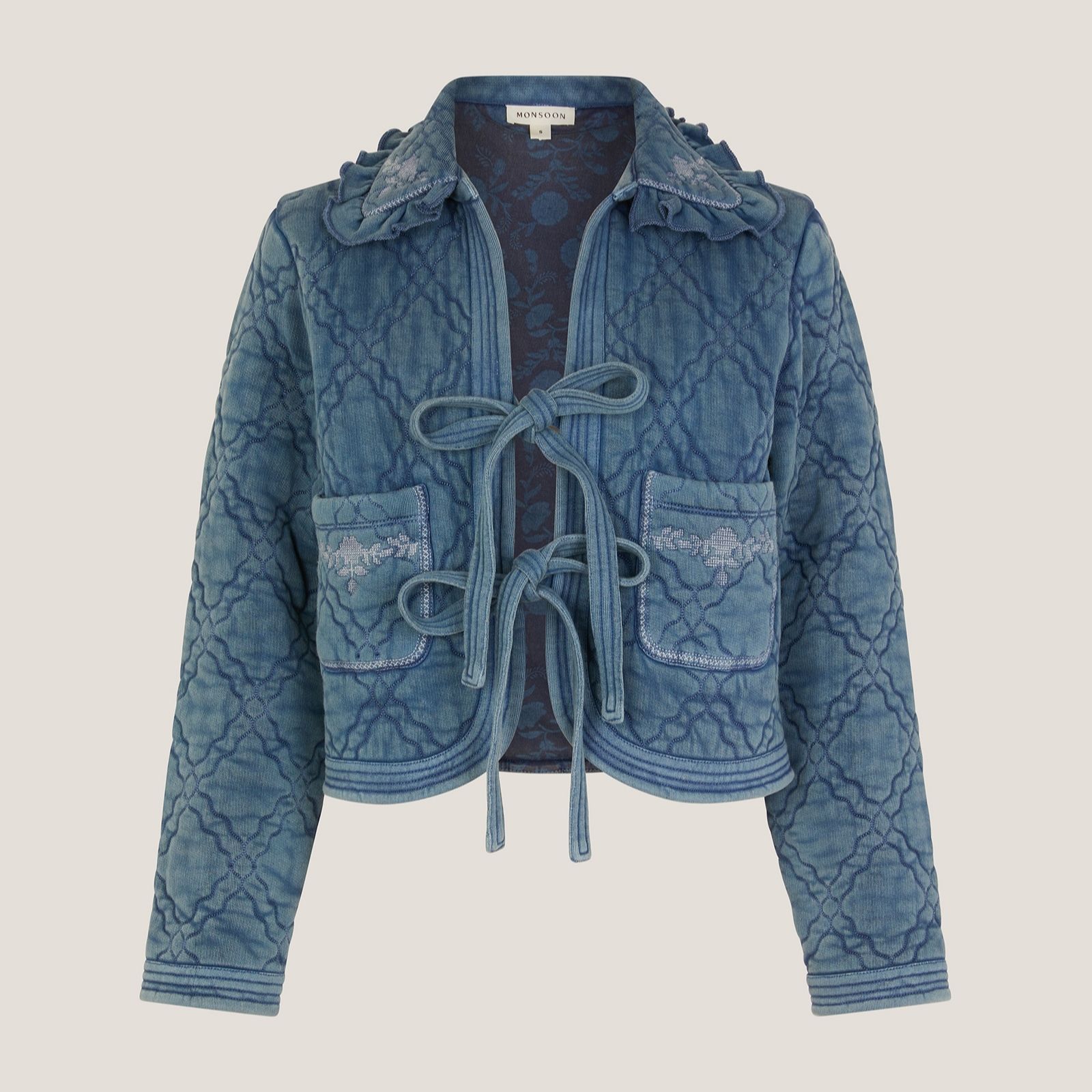 Channelling vintage charm, the Quinn quilt embroidered jacket by Monsoon brings playful detailing to your everyday style with diamond quilting and tapestry-inspired floral embroidery adorning the patch pockets. The frilly collar and tie fastenings add a whimsical touch, making it ideal for laid-back weekends or chic coffee dates. Pair it with tailored trousers or a breezy dress for effortless flair.