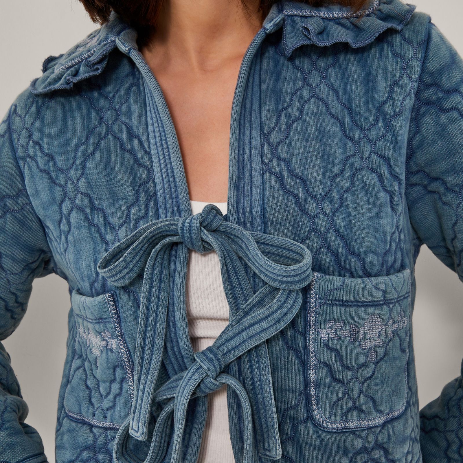- Diamond quilting and embroidered patch pockets