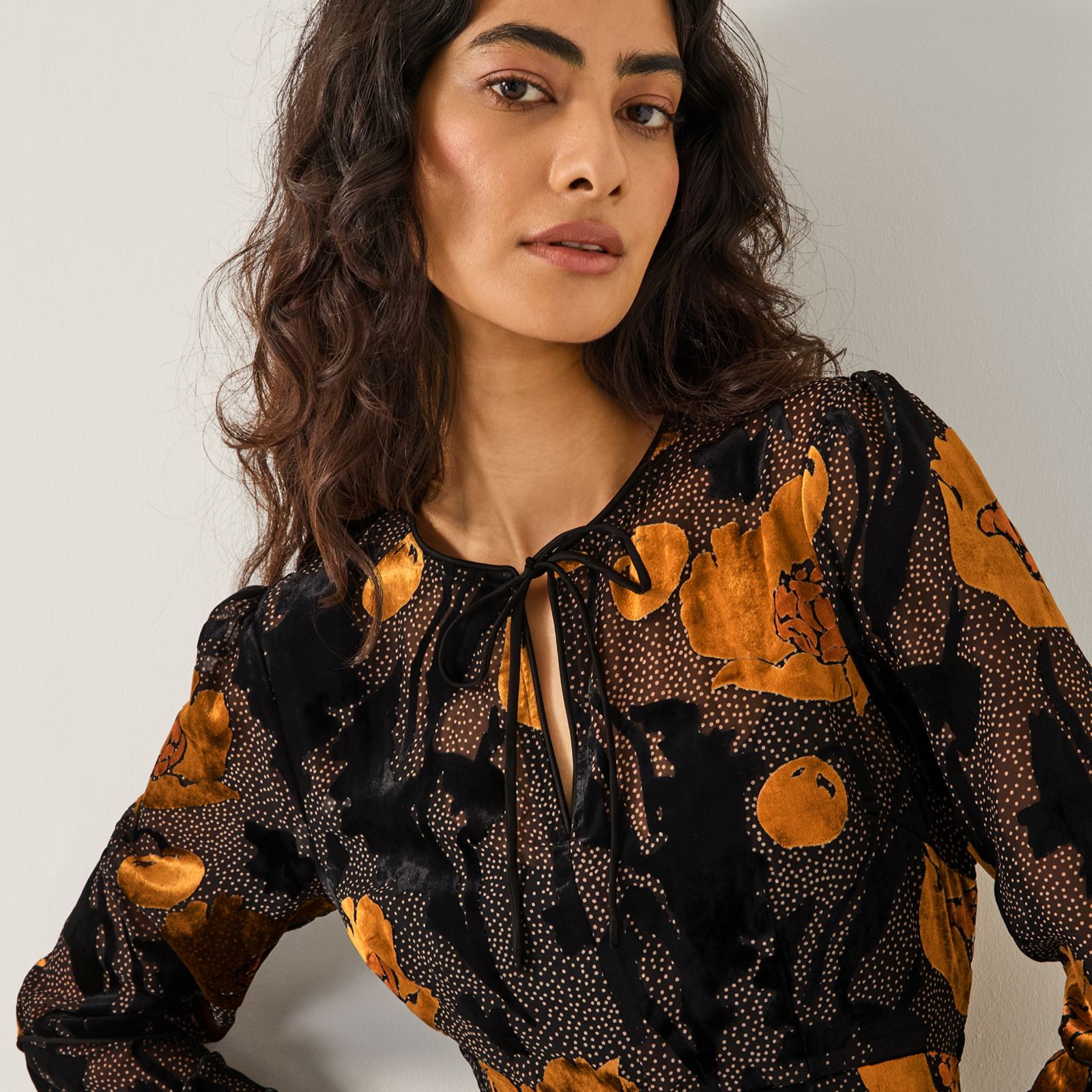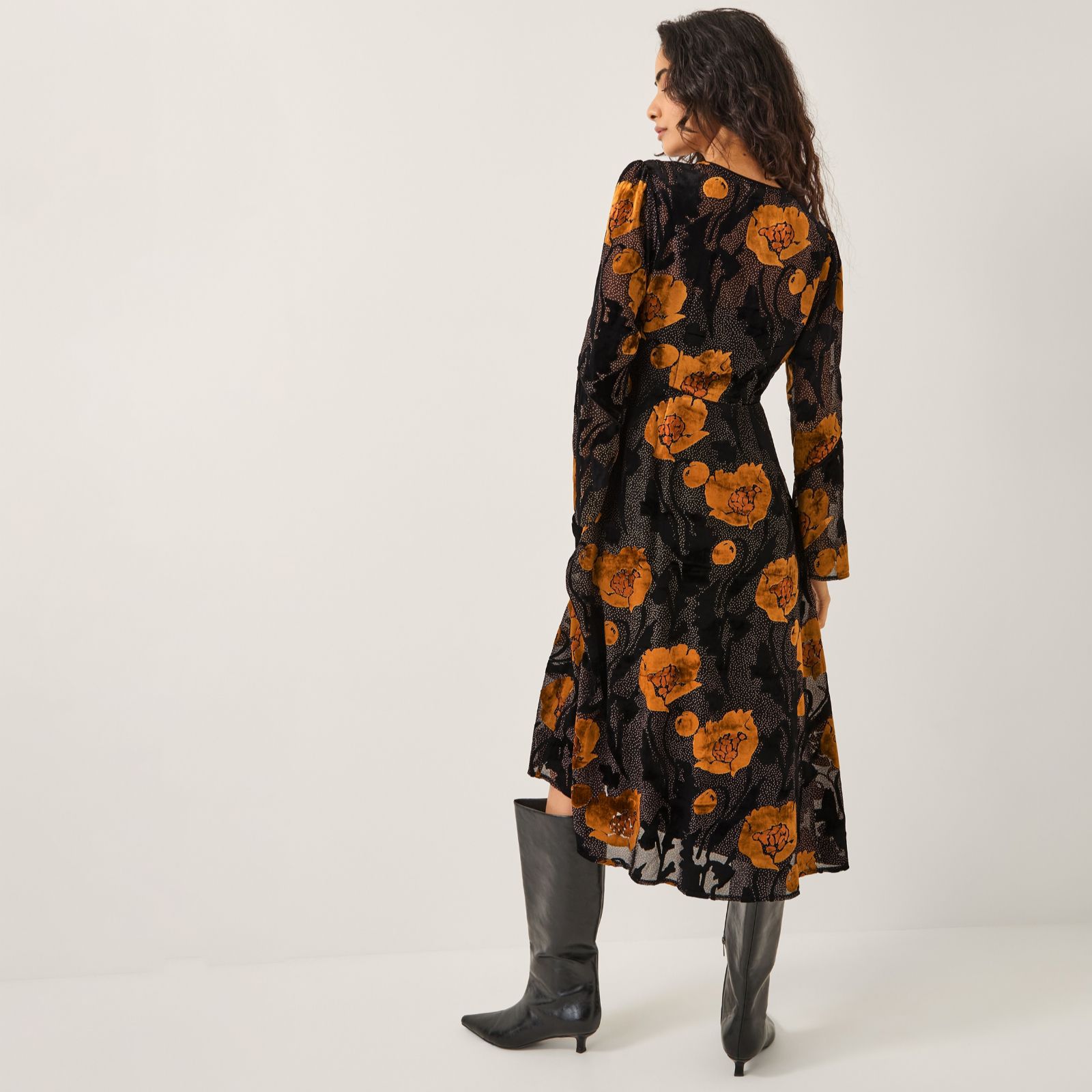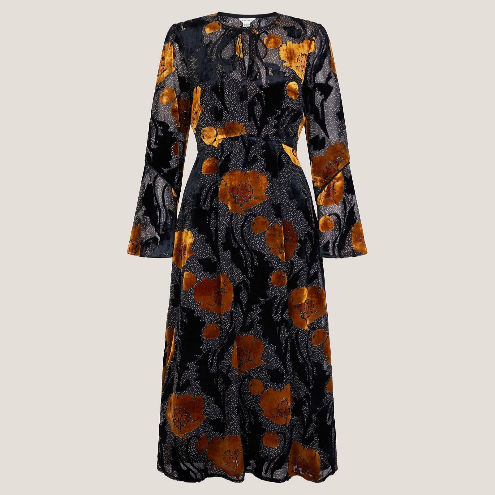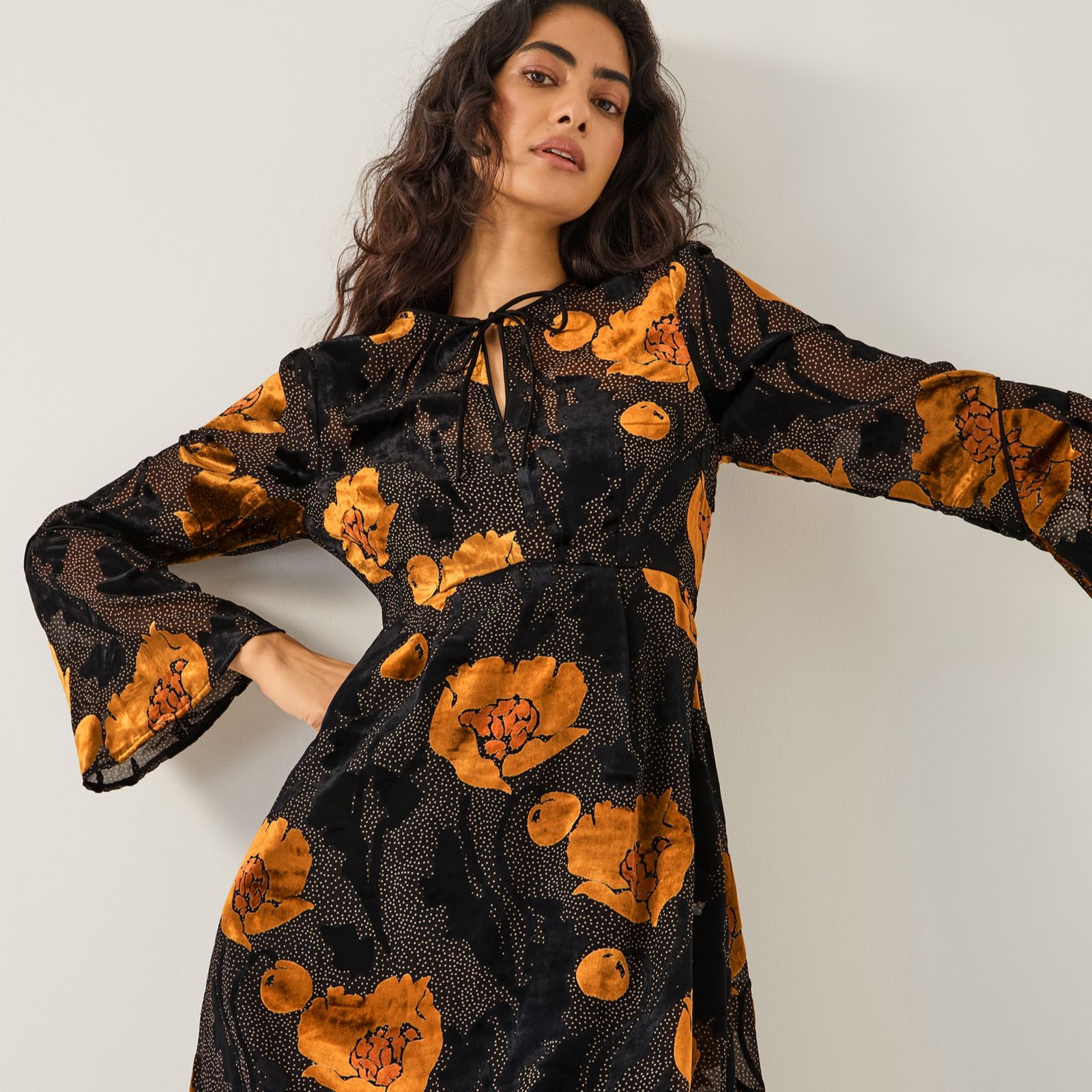 When twilight calls for something truly special, the Reese Devore midi dress from Monsoon answers with a mesmerising mix of sheer polka dots and sumptuous burnt orange velvet florals, artfully layered for a look that feels both modern and timeless. Whether youre heading to an intimate dinner, a chic cocktail party, or a festive celebration, its elegant silhouette ensures youll make a memorable entrance. Pair with gold jewellery and strappy heels for an effortlessly glamorous finish.