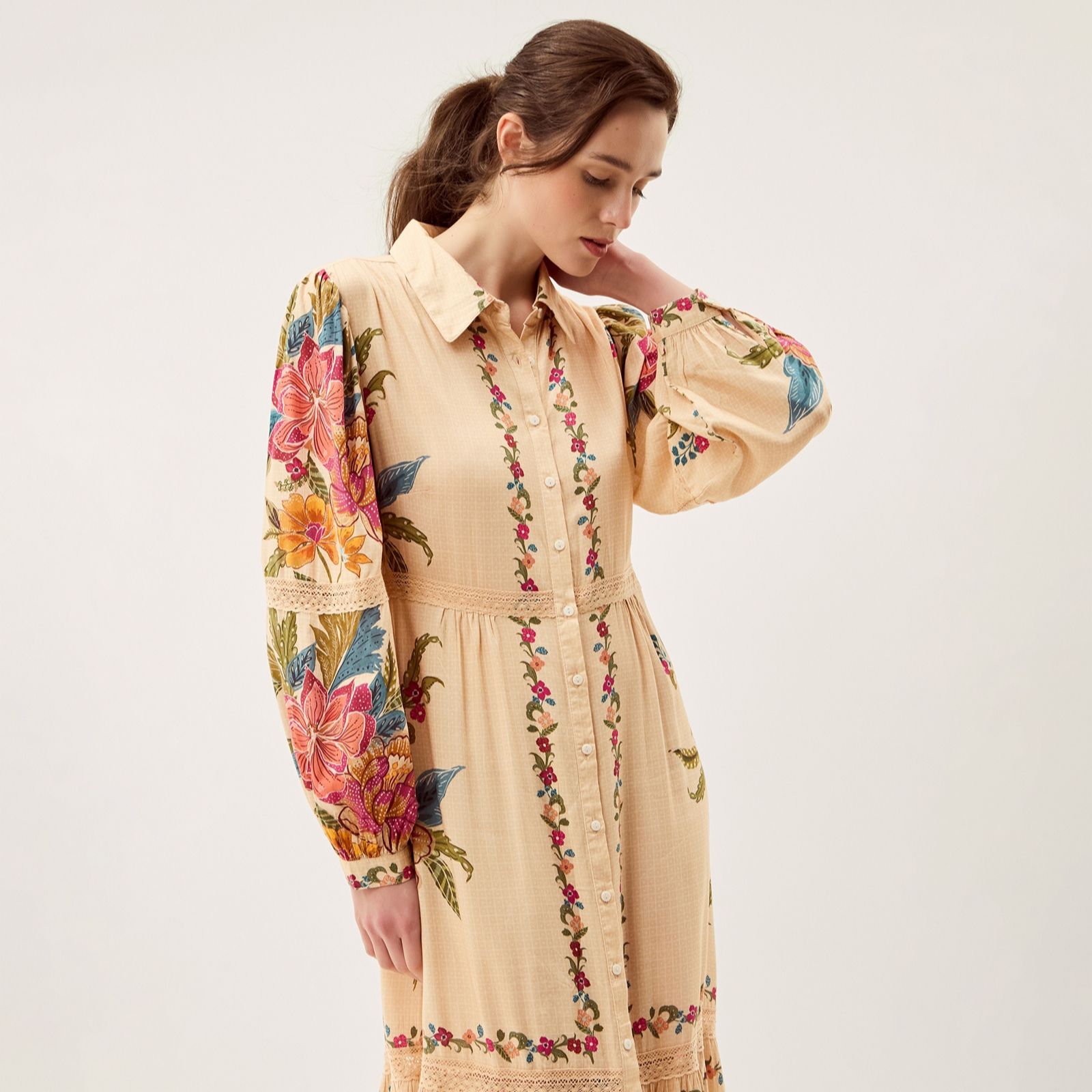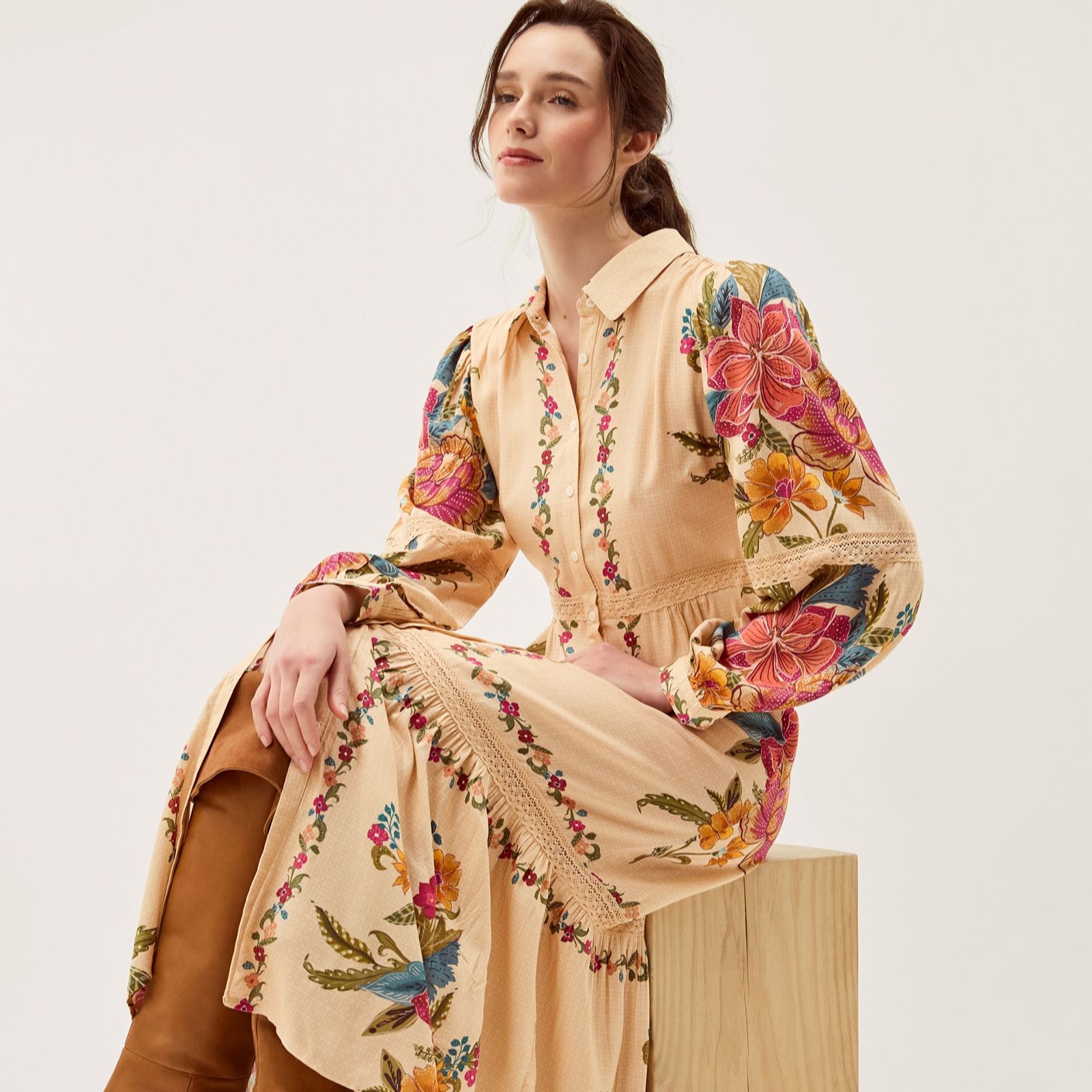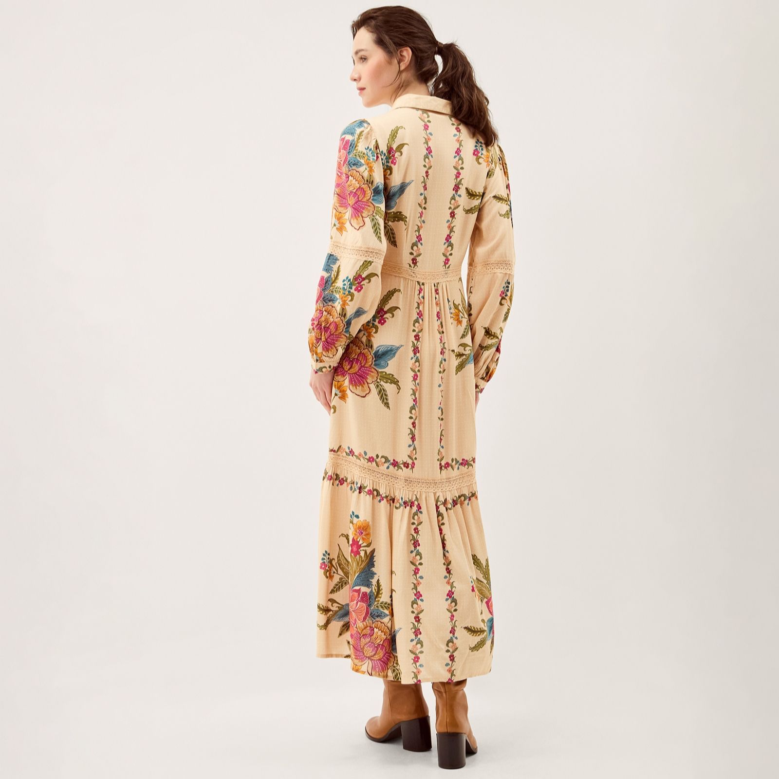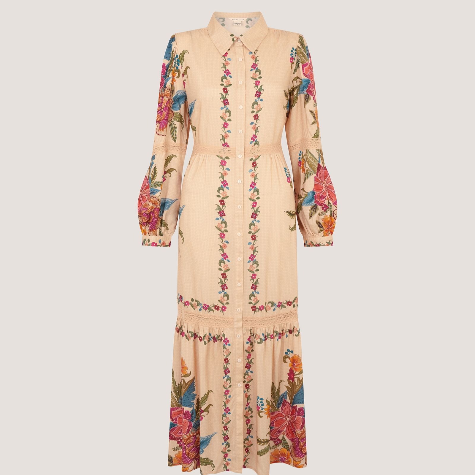 Bring a touch of artistry to your wardrobe with the Rosaleigh maxi dress from Monsoon, where tiers of decorative florals and delicate lace details create a beautifully romantic silhouette. With its smart collar and long sleeves, this dress moves effortlessly from brunch dates to special occasions. Style it with heeled boots and a crossbody bag for an elegant yet relaxed finish.