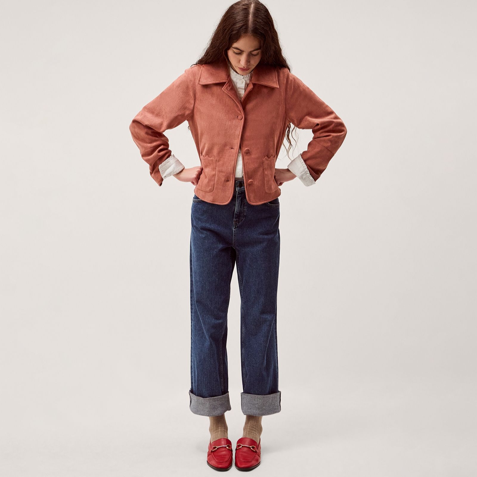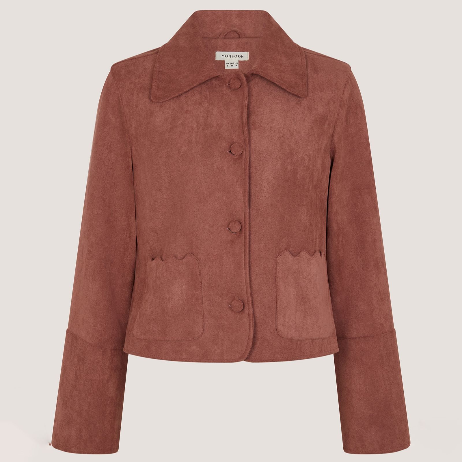 Get your style on point with the Sierra suedette jacket from Monsoon, a beautifully soft faux suede piece in a delicate blush hue. Its smart collar and scalloped pockets bring a playful twist to a polished silhouette, making it just as perfect for adding charm to your workwear as it is for elevating a weekend brunch look. Try layering it over a floral midi dress with ankle boots for an effortlessly chic ensemble.