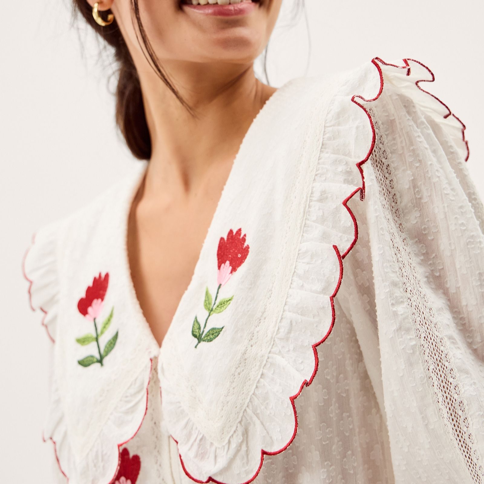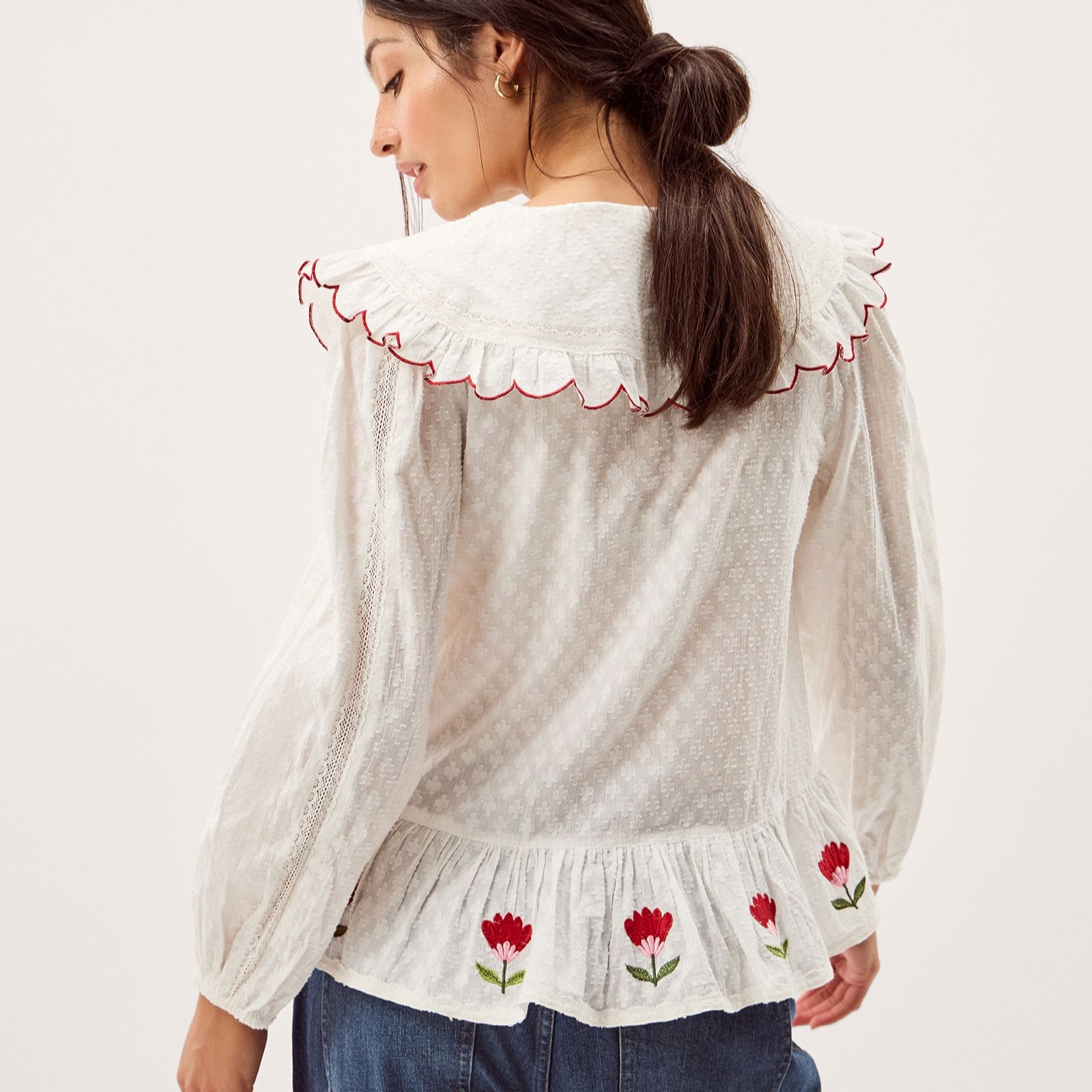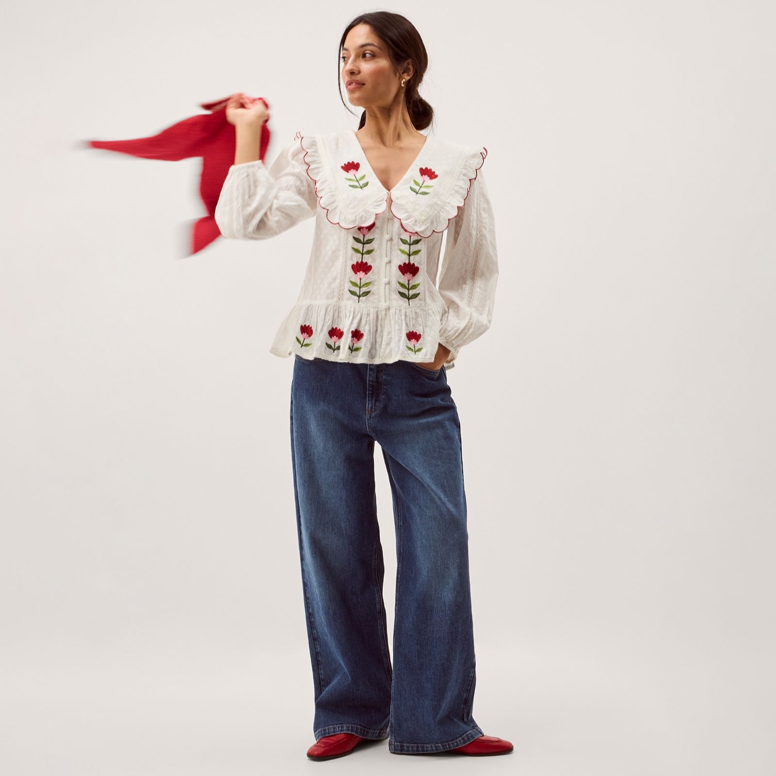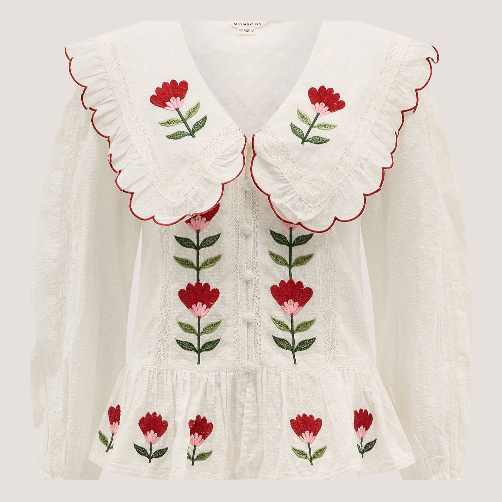 Inspired by delicate blooms, the Talia tulip embroidered top from Monsoon brings a touch of charm to your everyday style. Adorned with berry-coloured tulips and finished with a contrast scallop trim on the collar, this semi-fitted top strikes the perfect balance between elegance and ease. Ideal for coffee catch-ups or leisurely market strolls, it looks effortlessly chic when paired with tailored trousers or your favourite denim.