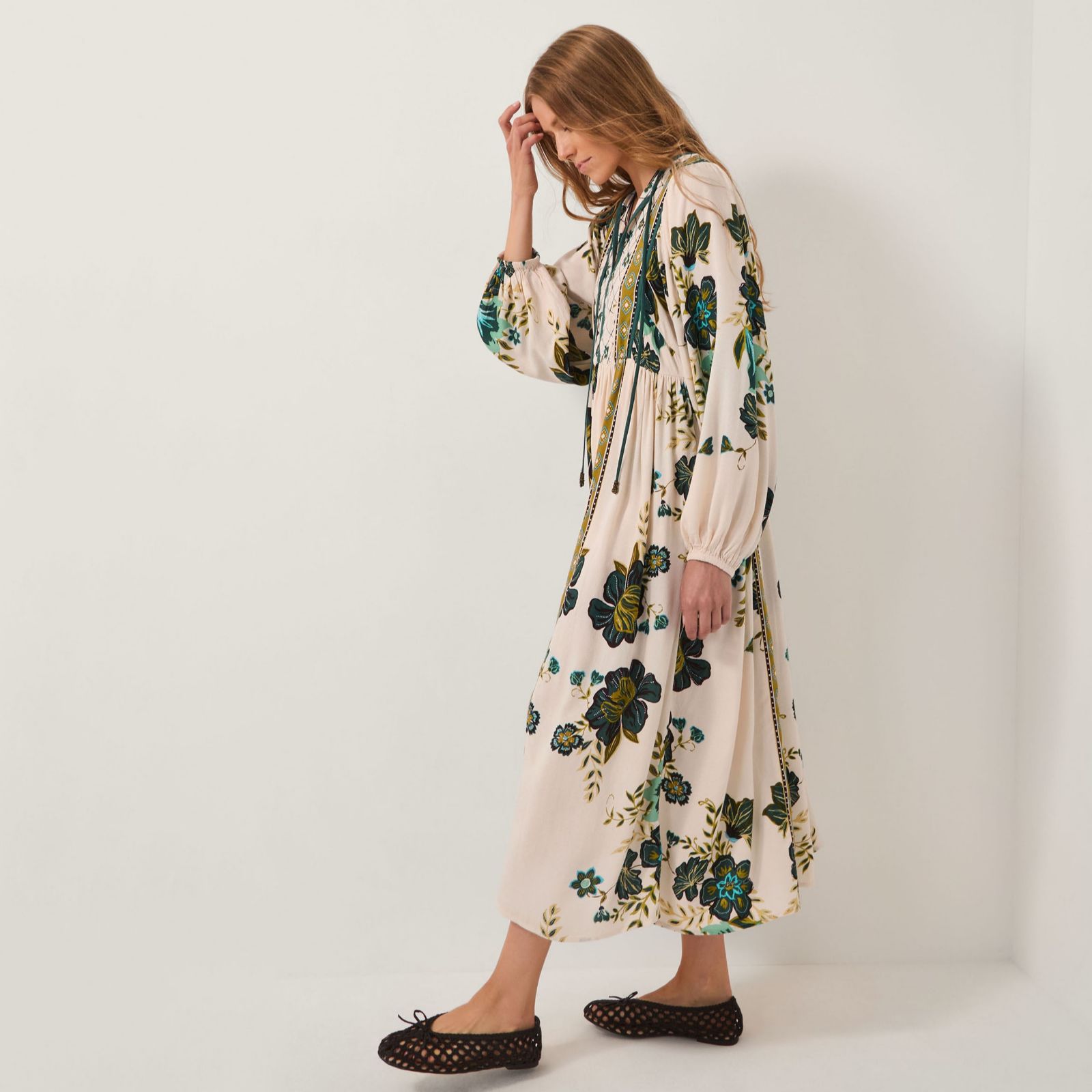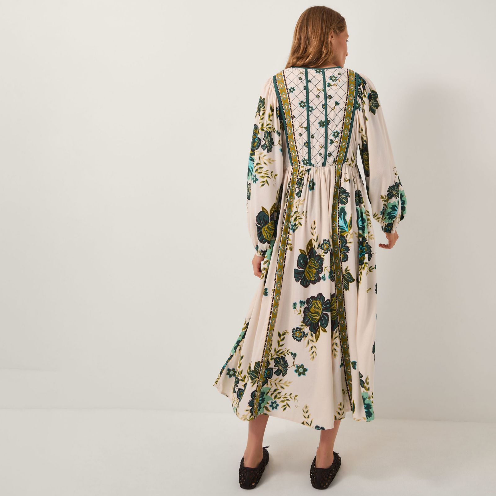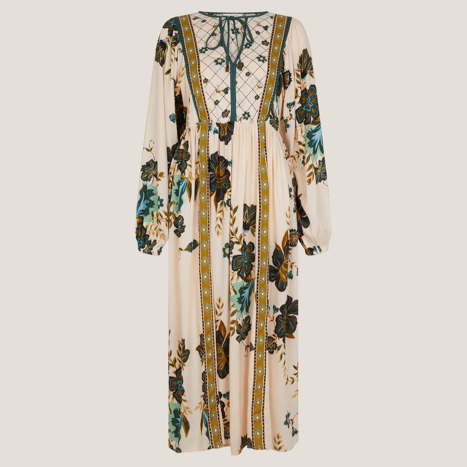 Captivate your wardrobe with the Zenya print dress from Monsoon, where flourishing floral blooms in earthy neutrals meet intricate geometric panels and delicate diamond stitching for a boho-feminine charm. Perfect for catch-ups with friends, weekend brunches or relaxed evenings, its floaty silhouette offers effortless elegance. Pair with ballerina flats and a tan cross-body bag for a chic, laid-back look.
