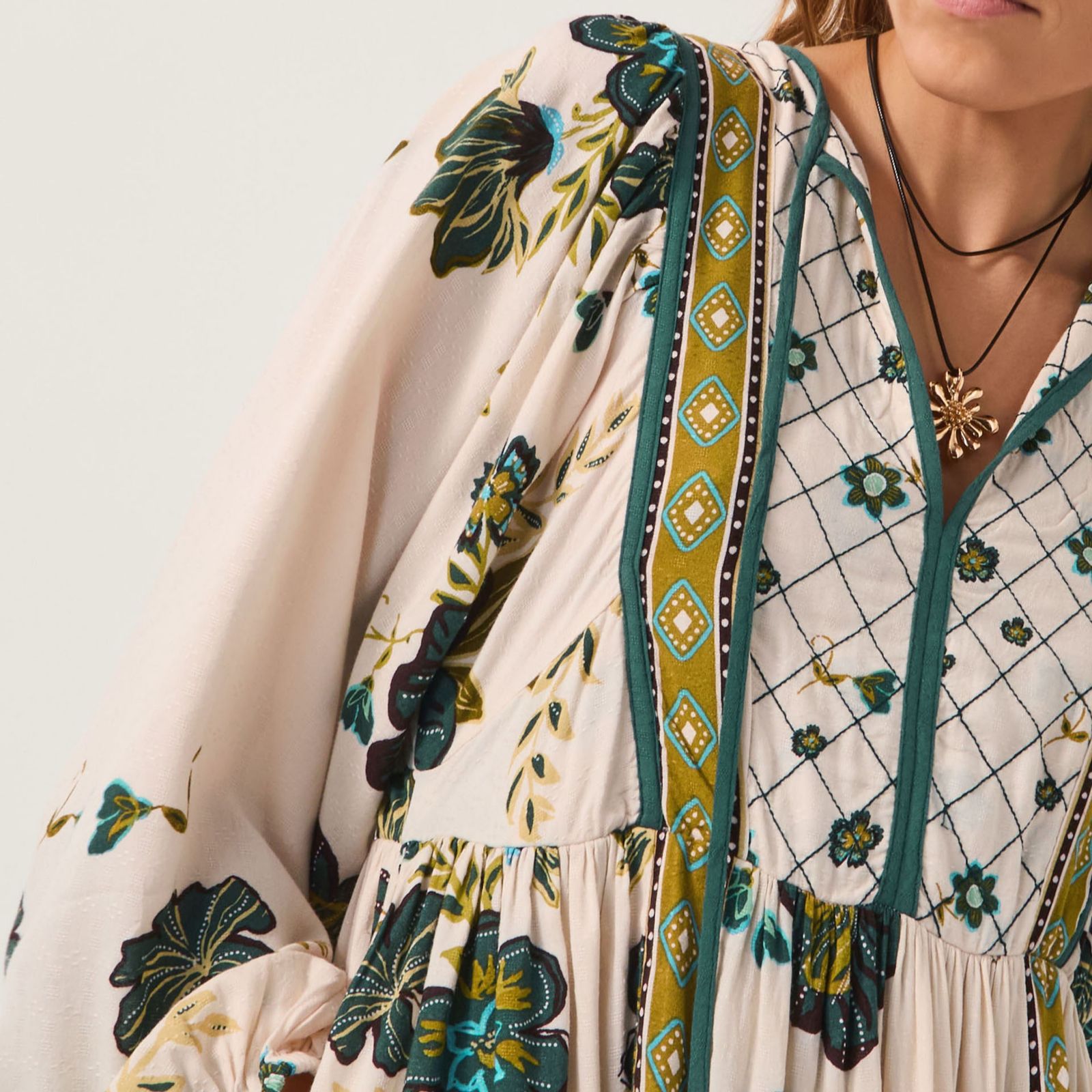 • Teal tie-fastening as the neckline