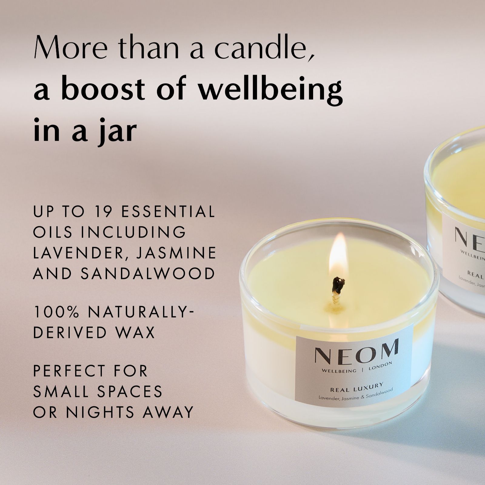 - 1 x Real Luxury Travel Candle (75g) - from NEOM Wellbeing's Scent to De-Stress range, a calming combination of 24 essential oils including lavender, jasmine and Brazilian rosewood, expertly blended to help you relax and unwind. This candle has been hand-poured in the UK using 100% natural wax and is designed to burn cleanly, slowly and evenly as it fills your room with fragrance. Encased in an elegant glass holder and presented in stunning packaging, this candle provides up to 20 hours burn time