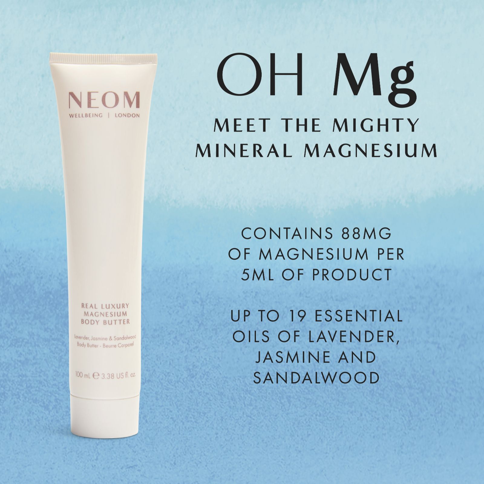- 1 x Real Luxury Magnesium Body Butter (100ml) - size currently only available at QVC. From NEOM Wellbeing's Scent to De-Stress range, a calming combination of 24 essential oils including lavender, jasmine and Brazilian rosewood, expertly blended to help you relax and unwind. A wonderfully whippy formula that has been blended with magnesium and is designed to leave your skin feeling super soft and hydrated. Blended with shea butter, grapeseed oil and coconut oil