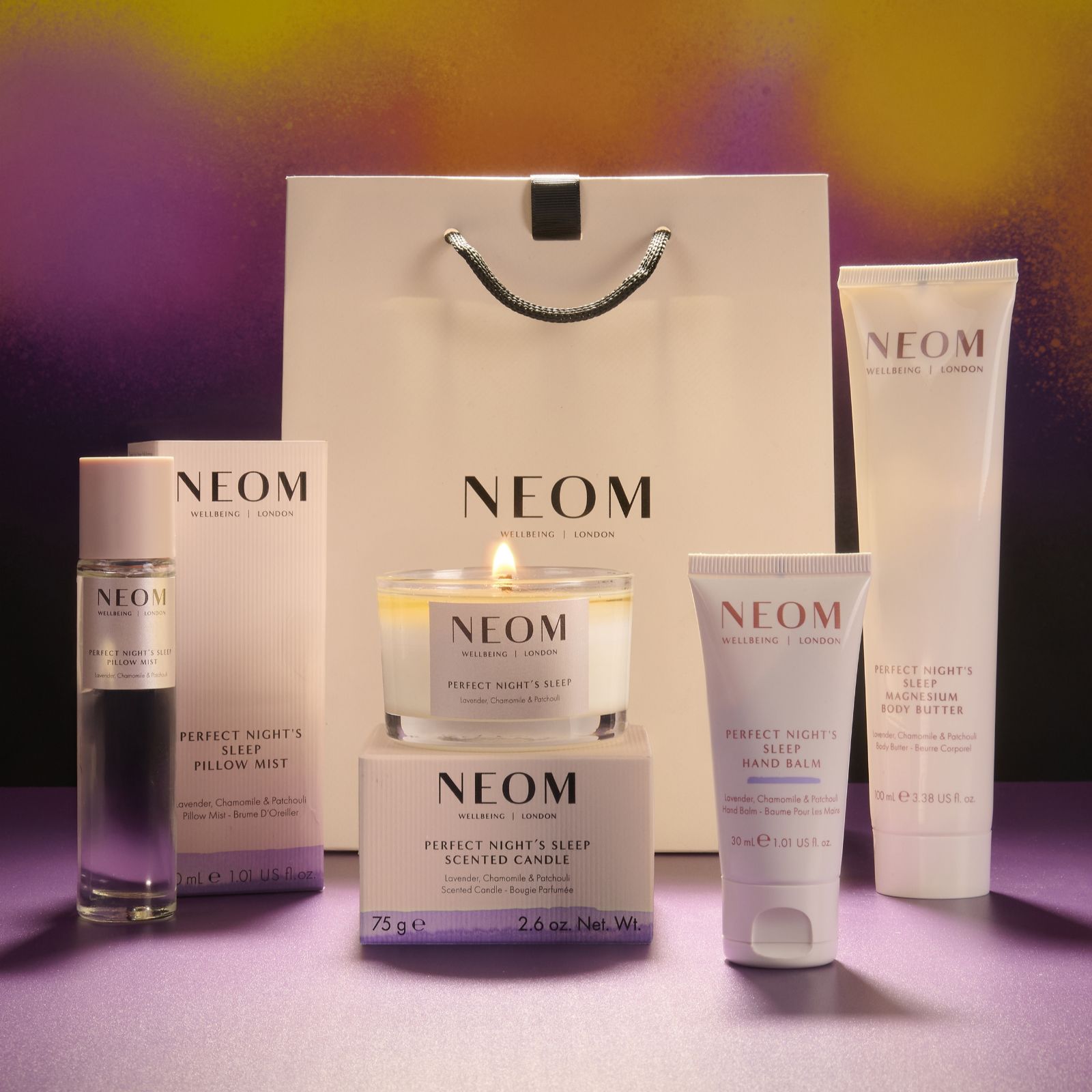 - 1 x Perfect Night's Sleep Magnesium Body Butter (100ml) - size currently only available at QVC. From NEOM Wellbeing's Scent to Sleep range, a dreamy combination of 19 essential oils including English lavender, jasmine and sweet basil, expertly blended to help you relax and prepare for sleep. A wonderfully whippy formula that has been blended with magnesium and is designed to leave your skin feeling super soft and hydrated. Blended with shea butter, grapeseed oil and coconut oil