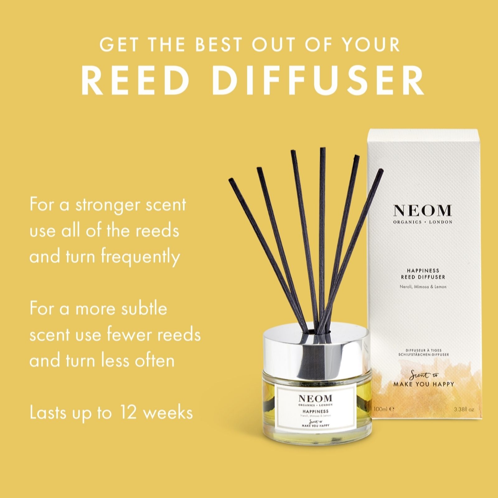 - 1 x Happiness Reed Diffuser (100ml) - a sophisticated glass bottle full of beautiful fragrance, which is soaked up by the reeds and diffused into the atmosphere. From Neom's Scent to Make You Happy range, a feel-good combination of seven essential oils including white neroli, woody and powdery mimosa and zingy lemon, purposefully blended to help you feel more positive