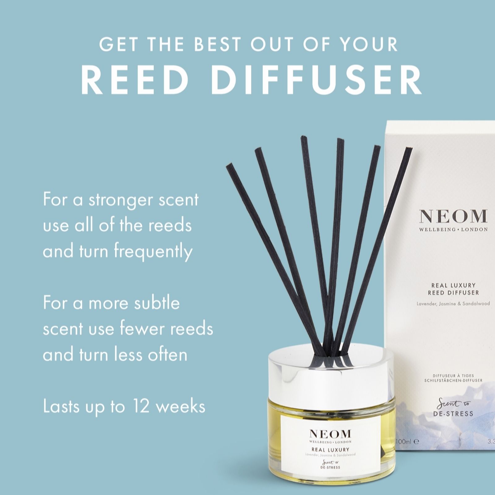 - For a stronger scent use all of the reeds and turn daily, for a more subtle scent use fewer reeds and turn less often