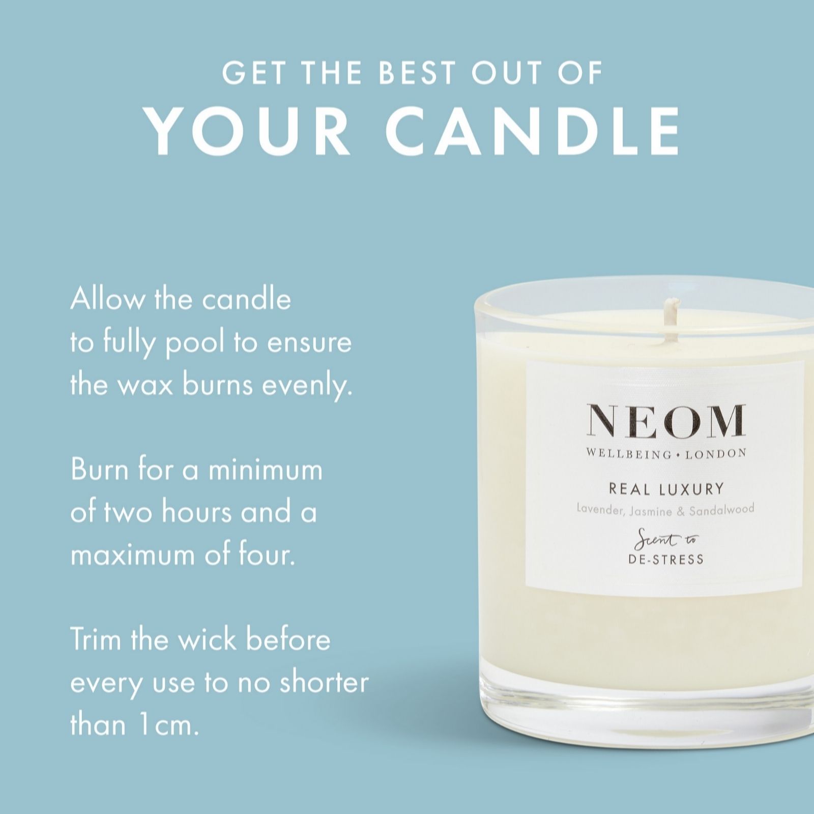 - 1 x Real Luxury One-Wick Candle (185g) - hand-poured in the UK using 100% natural wax and designed to burn cleanly, slowly and evenly as it fills your room with fragrance. Encased in an elegant glass holder and presented in stunning packaging, this candle provides up to 35 hours burn time. From Neom Wellbeing's Scent to De-Stress range, this candle also contains a calming combination of 24 essential oils including lavender, jasmine and Brazilian rosewood, expertly blended to help you relax and unwind