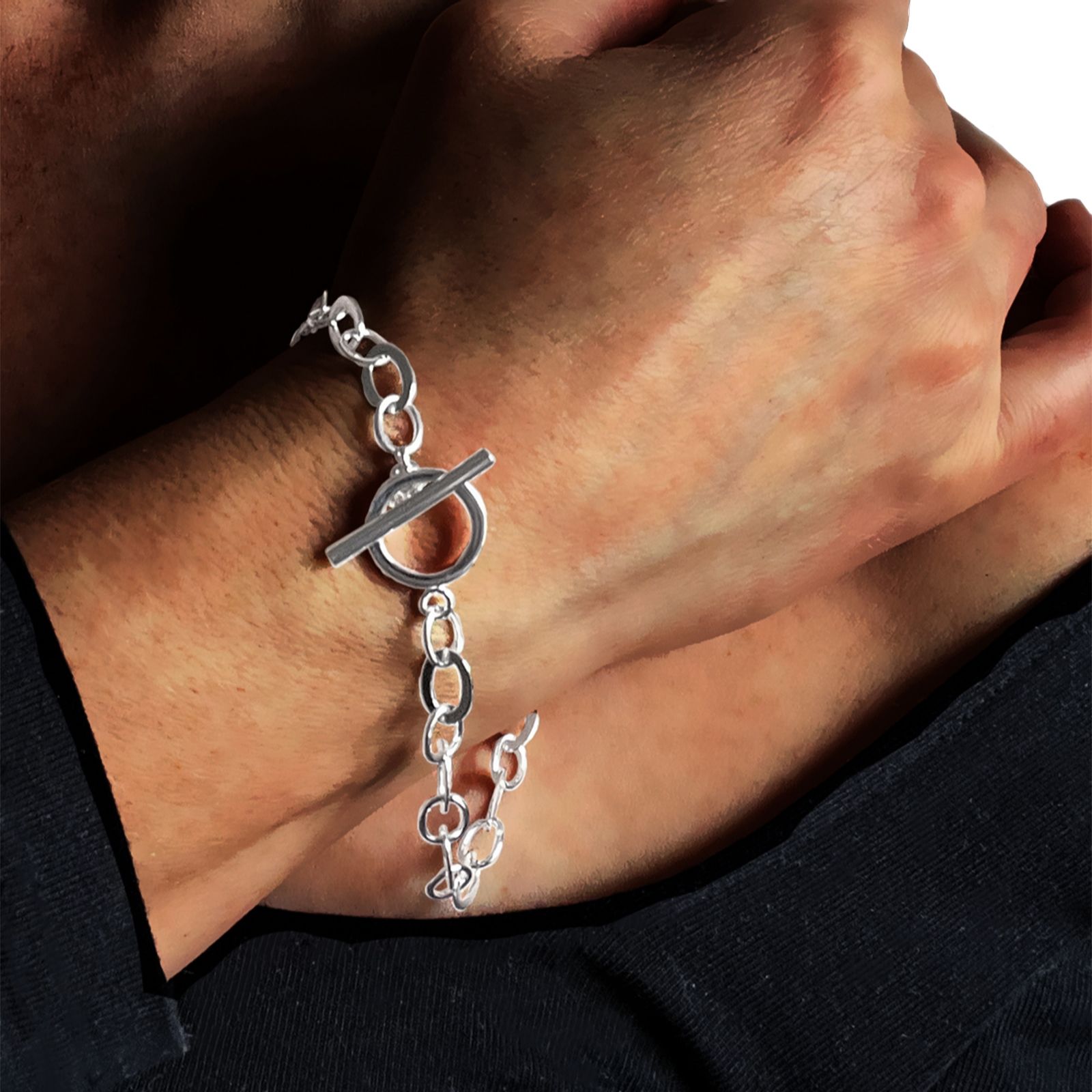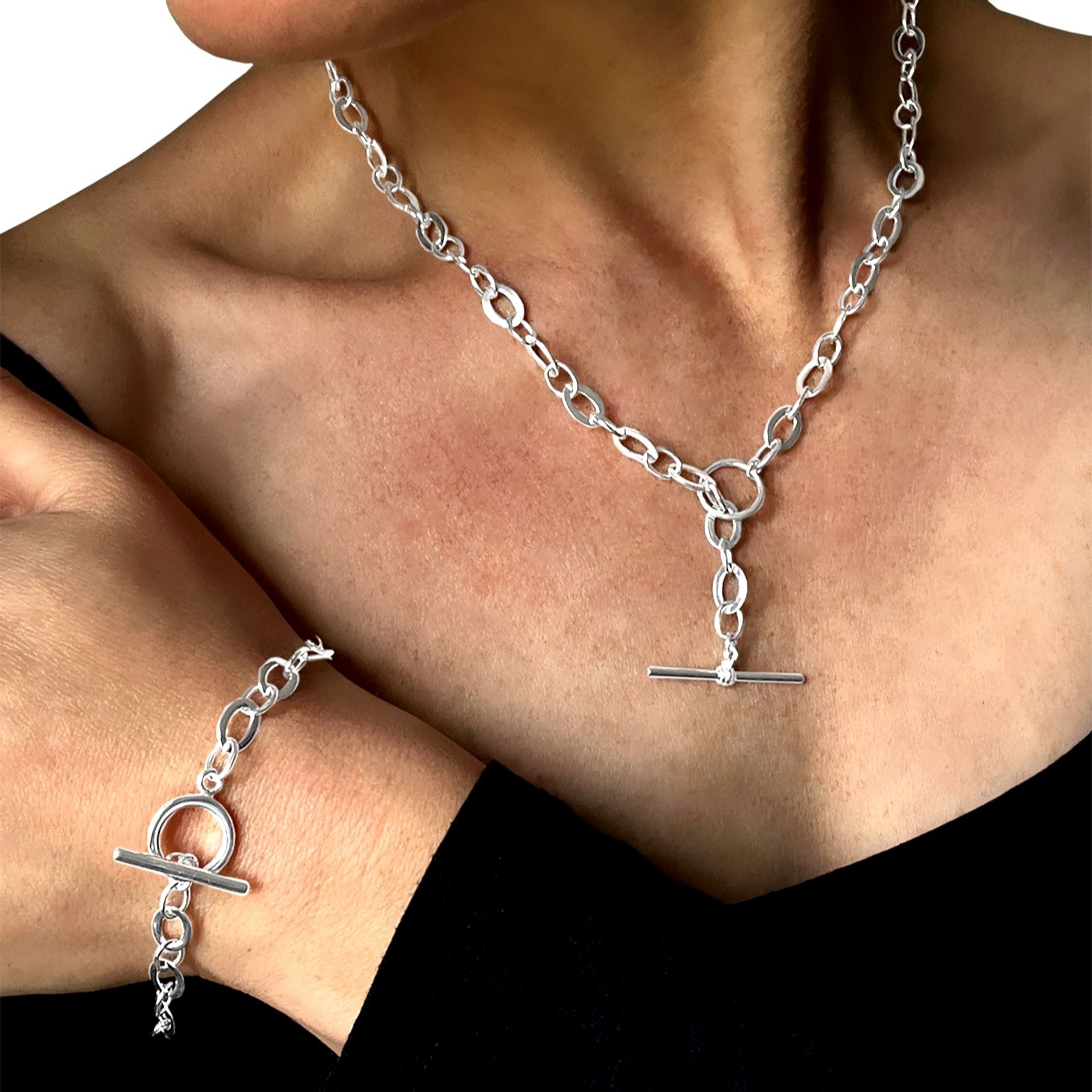 Indulge in a classic piece with contemporary flair in this oval link chain T-bar bracelet from Nina B. Expertly crafted from solid sterling silver, its striking links and signature T-bar closure bring a modern touch to your wrist, making it a versatile accessory that can be worn solo or stacked with your favourite bangles for effortless style.