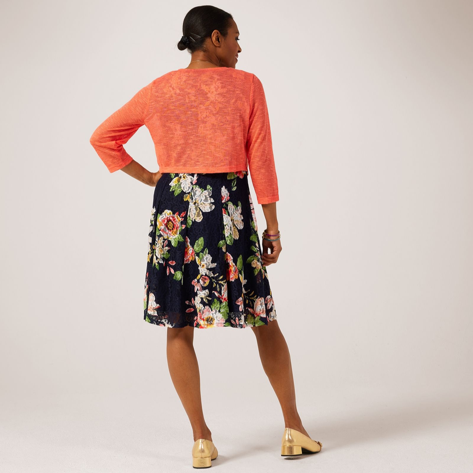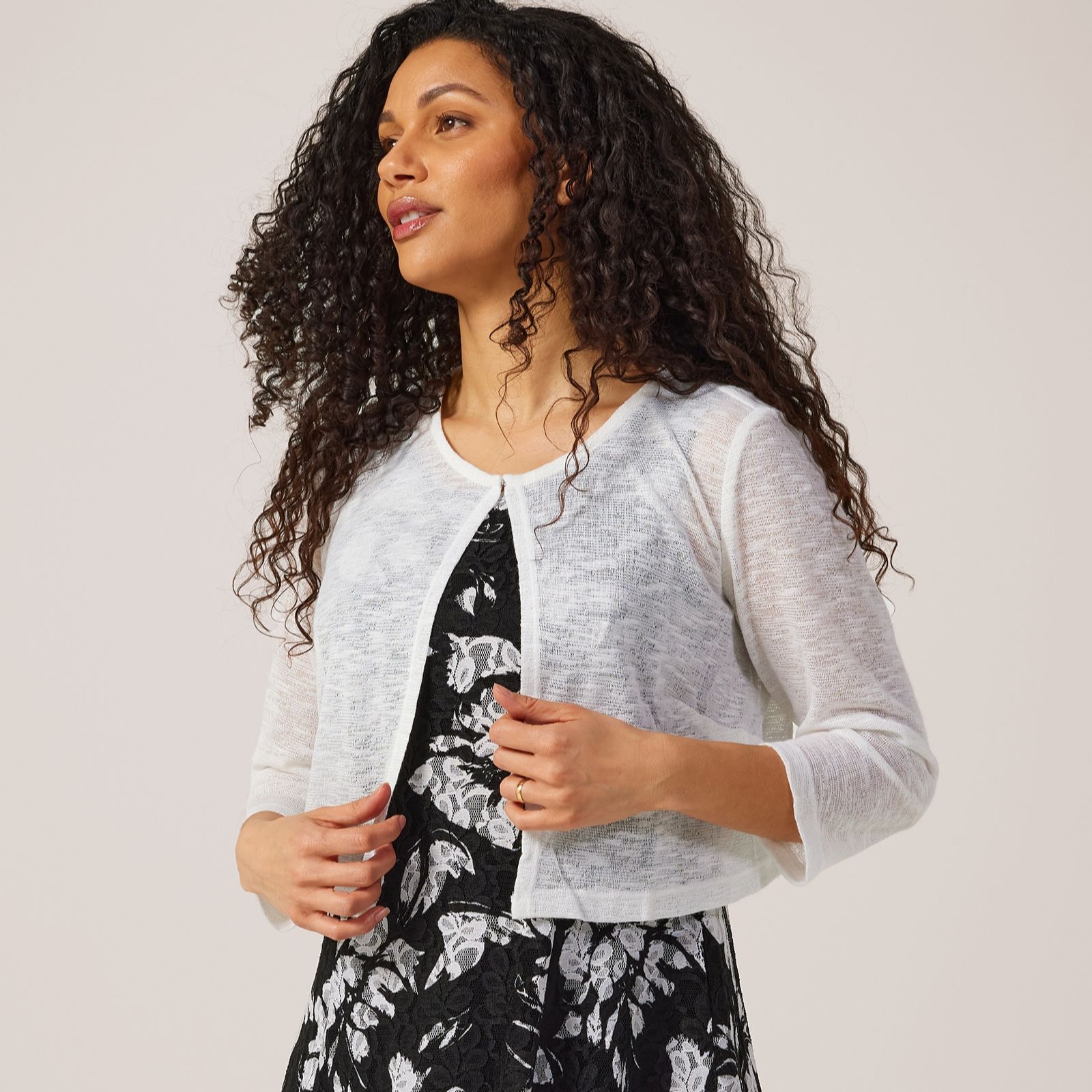 Embrace effortless sophistication with the Nina Leonard two-piece Printed Lace Dress with 3/4 Sleeve Bolero. This knee-length A-line dress, designed with a scoop neck and a fully lined body, offers a semi-fitted silhouette thats perfect for various occasions. The accompanying waist-length bolero, featuring a round neck and 3/4 sleeves with a hook and eye closure, adds a touch of elegance and versatility. Pair this chic ensemble with your favourite heels for an elevated look, ideal for both daytime outings and evening events.