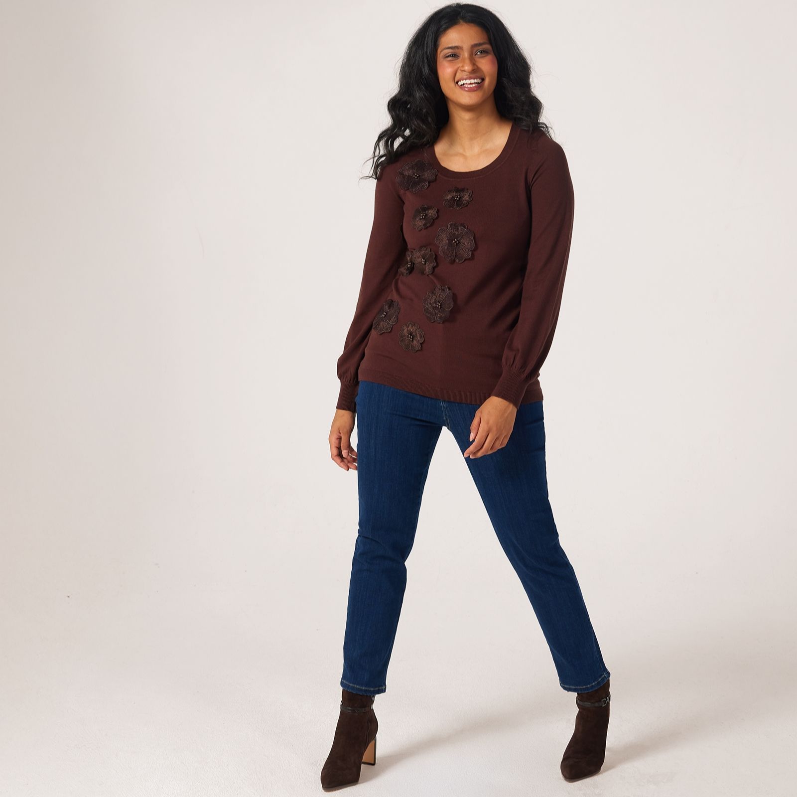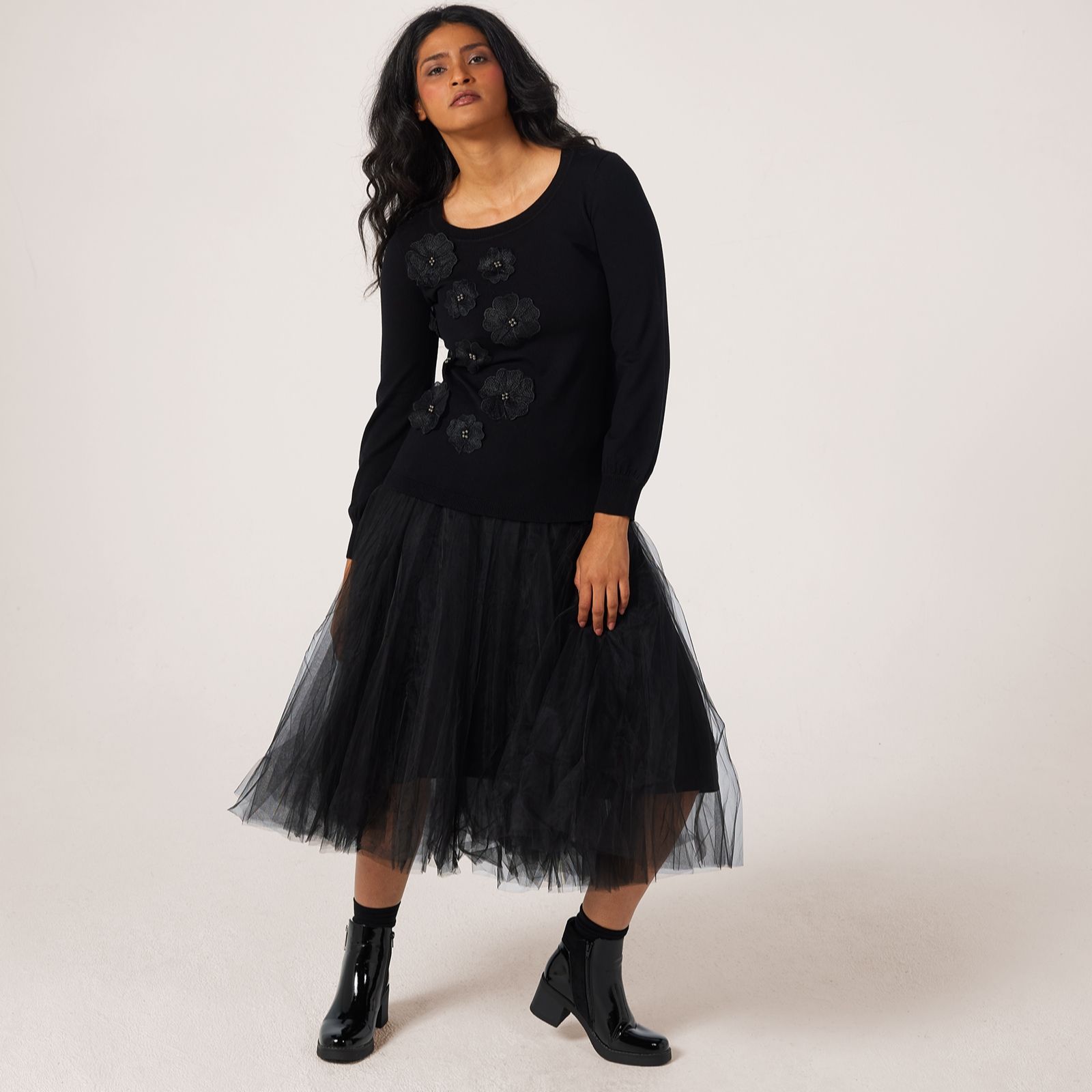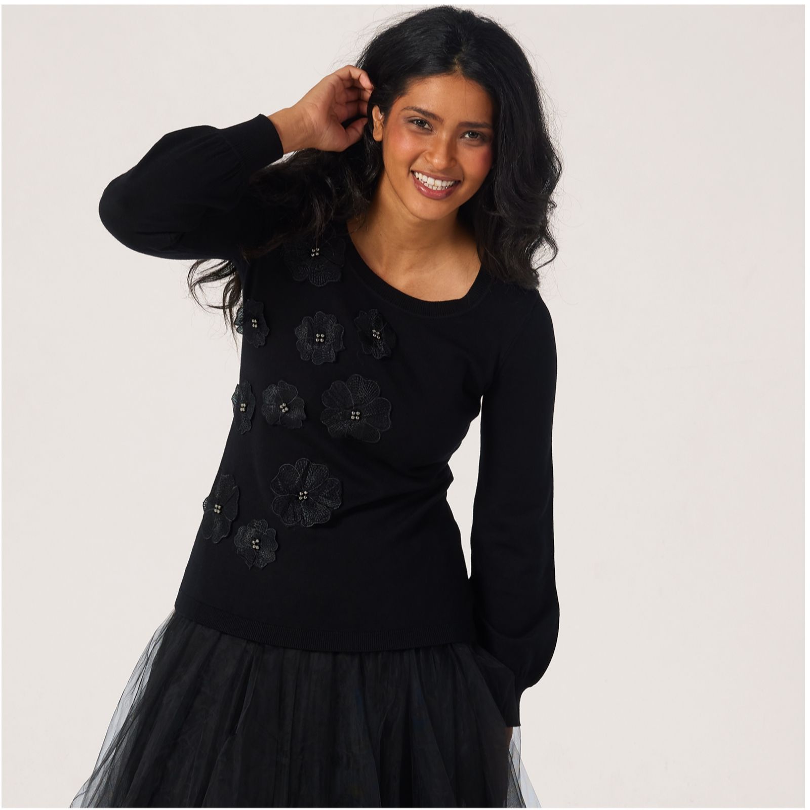 Bring a touch of playful romance to your wardrobe with this balloon sleeve jumper from Nina Leonard, where whimsical 3D floral applique blooms along the front for a standout look. Perfect for everything from weekend brunches to evenings out, this semi-fitted pullover offers both comfort and style. Try pairing it with tailored trousers or a flowing skirt for a chic, modern ensemble.