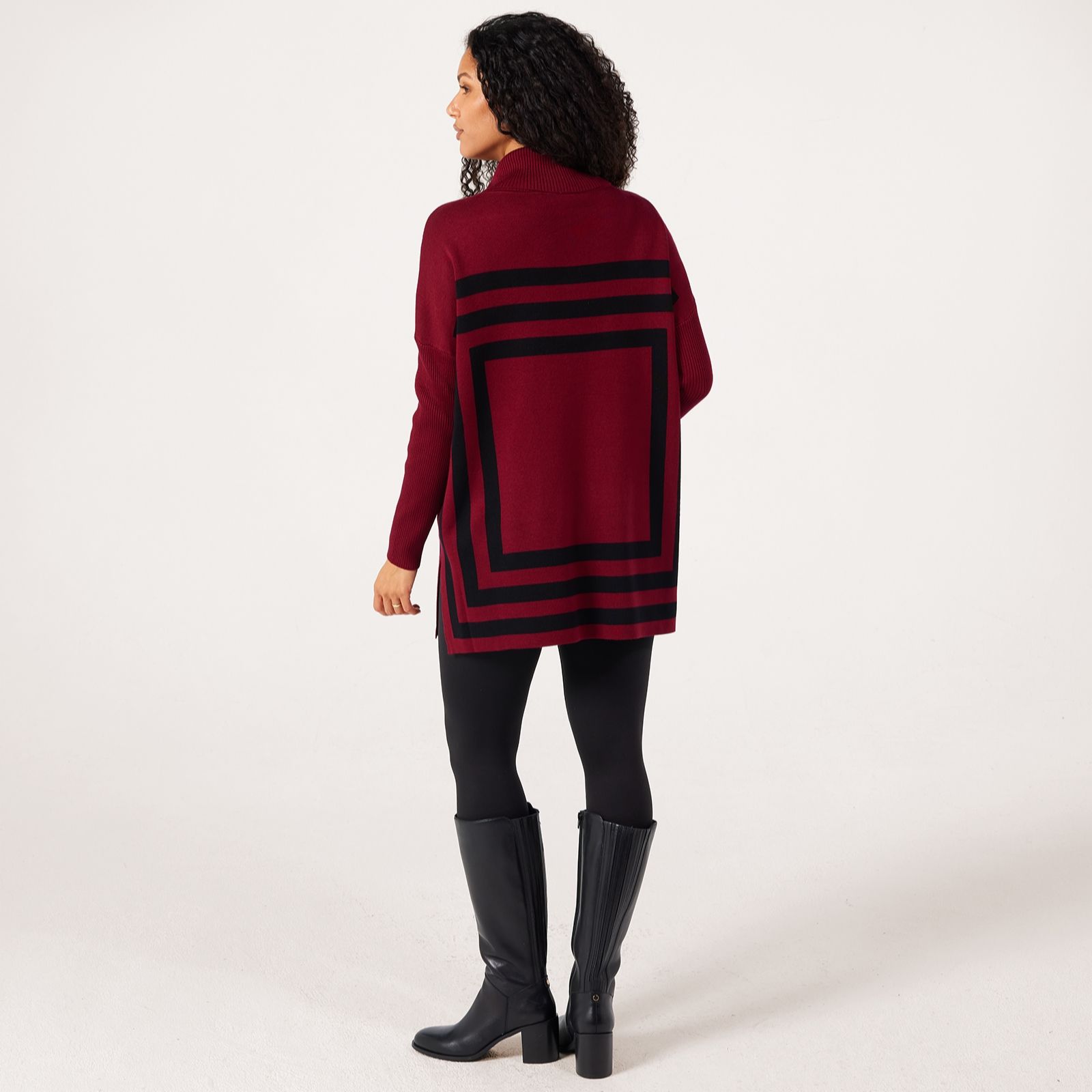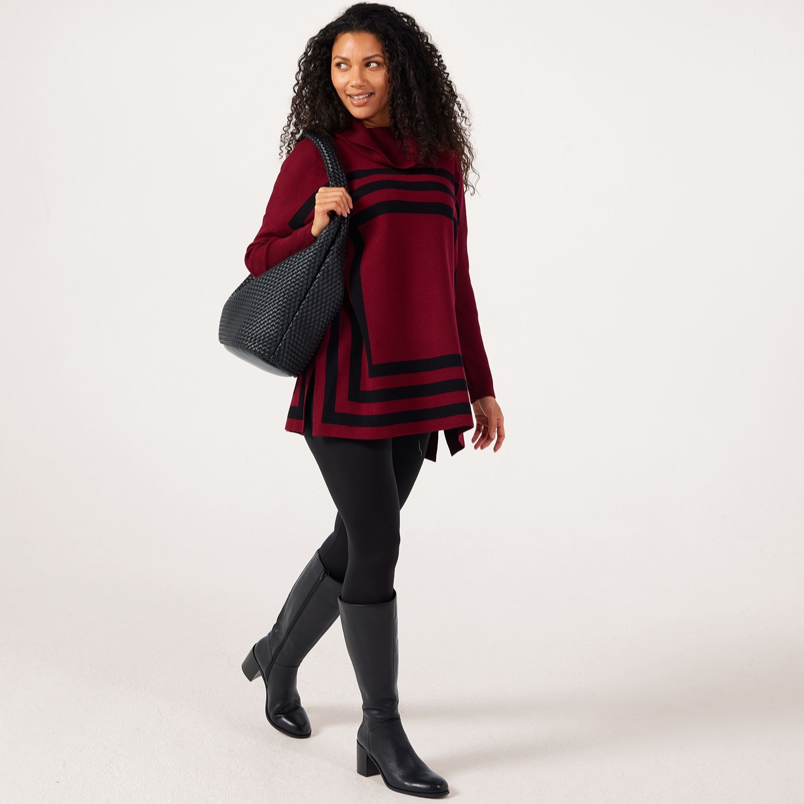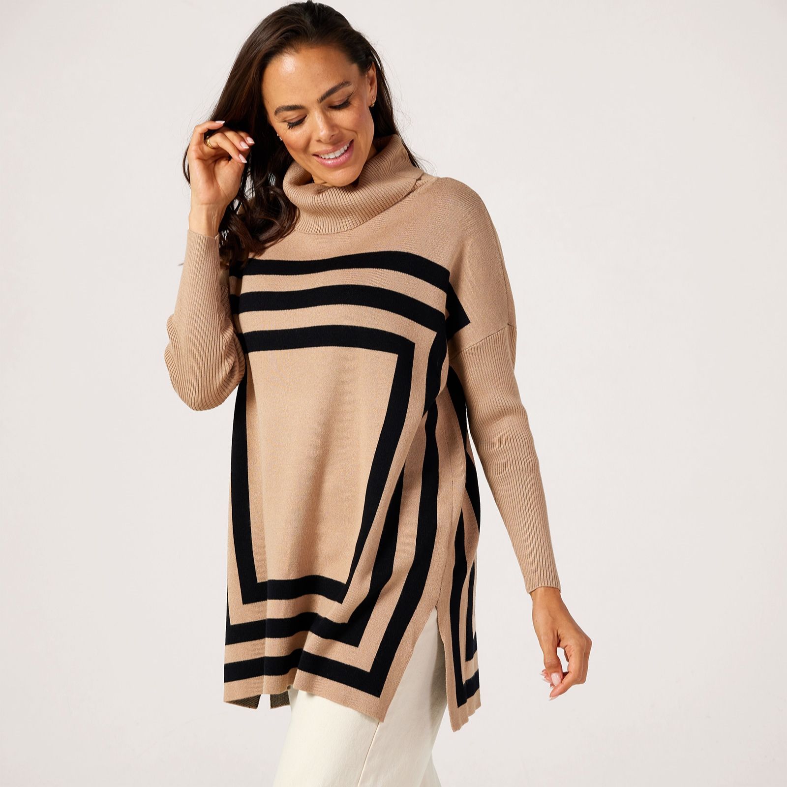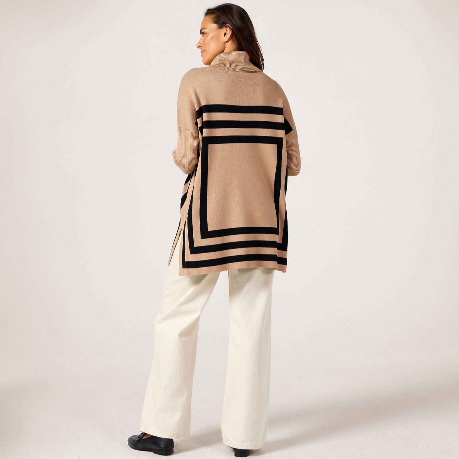 Indulge in effortless style with this cowl neck boxy knit jumper from Nina Leonard, designed with relaxed dropped shoulders and a striking jacquard 'box' pattern front and back. The side slits and loose fit make this jumper an easy choice for layering over your favourite jeans or leggings, perfect for cosy weekends, workdays or casual outings. Finish your look with ankle boots for a chic, modern look.