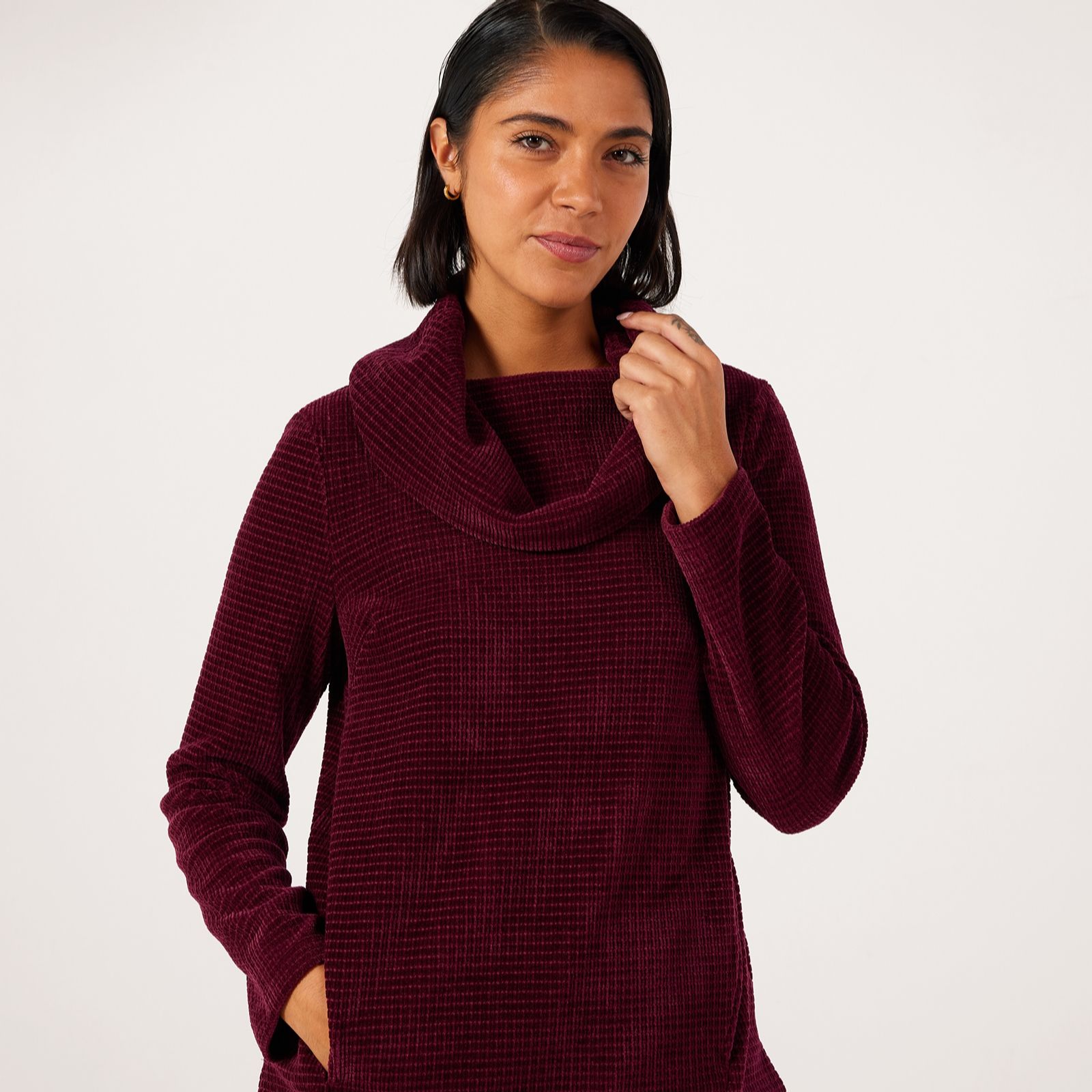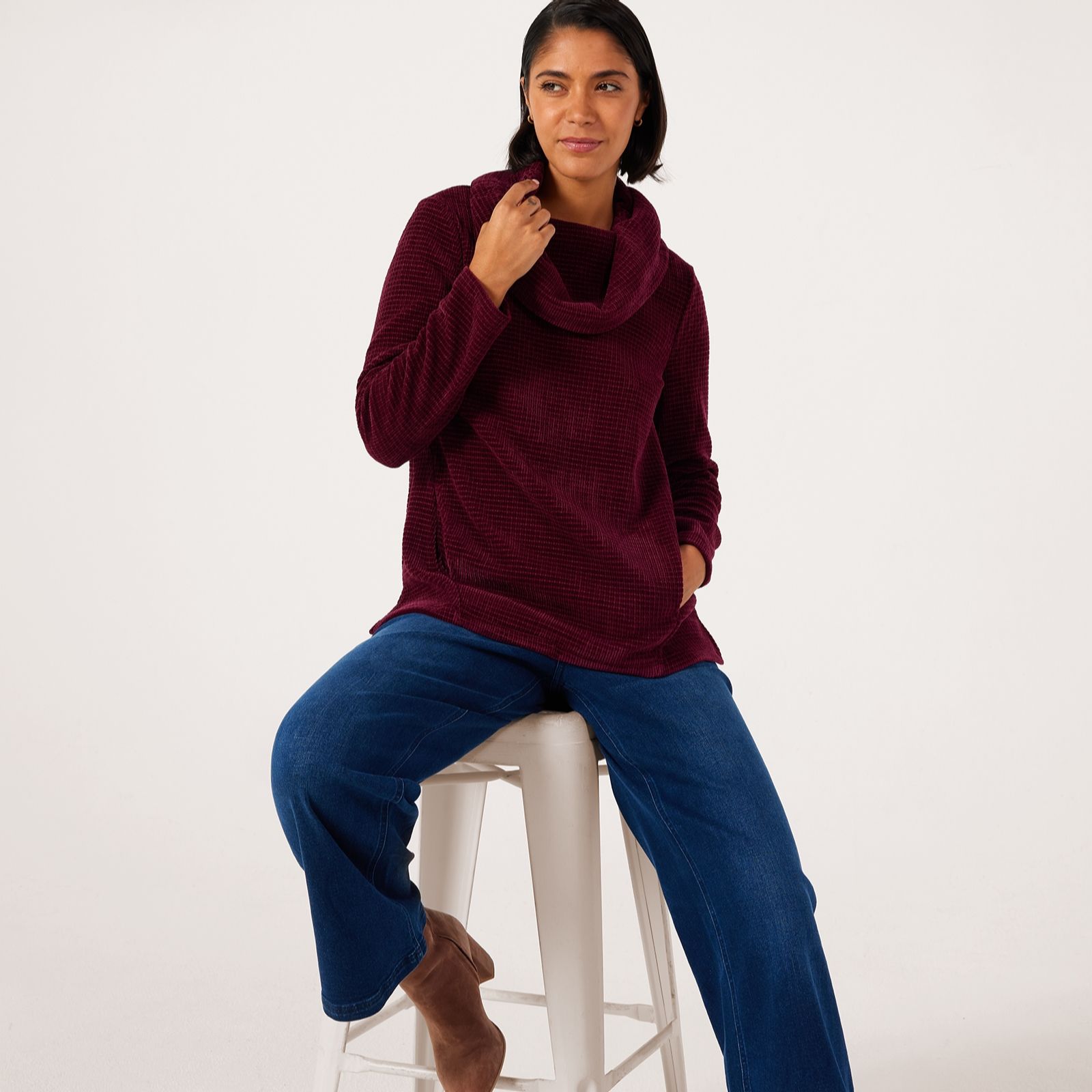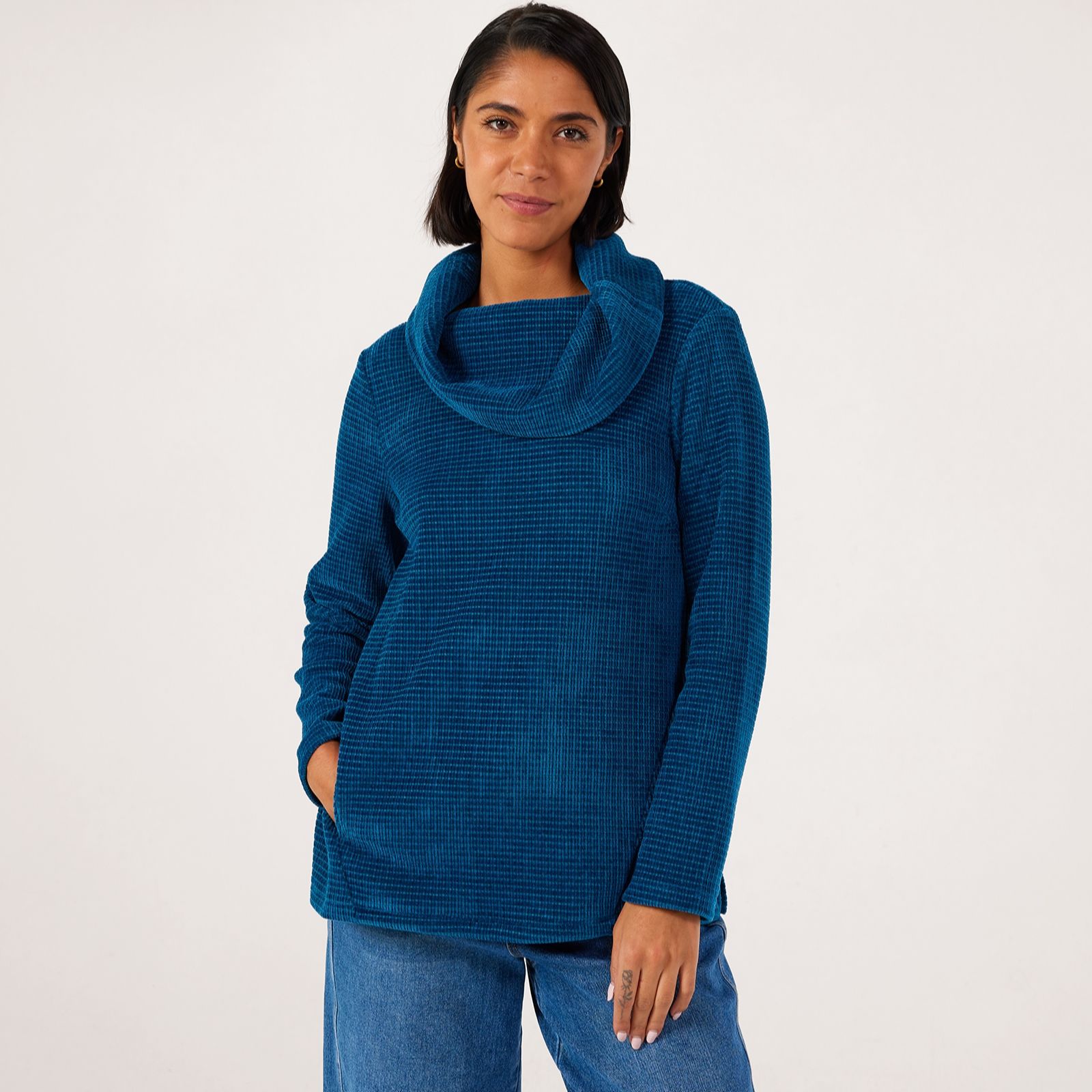Own your look in the sumptuous comfort of the Nina Leonard cowl neck chenille knit jumper, a hip-length design that brings together effortless elegance and cosy warmth. With its loose fit, angled seam detailing and side slits, this jumper is perfect for leisurely weekends, casual outings or layering at the office. Pair it with slim trousers and ankle boots for a chic, laid-back ensemble that's as stylish as it is versatile.
