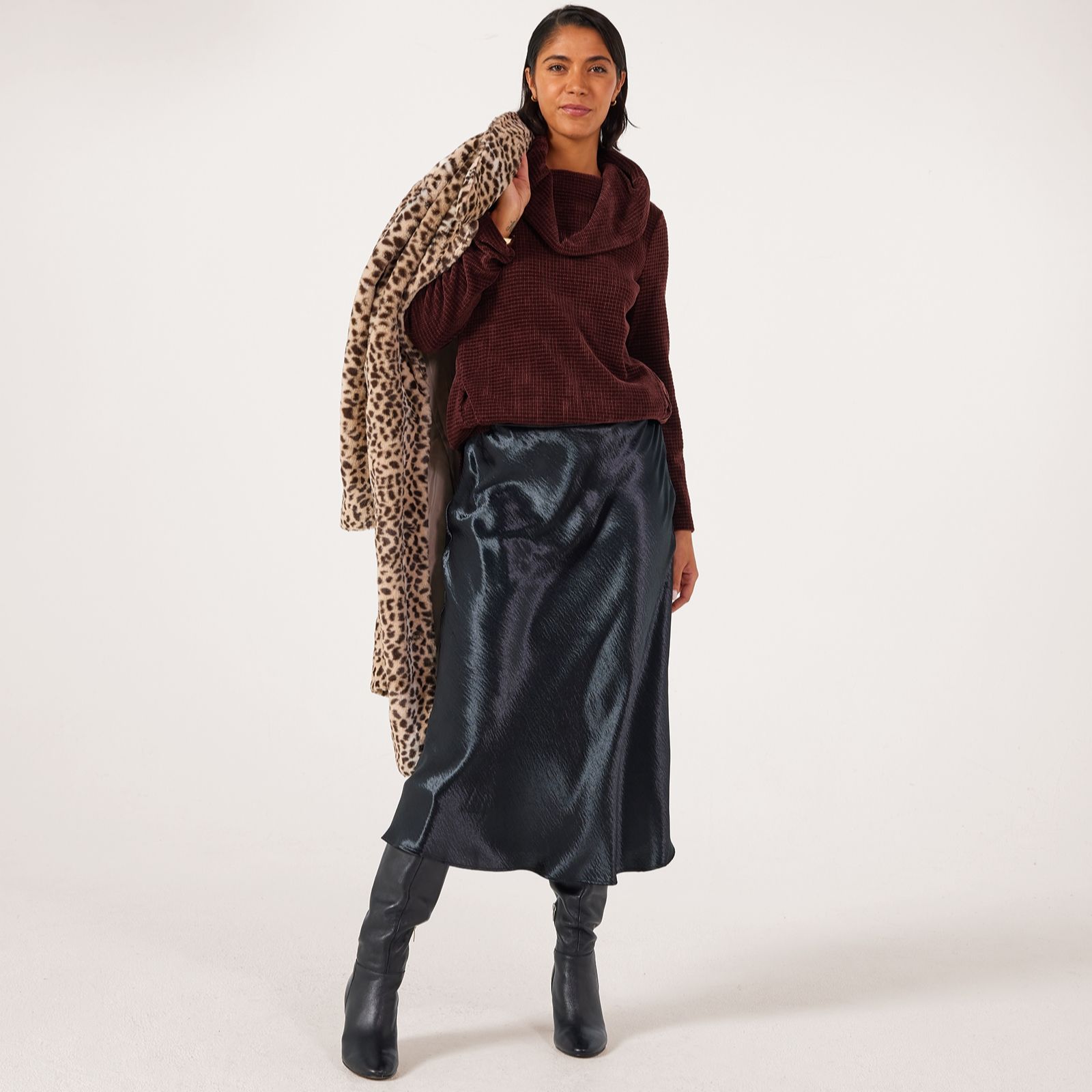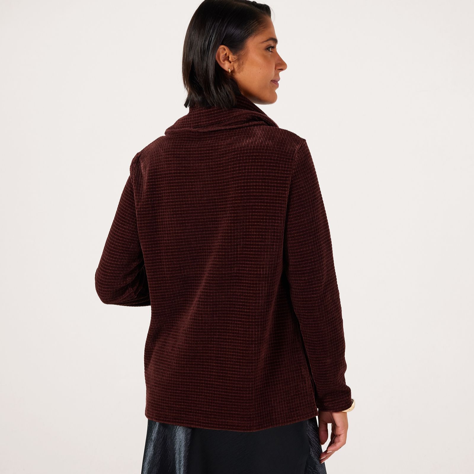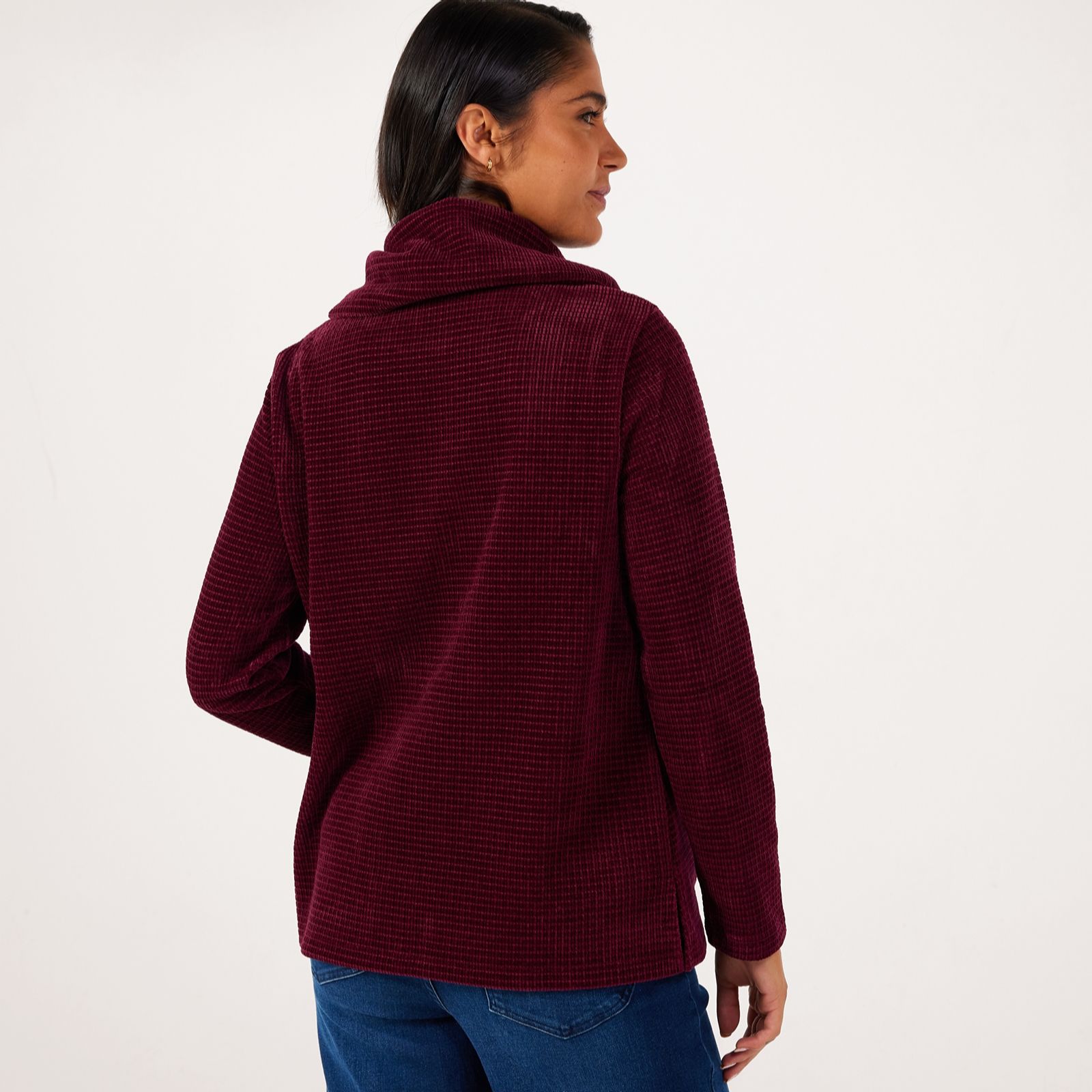 Own your look in the sumptuous comfort of the Nina Leonard cowl neck chenille knit jumper, a hip-length design that brings together effortless elegance and cosy warmth. With its loose fit, angled seam detailing and side slits, this jumper is perfect for leisurely weekends, casual outings or layering at the office. Pair it with slim trousers and ankle boots for a chic, laid-back ensemble that's as stylish as it is versatile.