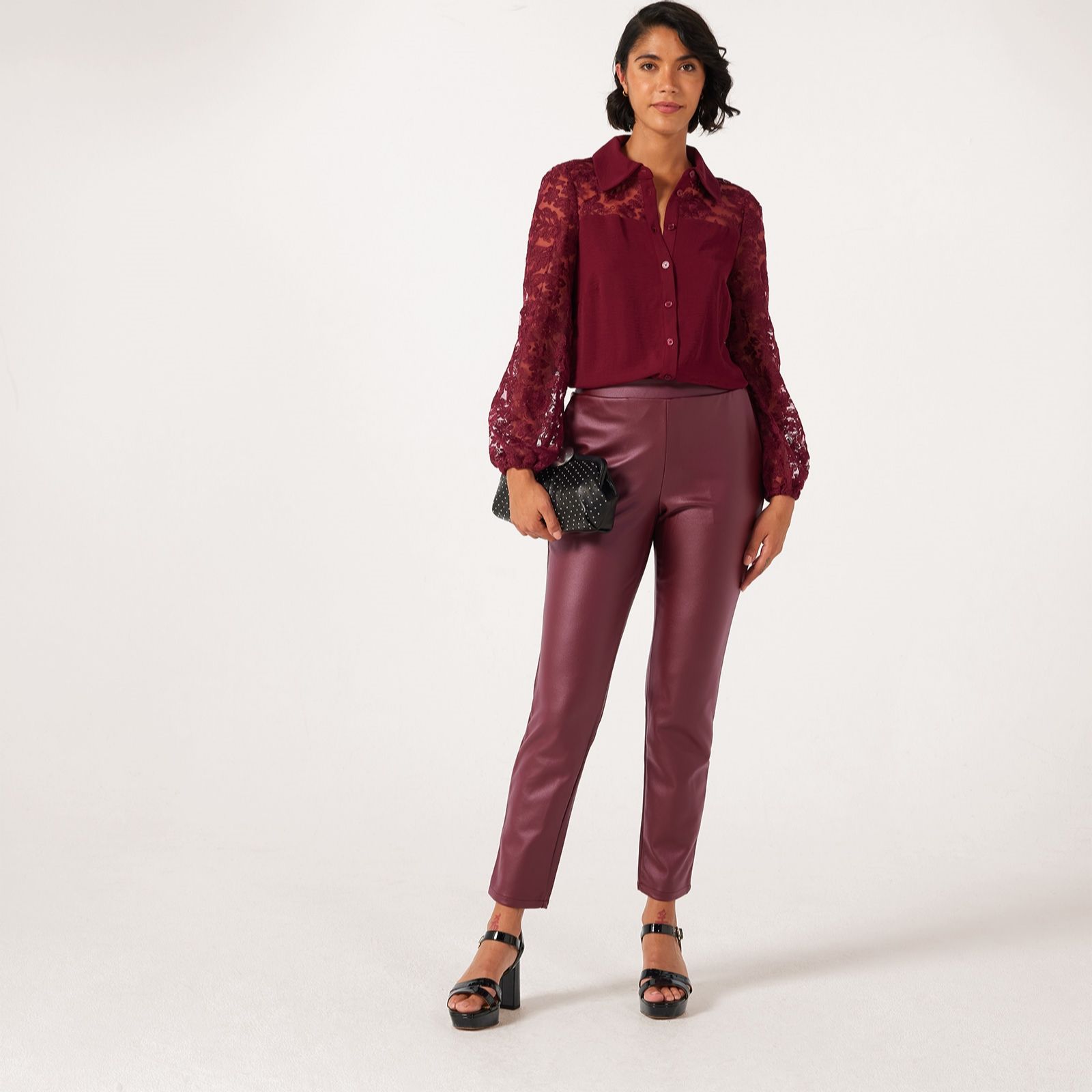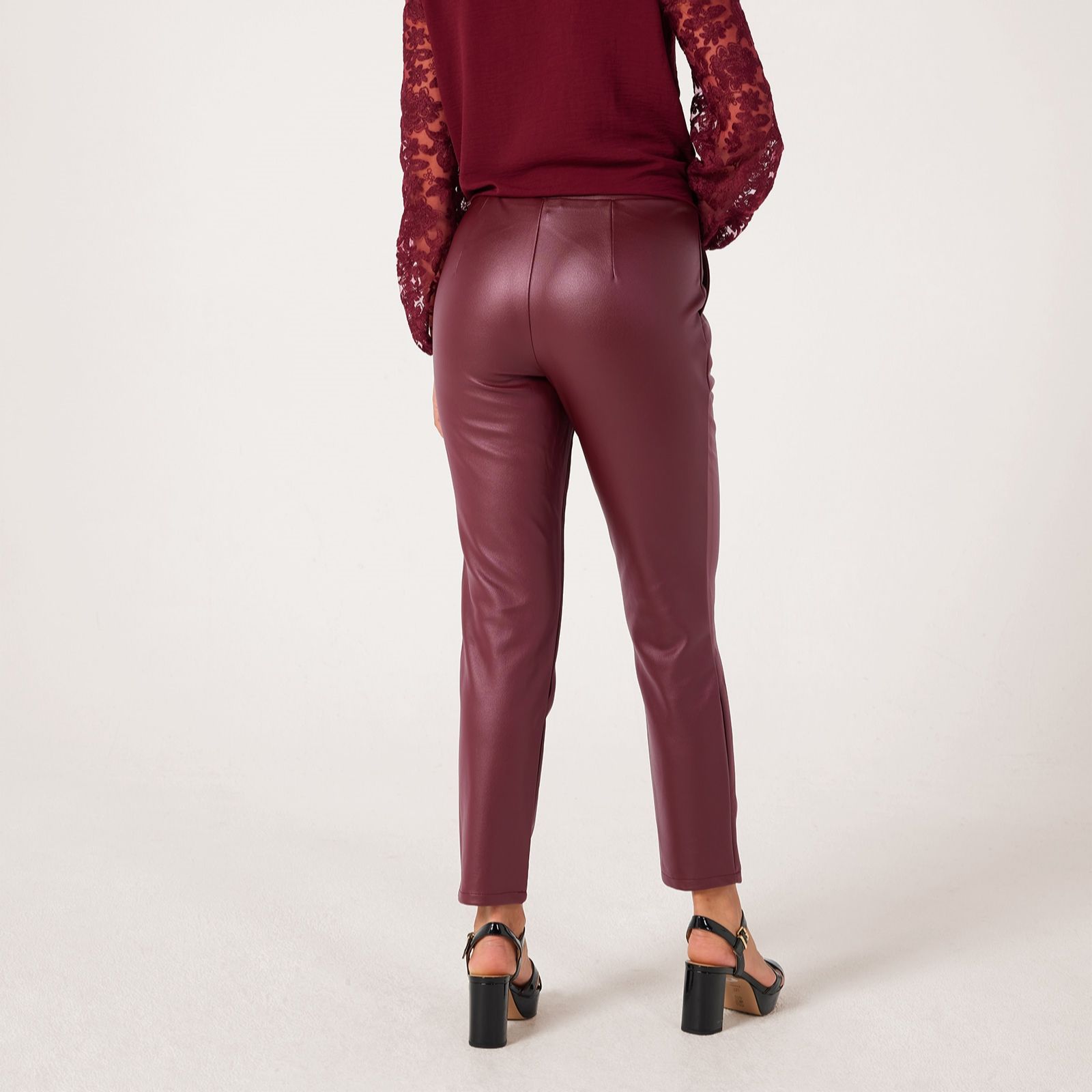 Step into sleek sophistication with these narrow leg trousers from Nina Leonard in a petite length. These trousers are designed in faux leather for a contemporary edge, finished with an easy pull-on style and elasticated waist for comfort. Whether you're heading to lunch with friends or dressing up for an evening out, they'll bring an effortlessly chic vibe to any look. Try pairing them with a relaxed knit or a sharp blazer for versatile styling.