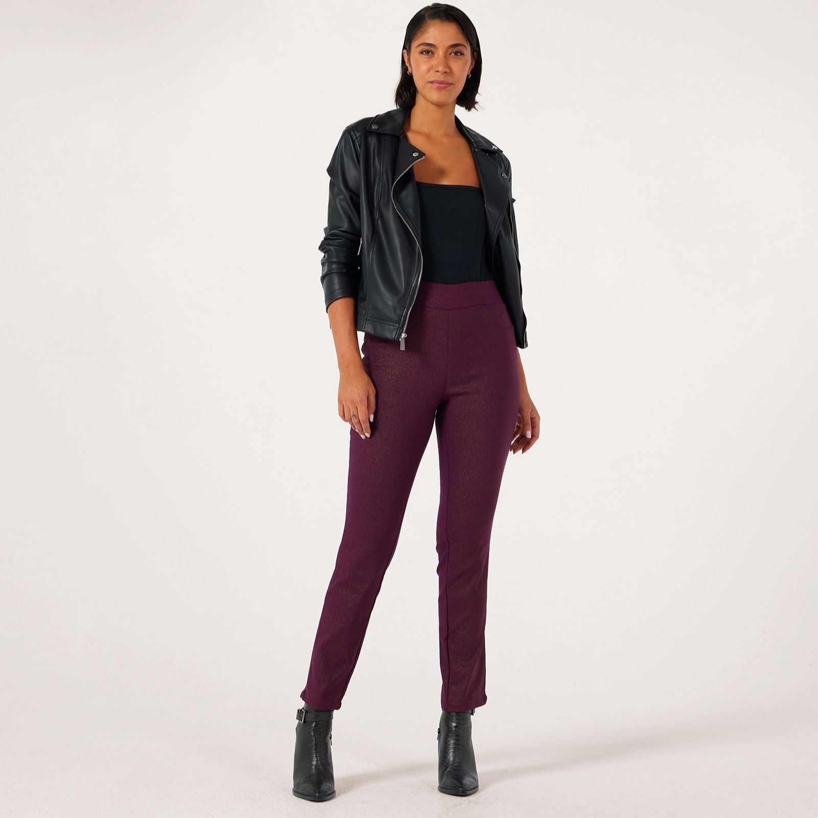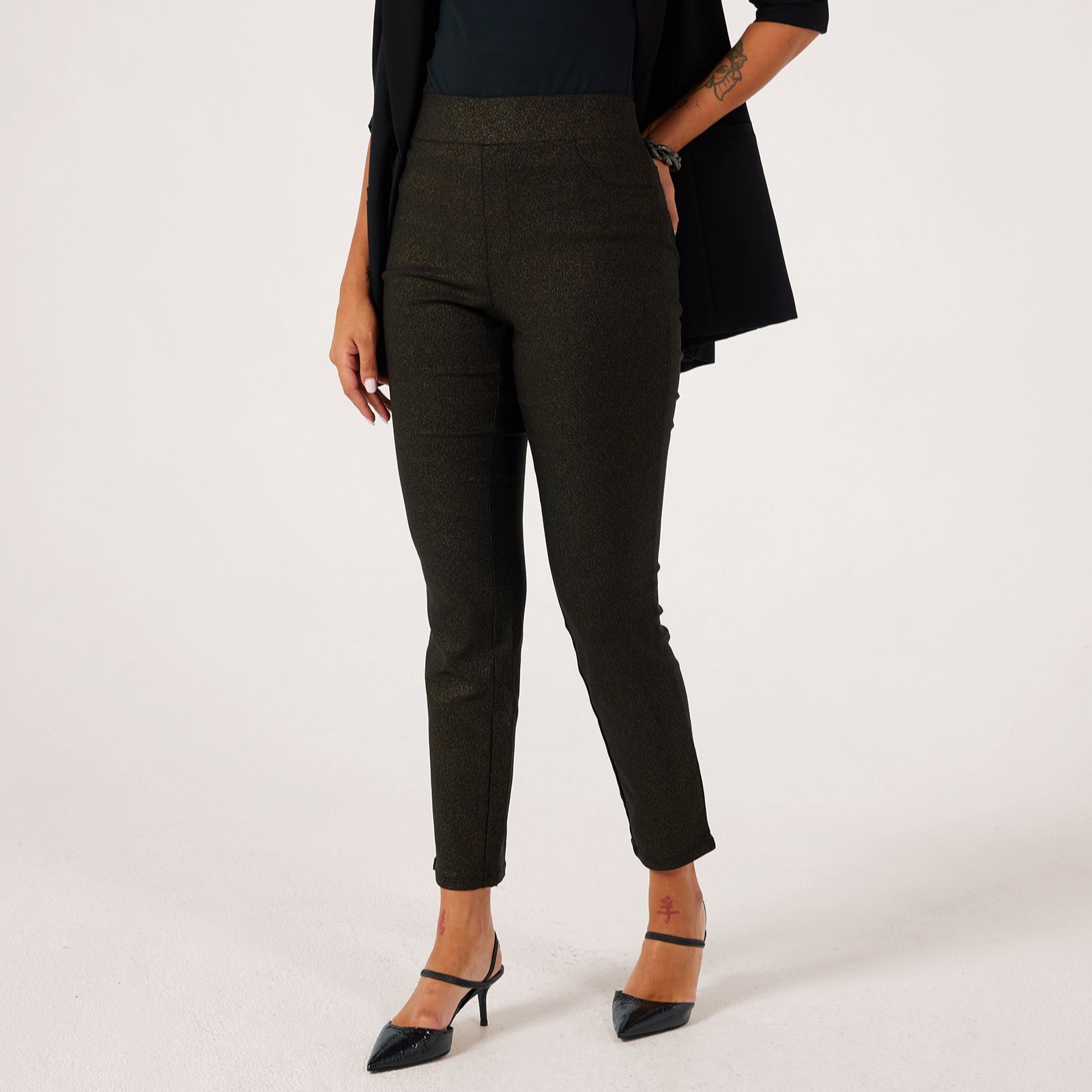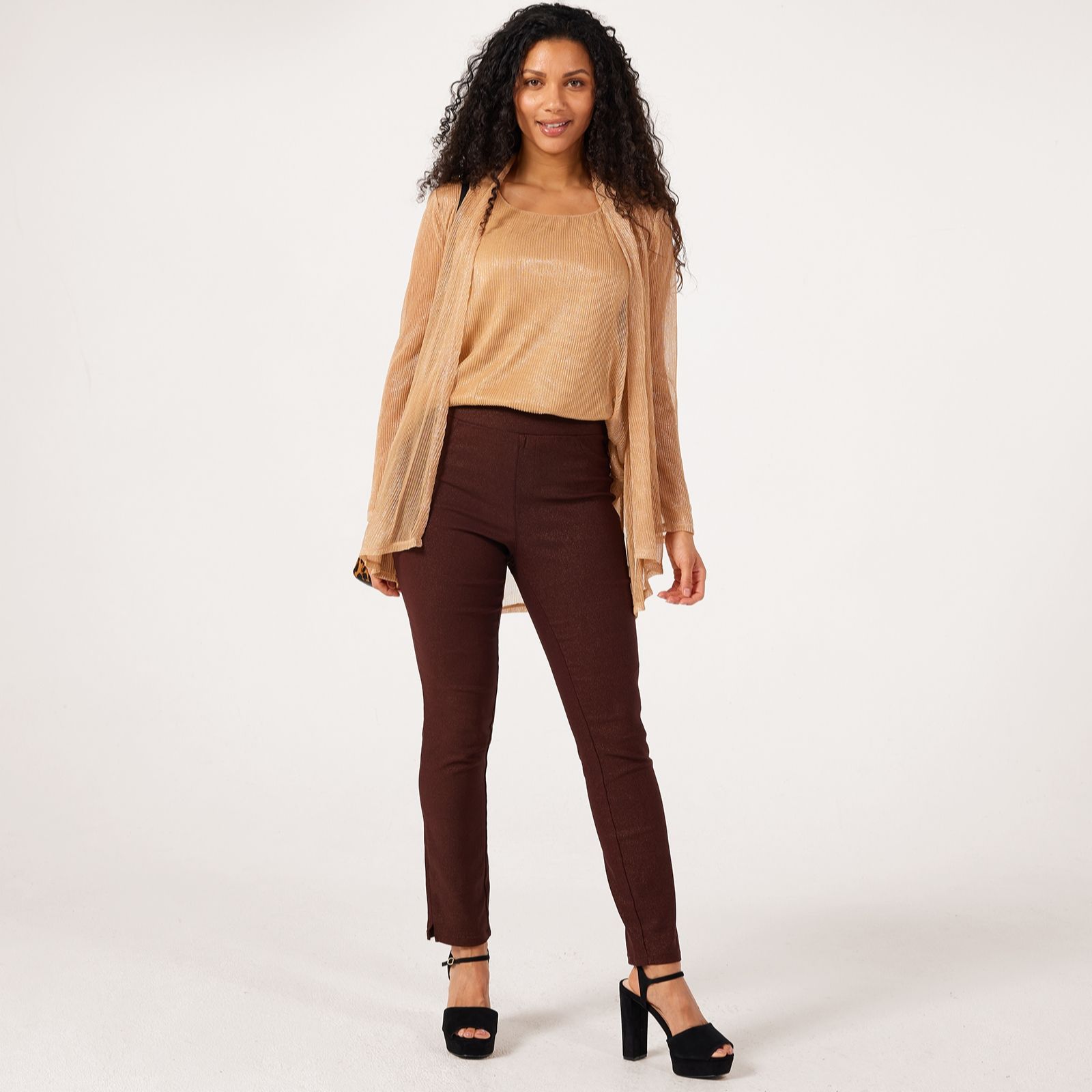Slip into sleek style with the foil Millennium narrow leg pull-on trousers from Nina Leonard in a standard fit. These trousers feature an elasticated waist and smooth fit, ensuring comfort from morning errands to evening outings, while the faux front pockets and real back pockets keep the look sleek and practical. Try them with a flowing blouse and smart flats for a polished finish that works for any occasion.