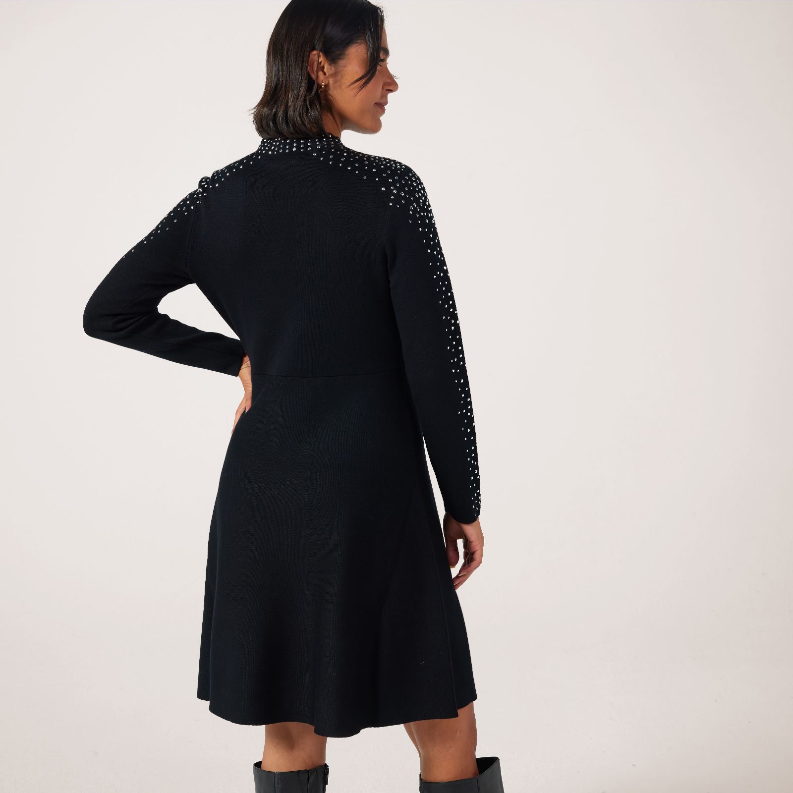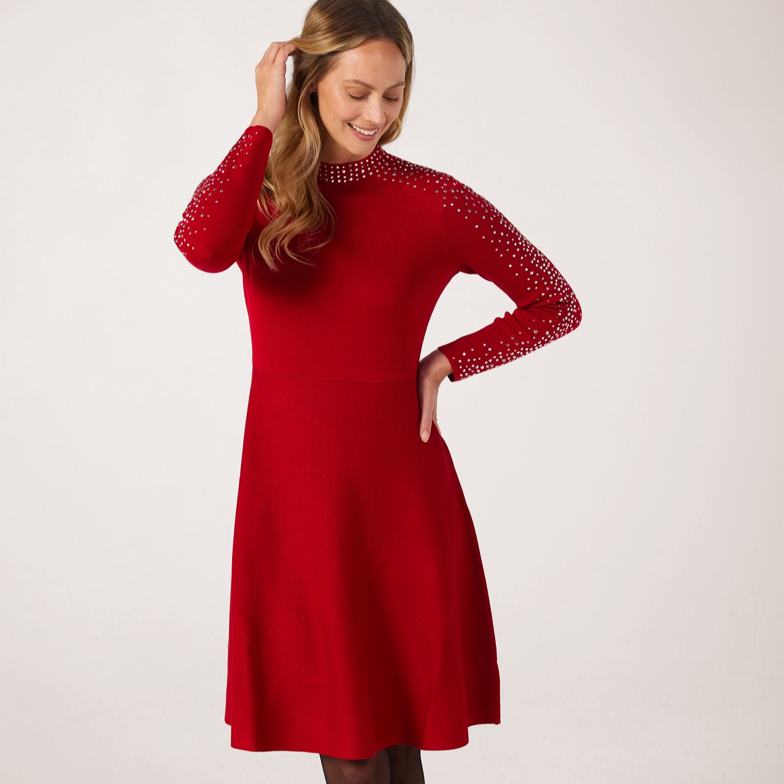 Channel your inner ice-skater with the fit & flare sweater dress from Nina Leonard, where a mock roll-neck collar and shimmering stud details on the collar, shoulders and sleeves create a look that's both playful and polished. Perfect for everything from winter gatherings to chic office days, this charming dress brings effortless style to your cold-weather wardrobe. Try pairing it with ankle boots and a tailored coat for a modern finish.
