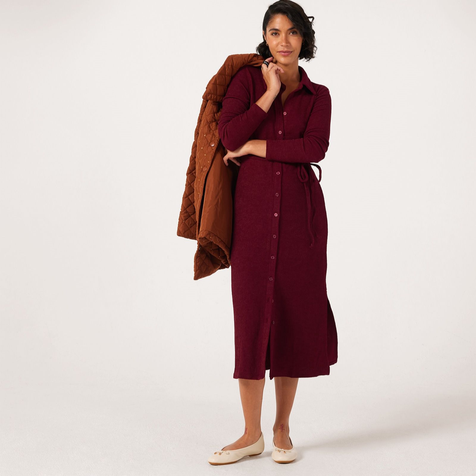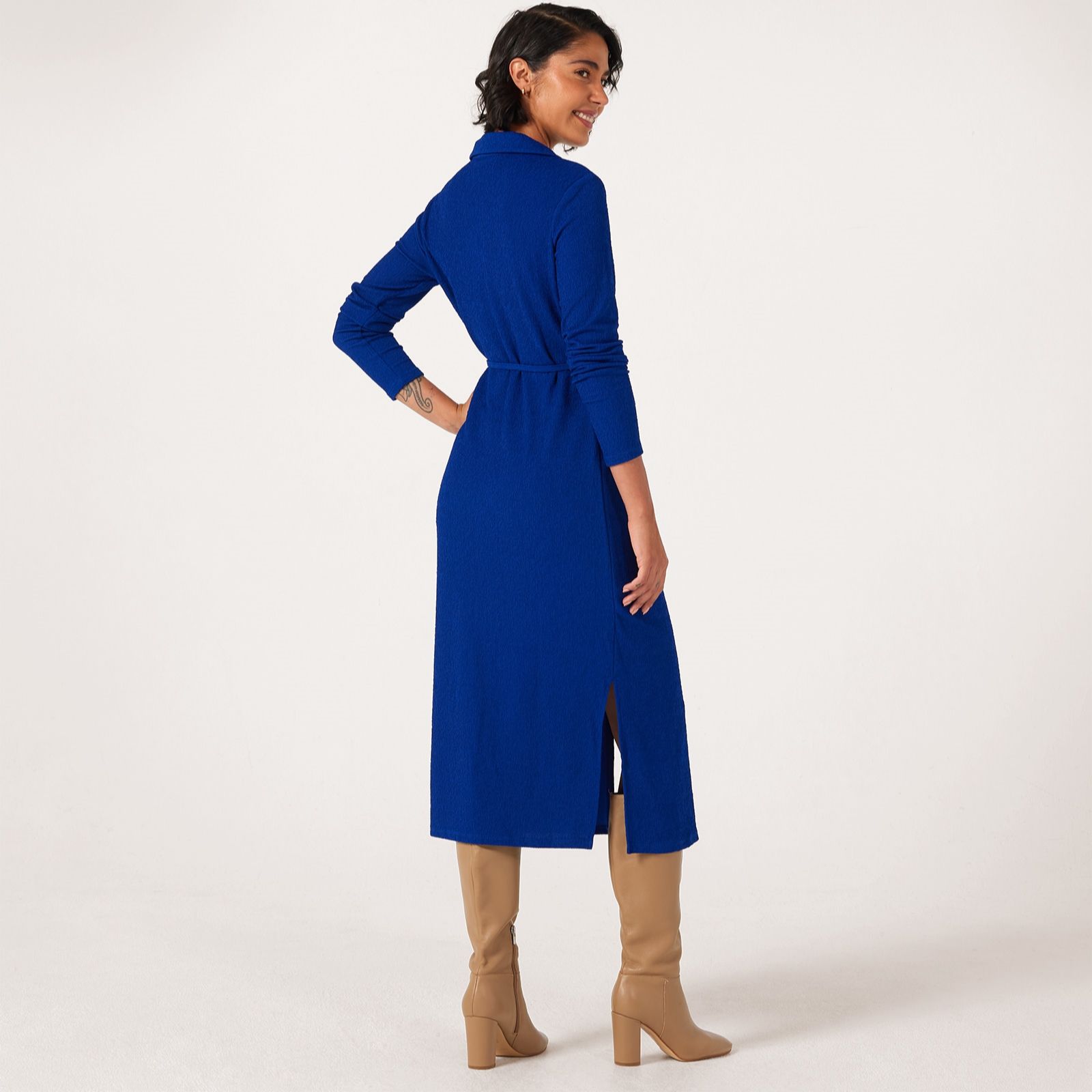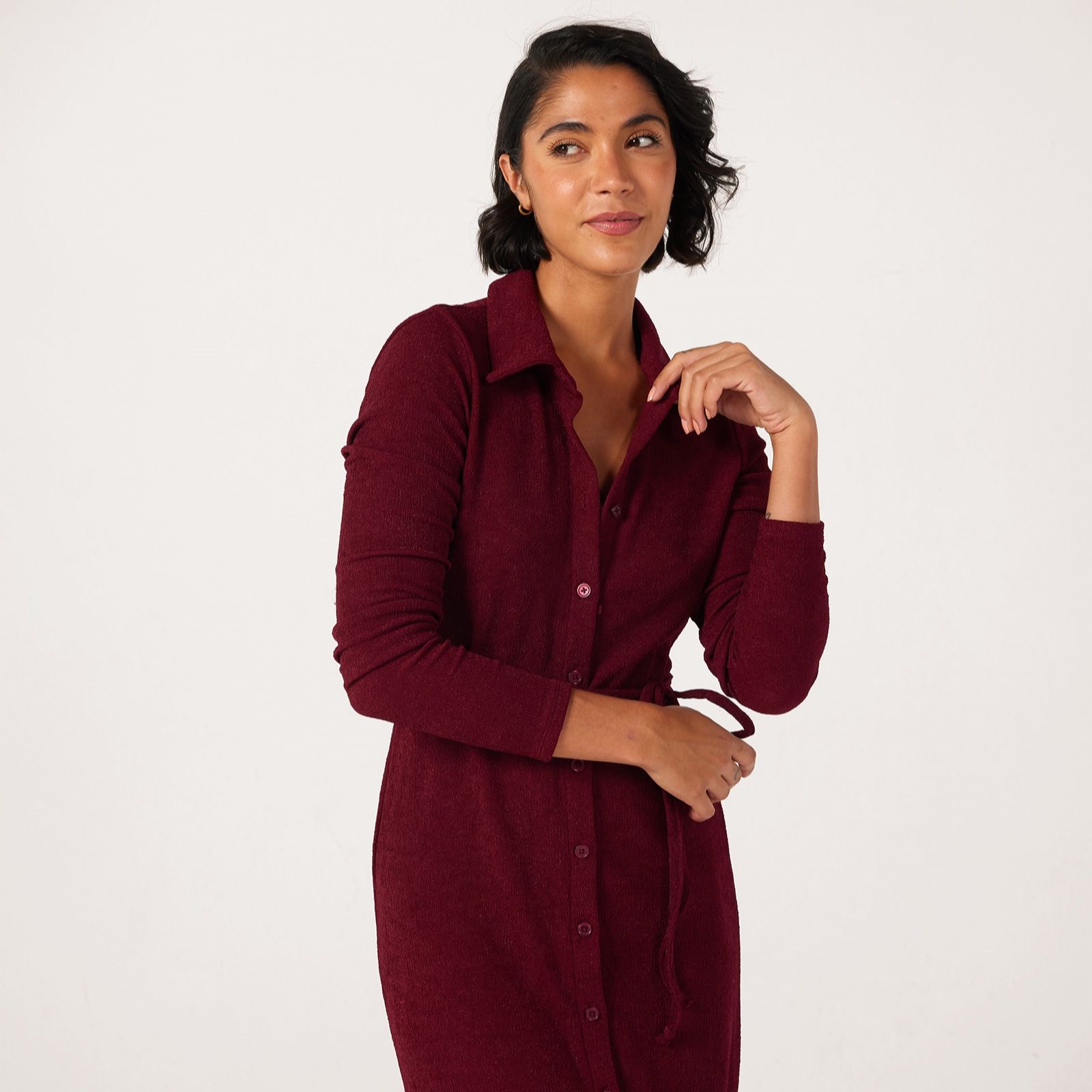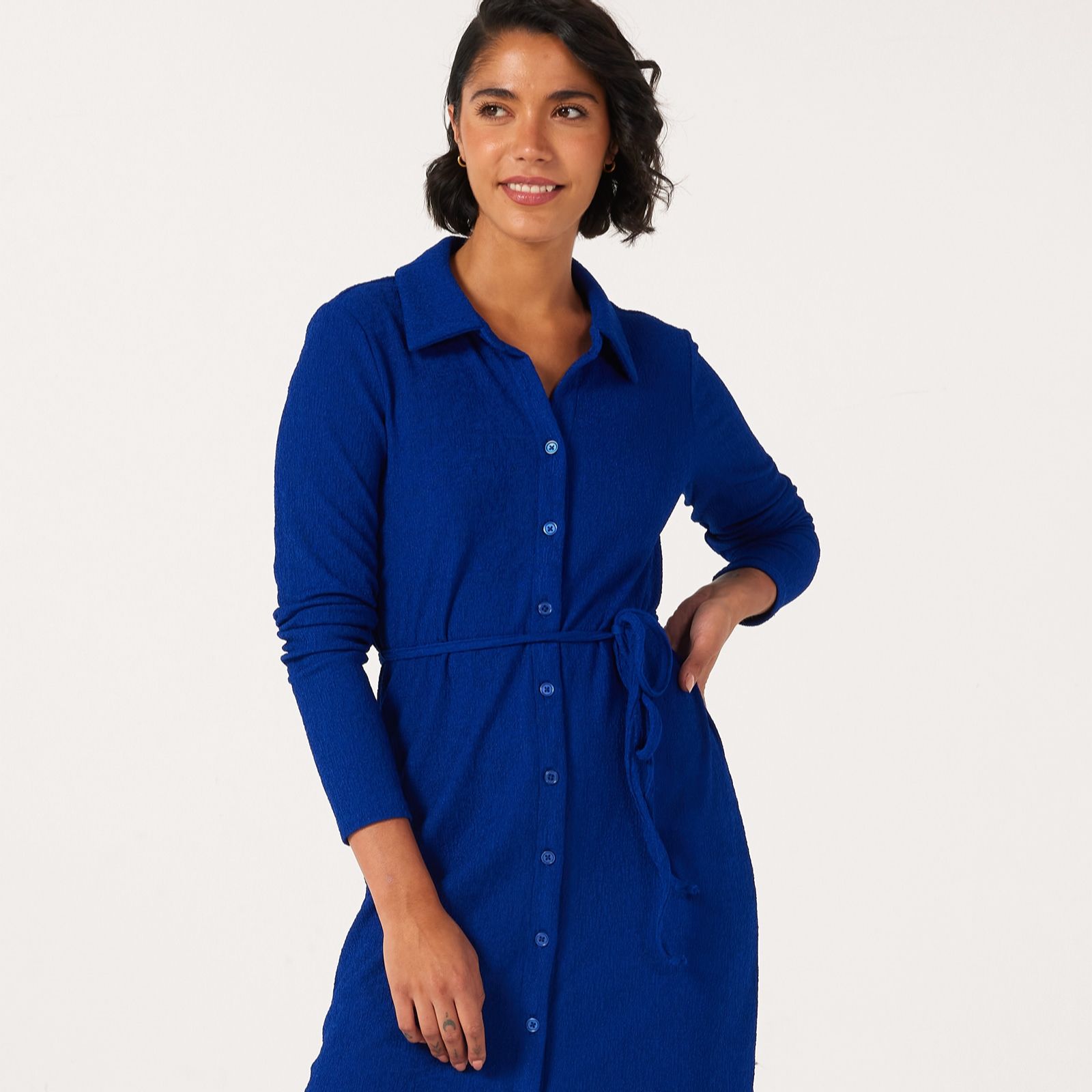 Make everyday dressing a breeze with the midi length shirt dress from Nina Leonard, where classic tailoring meets modern comfort. This dress features a collared neckline, button front and long sleeves, offering timeless appeal, while a spaghetti tie at the waist and side slit add a delicate twist. Whether you're heading to the office, brunch or a weekend event, simply pair with block heels or trainers for effortless style.