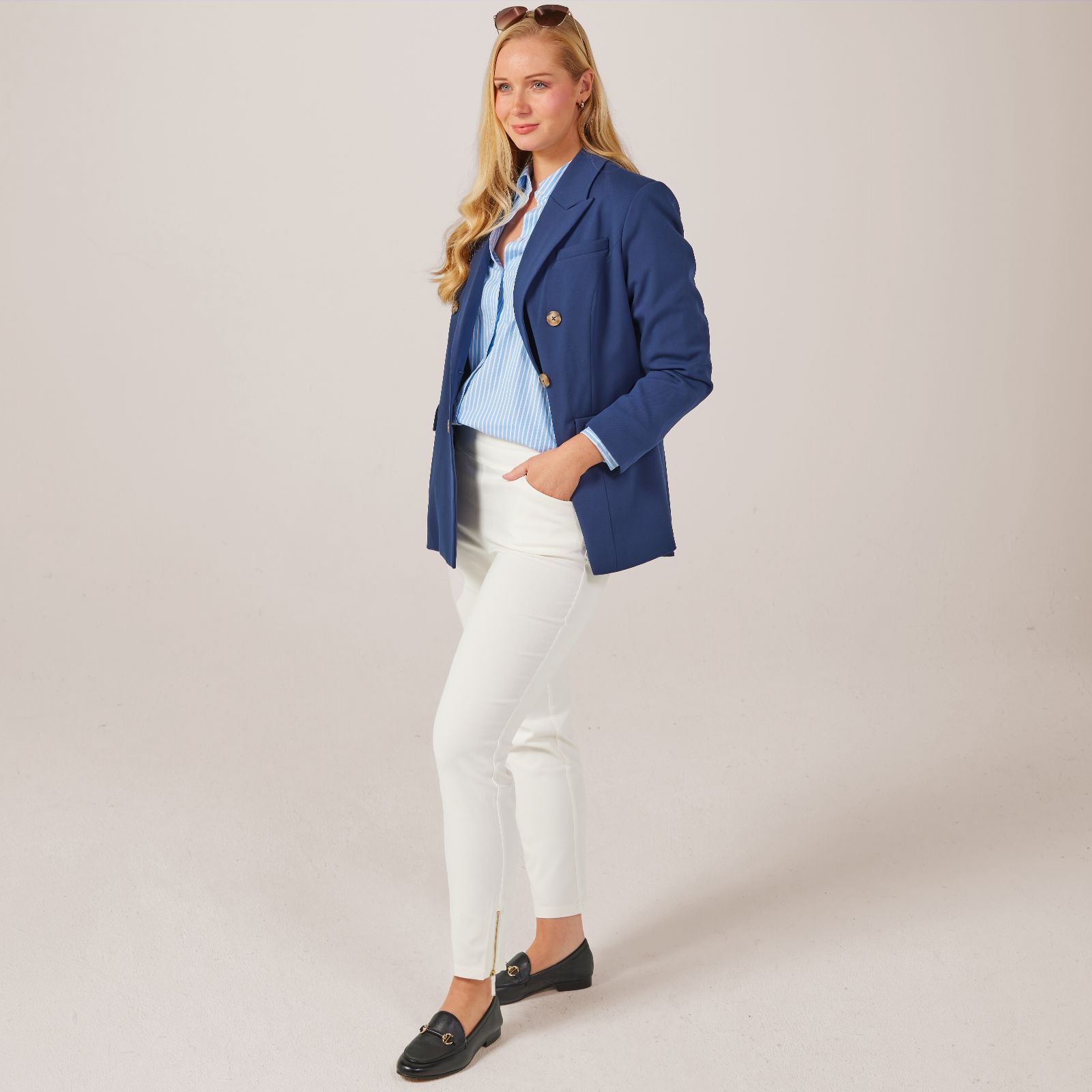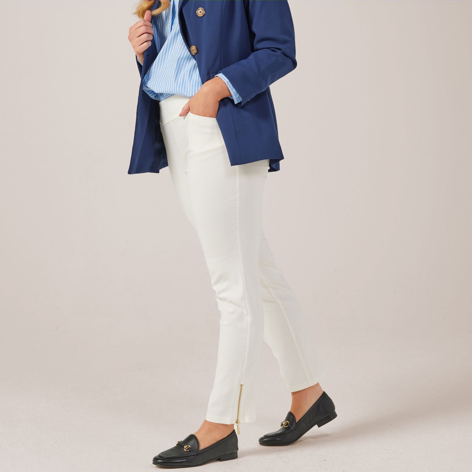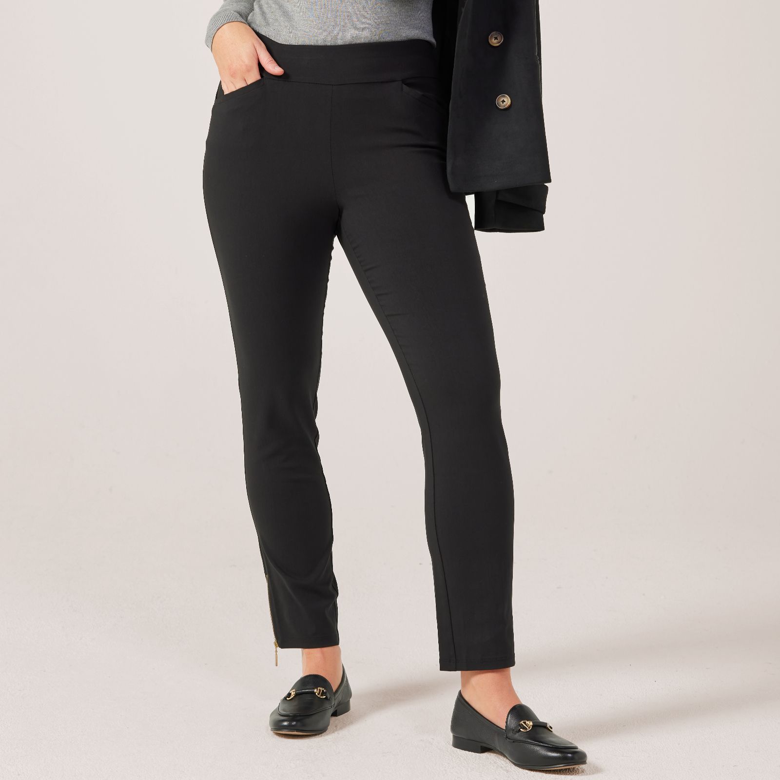 Elevate your everyday style with these Nina Leonard Millenium Slim trousers in a standard fit. Featuring an elasticised waist and a wide waistband, these trousers offer a comfortable yet sleek fit that elevates your silhouette. The front slash pockets add a practical touch, while the zipper trim at the outseam hem provides a chic detail. Perfect for both casual and formal settings, these trousers can be paired effortlessly with a blouse and heels for a polished office look or dressed down with a cosy jumper for a relaxed weekend outfit.