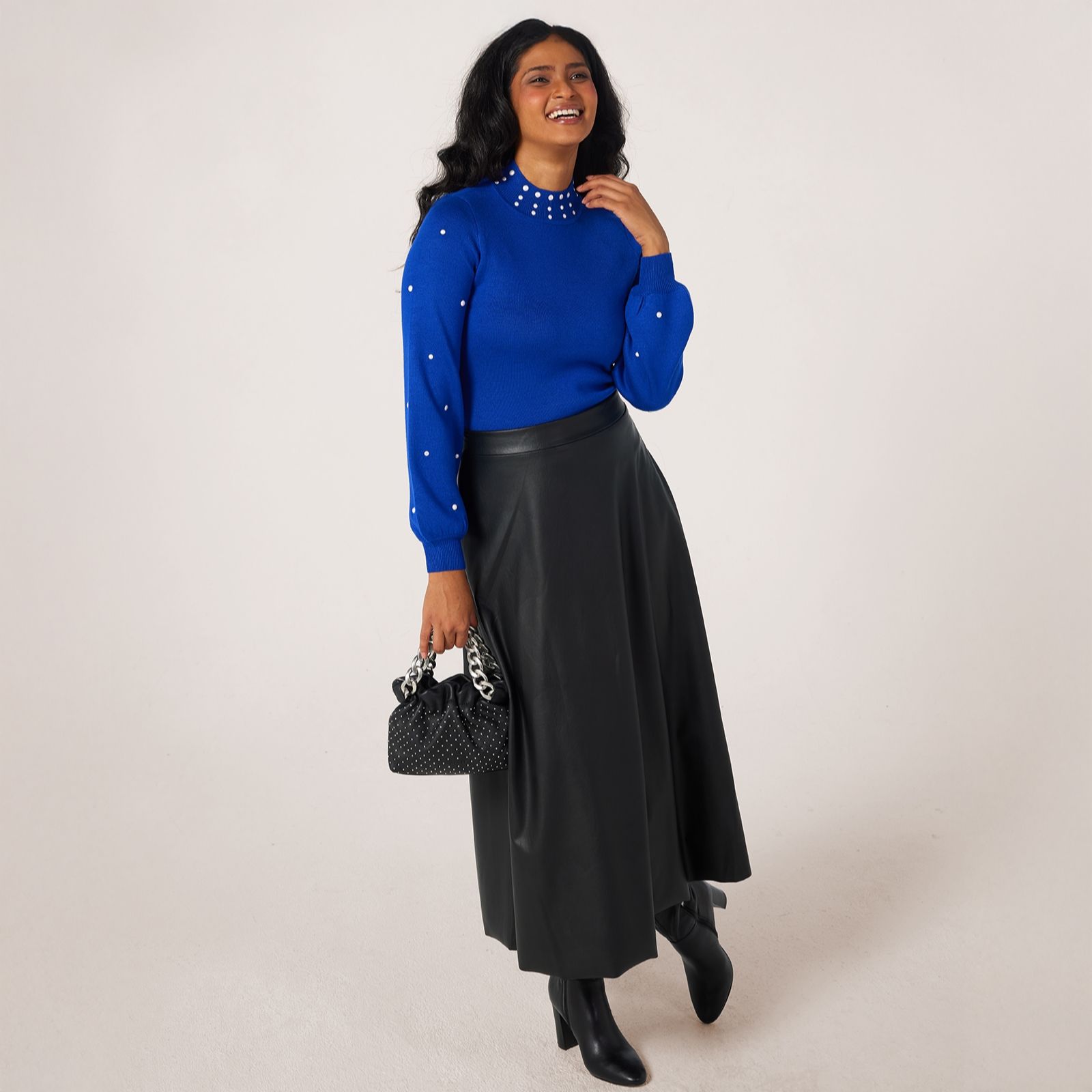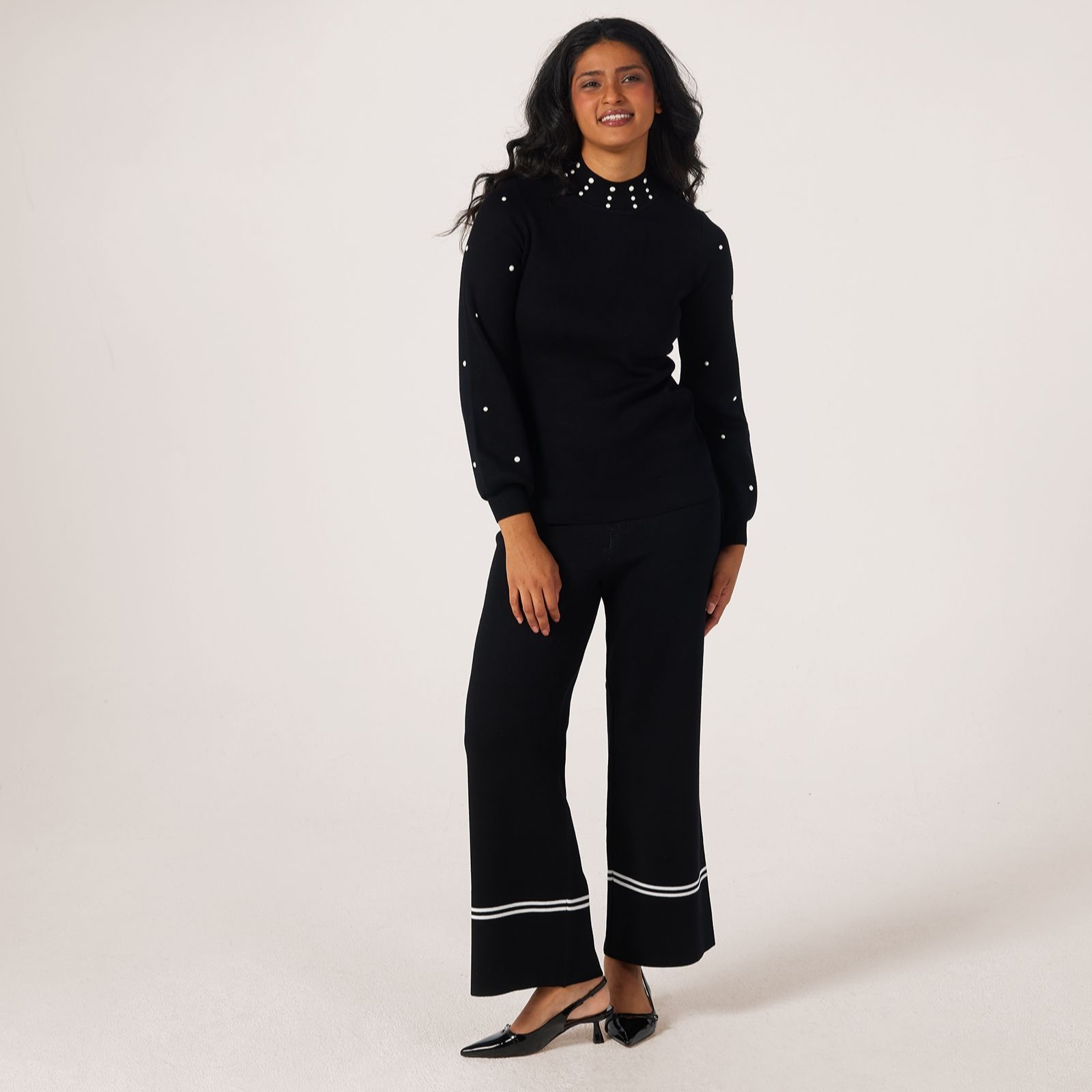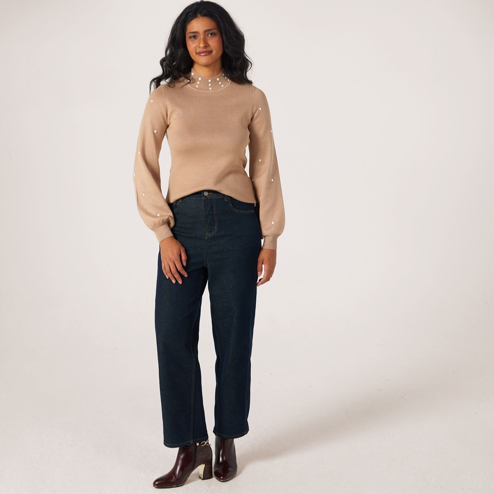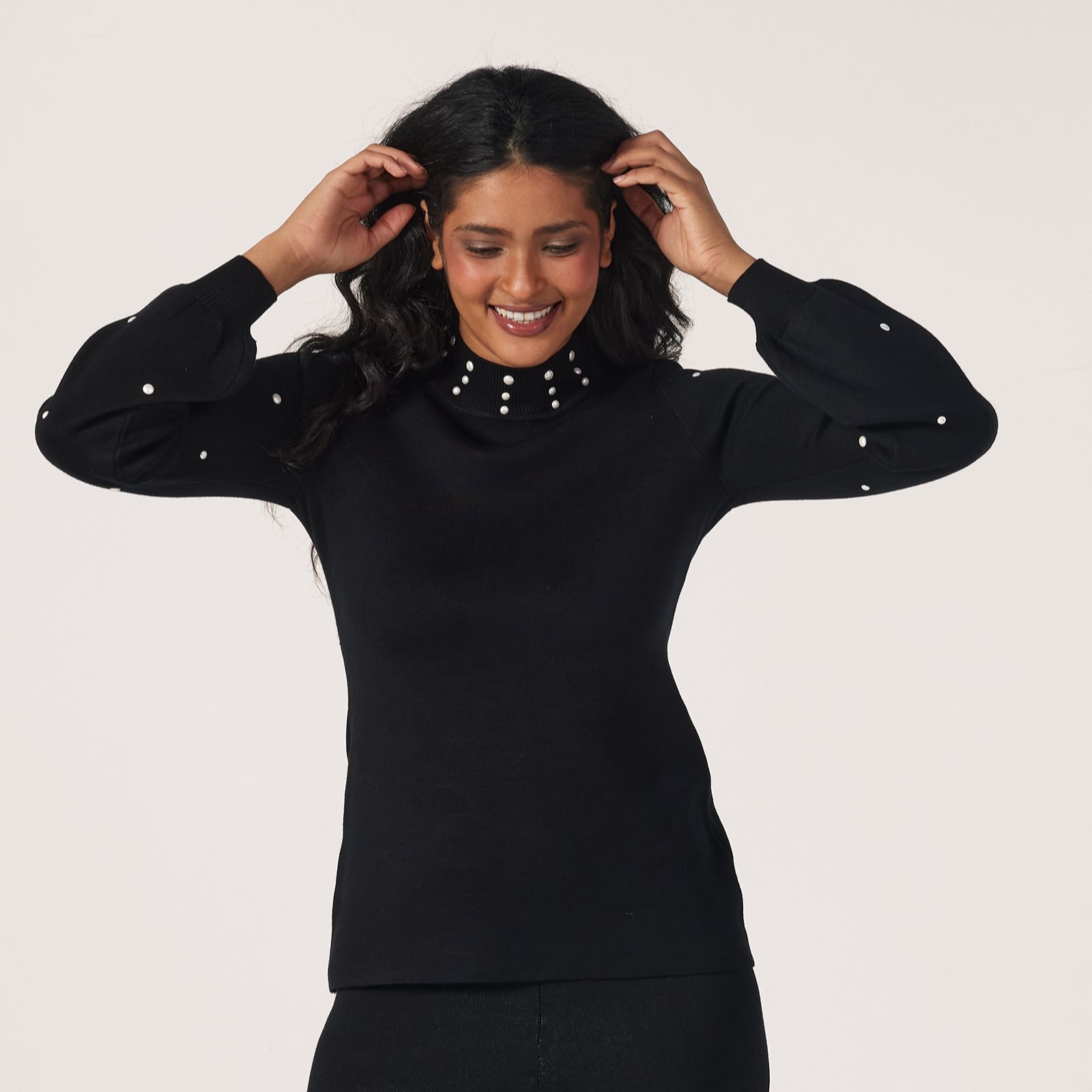 Add a touch of elegance to your wardrobe with this Nina Leonard balloon sleeve jumper, featuring a chic mock neck and beautifully scattered pearl embellishments that bring subtle sophistication to your everyday style. Perfect for everything from coffee dates to evening gatherings, this fitted knit jumper transitions seamlessly from day to night. Try pairing it with tailored trousers or a flowing midi skirt for a polished, contemporary look.