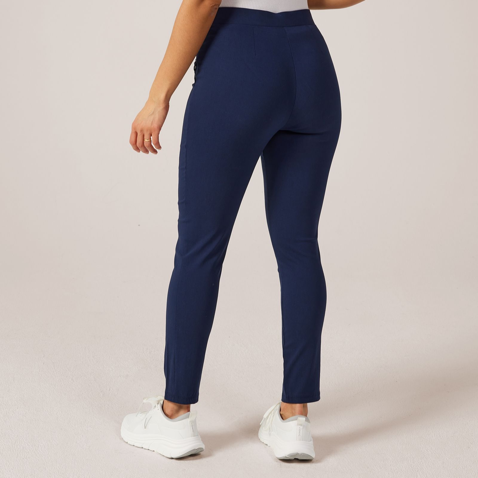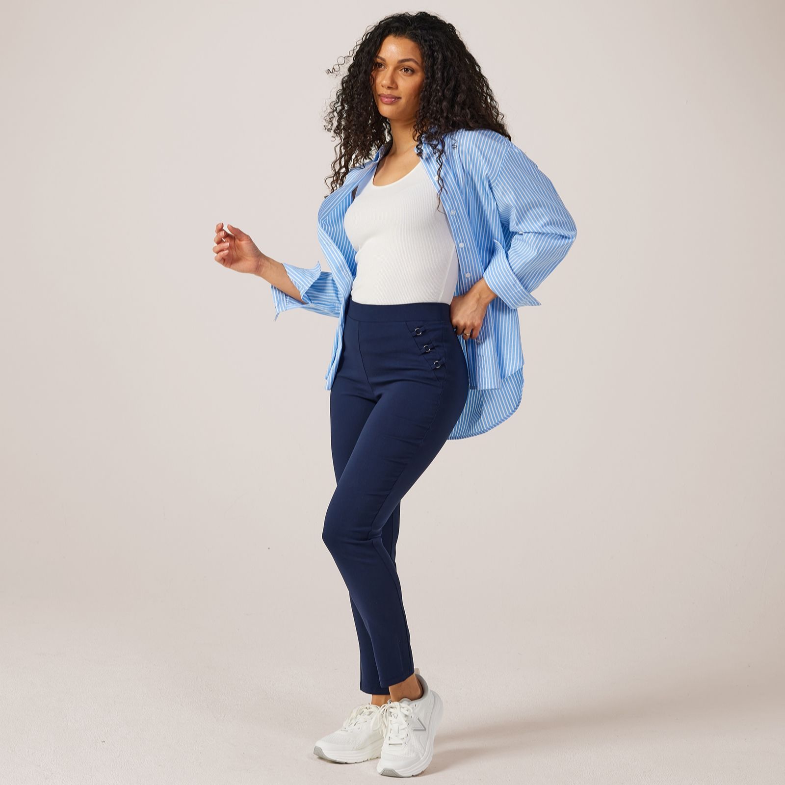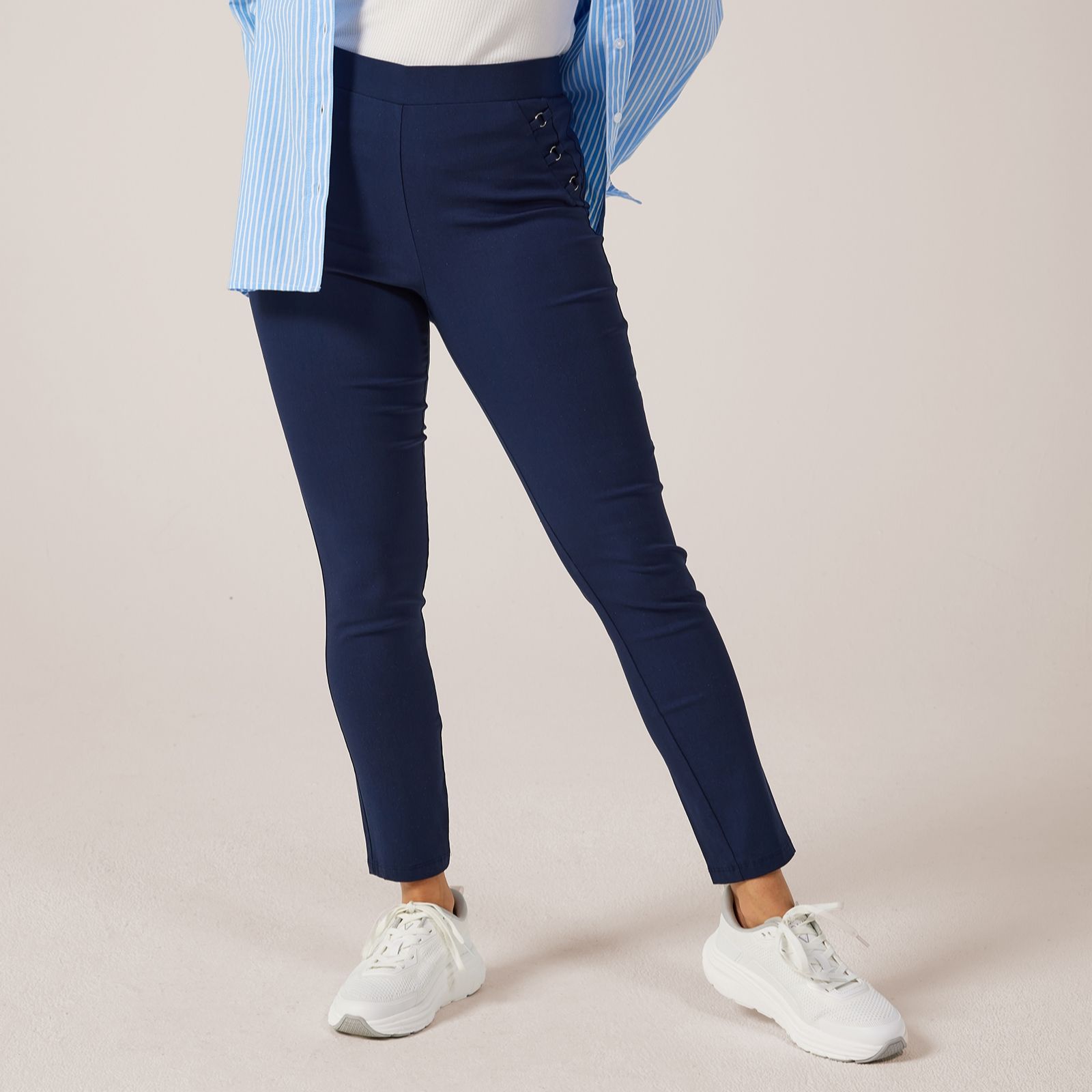 Add a touch of elegance to your wardrobe with these pull-on narrow leg trousers from Nina Leonard in a petite fit. Featuring an elasticated waistband for ultimate comfort and a chic ring detail at the side front panels, these trousers are designed to make you look effortlessly stylish. Perfect for both work and casual outings, their sleek silhouette pairs beautifully with a smart blouse or a relaxed tee.