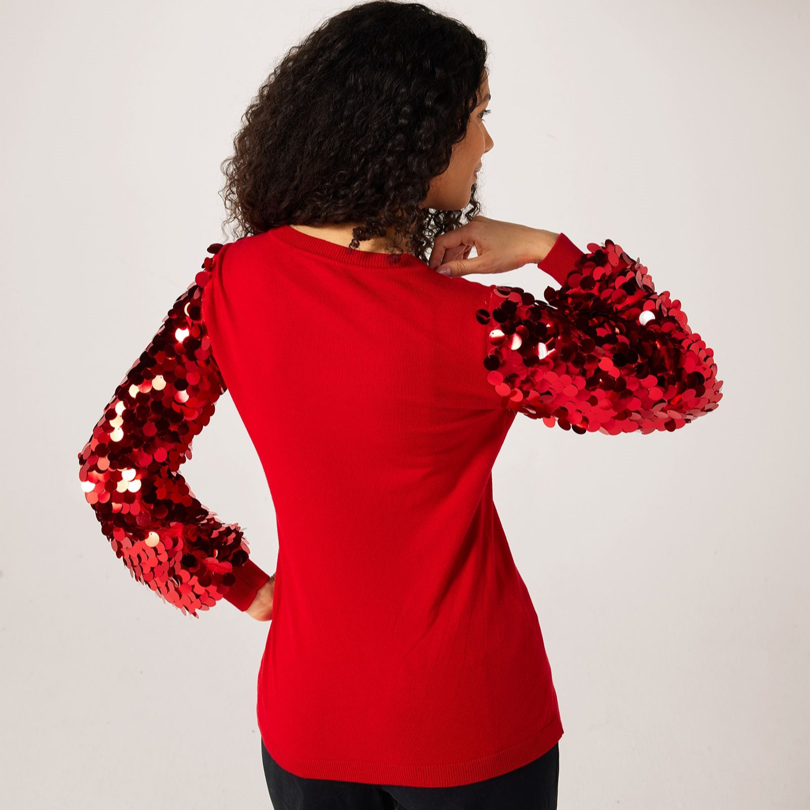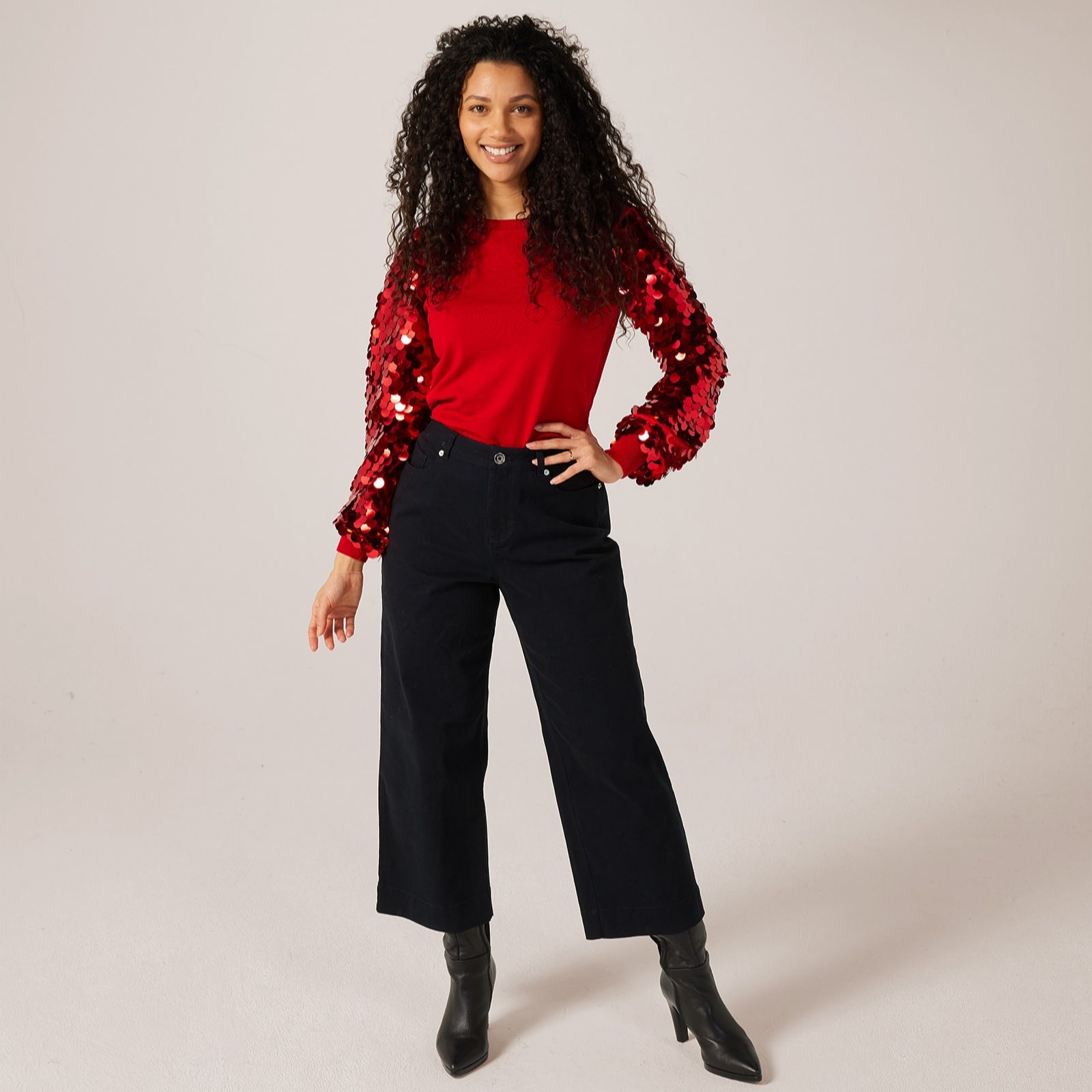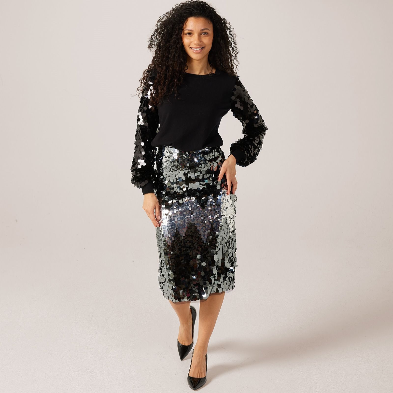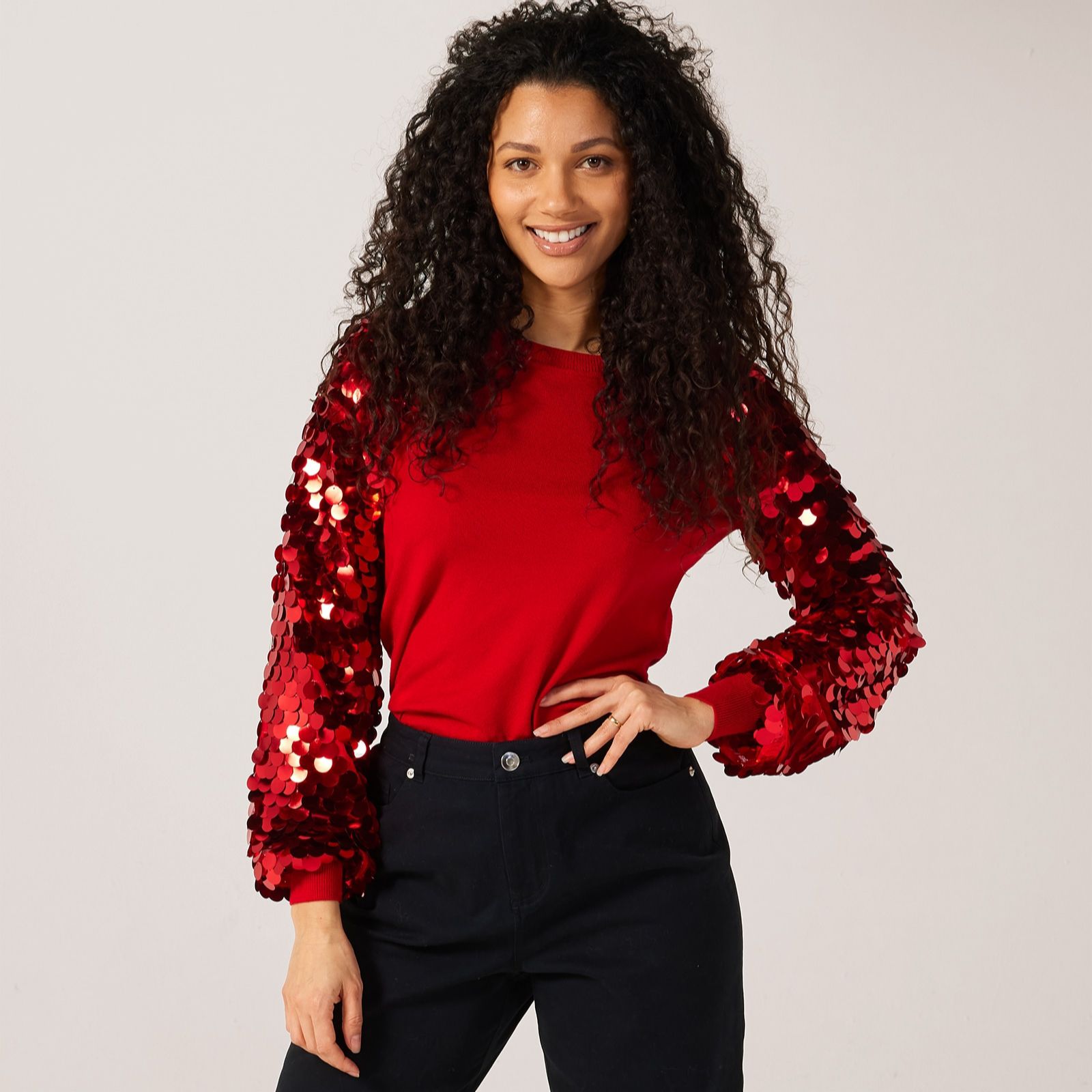Add a touch of sparkle to your wardrobe with the Nina Leonard sequin balloon sleeve knit jumper. This chic piece features all-over large sequin detailing on the sleeves, giving it a glamorous edge. The semi-fitted design, round banded neckline and ribbed cuffs ensure both comfort and style. Perfect for a variety of occasions, from casual gatherings to festive parties, this jumper pairs beautifully with tailored trousers or your favourite jeans for a stylish ensemble.