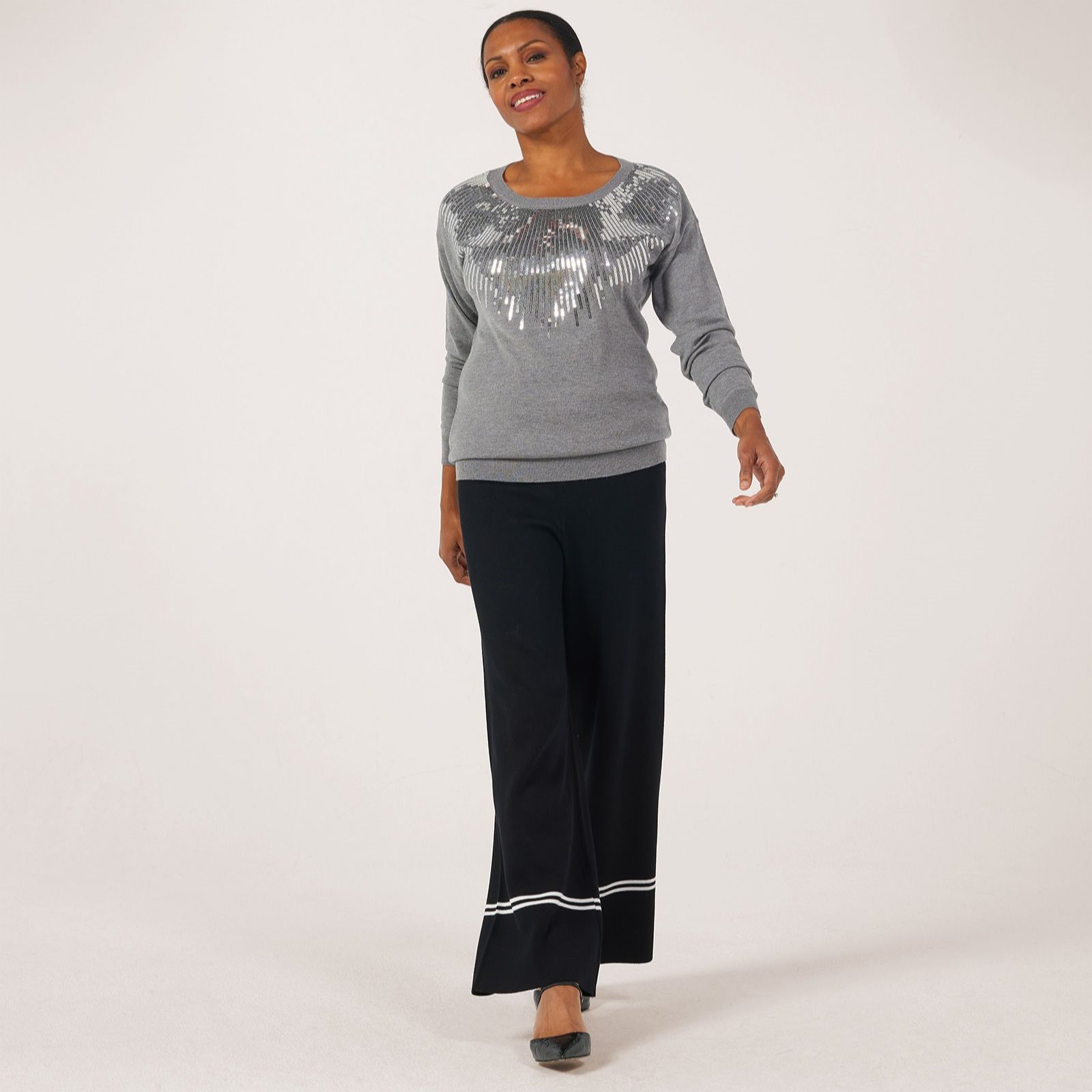 Bring a touch of sparkle to your everyday with this Nina Leonard sequin sunburst drop shoulder jumper. The shimmering sunburst design radiates from the neckline, while the relaxed drop shoulders and hip-length cut create an effortlessly chic silhouette that's perfect for both daytime outings and evening gatherings. Try pairing it with tailored trousers or a sleek skirt for a look that shines from desk to dinner.