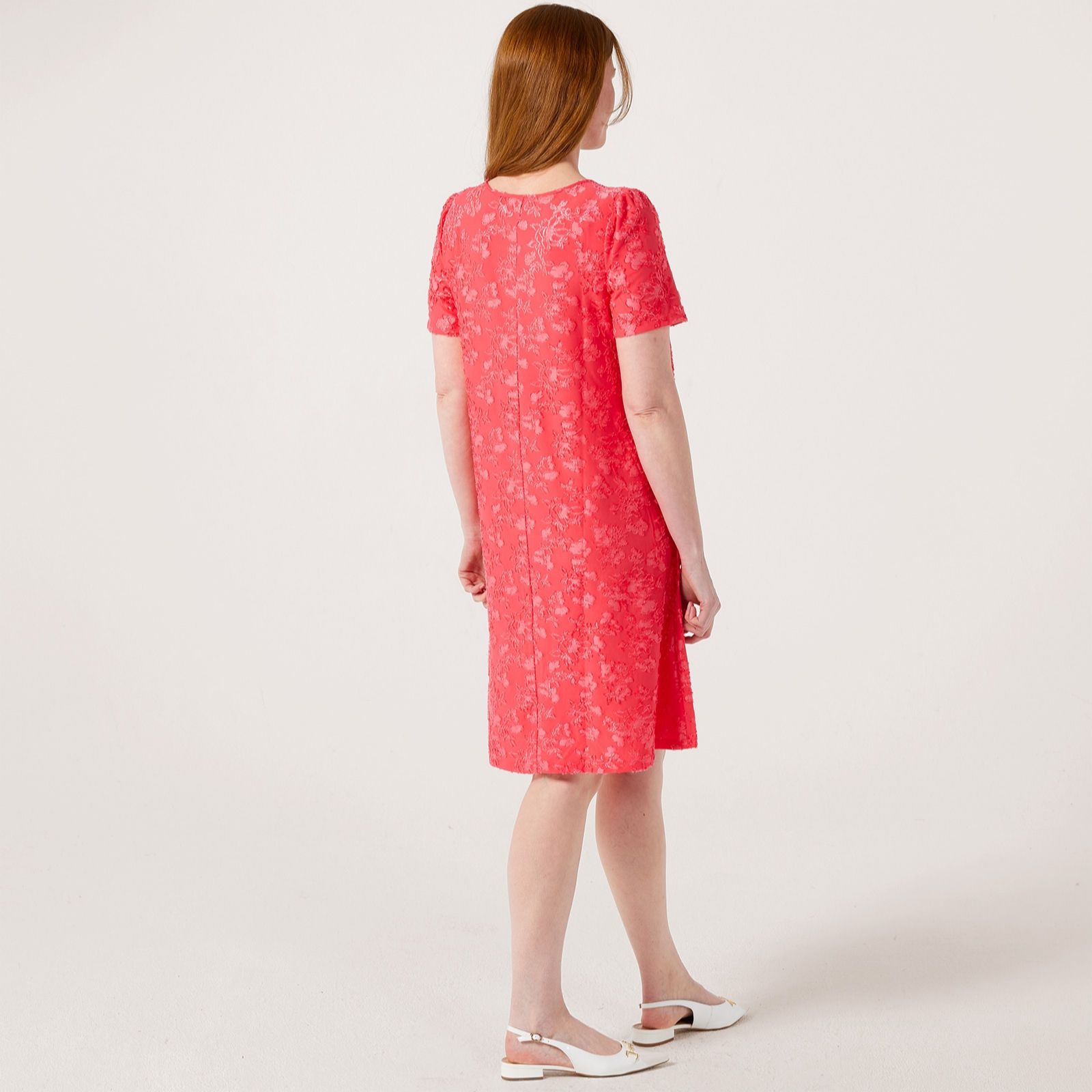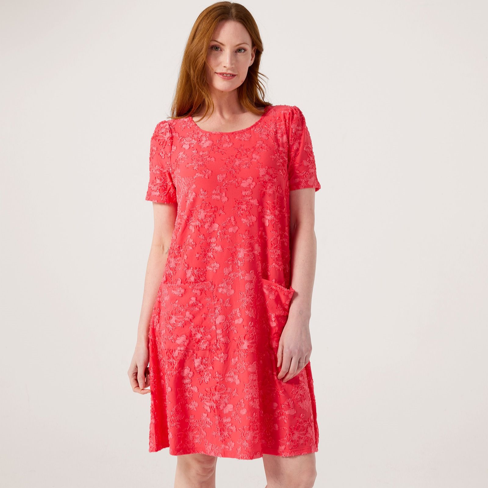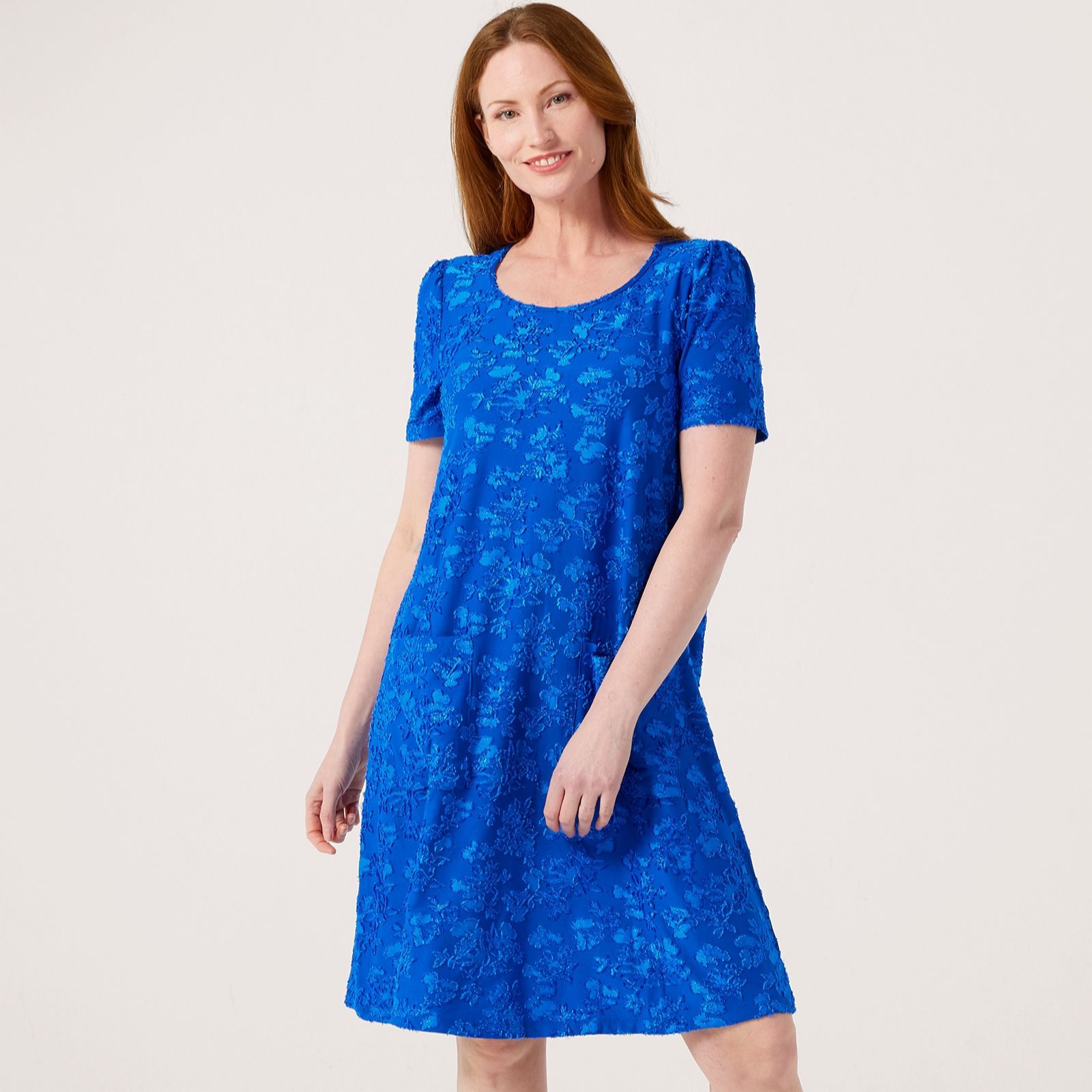 Embody effortless style with the Nina Leonard short sleeve jacquard trapeze dress, a piece that effortlessly combines comfort and elegance. This knee-length dress features a semi-fitted silhouette with a scoop neckline and practical front patch pockets, making it perfect for both casual outings and more formal occasions. Pair it with your favourite sandals for a laid-back look or dress it up with heels and statement jewellery for an evening out.