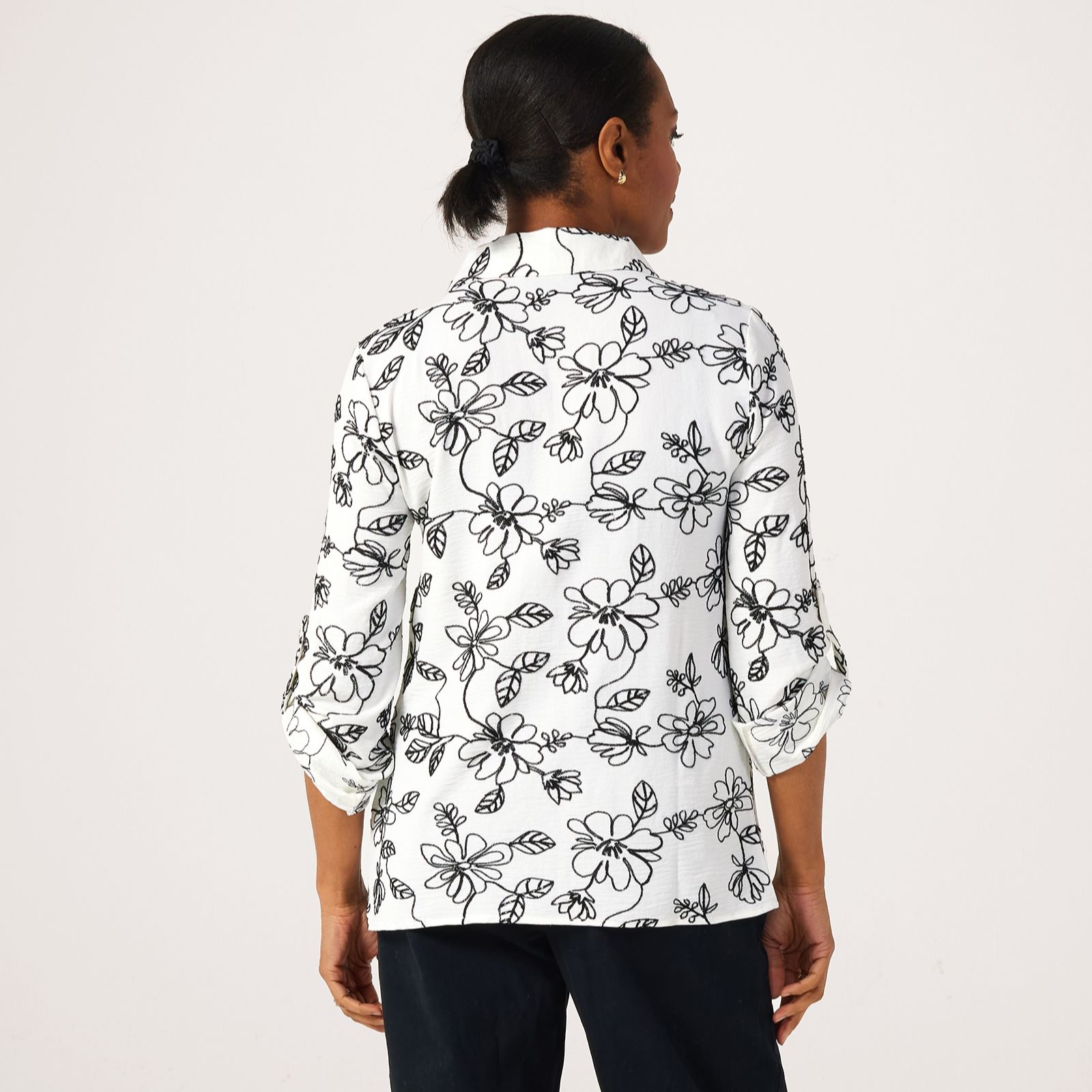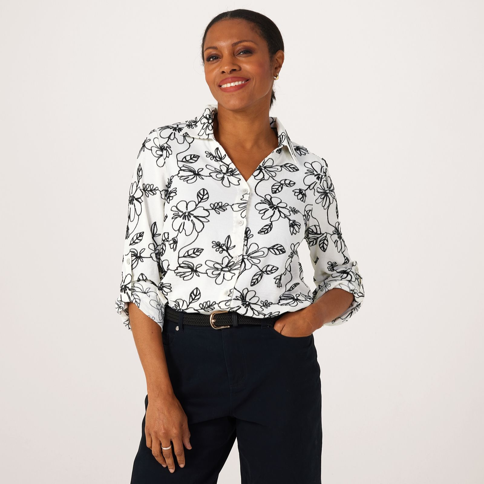 Elevate your wardrobe with the Nina Leonard tab sleeve embroidered shirt. This hip-length shirt features intricate embroidery, a split neck shirt collar and button front placket, offering an elegant yet relaxed style. The 3/4 roll-tab sleeves add versatility, making it perfect for both casual and more polished occasions. Pair it with tailored trousers for an office-ready look or with jeans for a weekend outing.