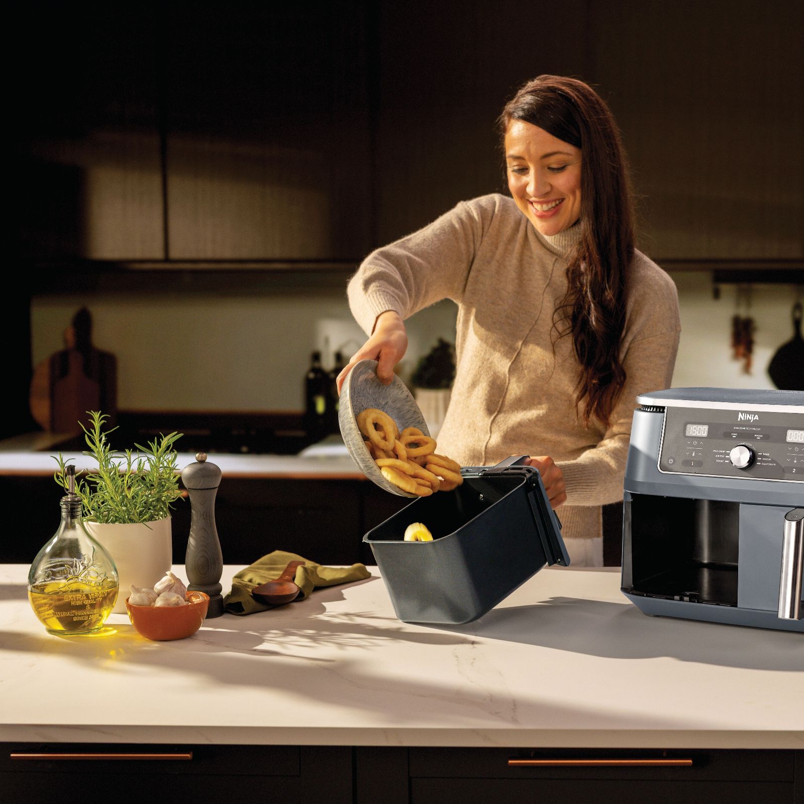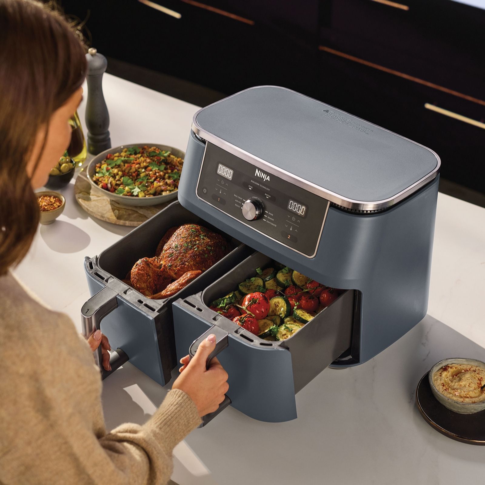 - the dual independent cooking zones let you prepare mains and sides together. With the SYNC function, you can cook two meals in two different ways and finish exactly at the same time. And with MATCH mode, you can copy your settings across both drawers perfect for doubling your serving size or cooking two different foods with the same instructions.