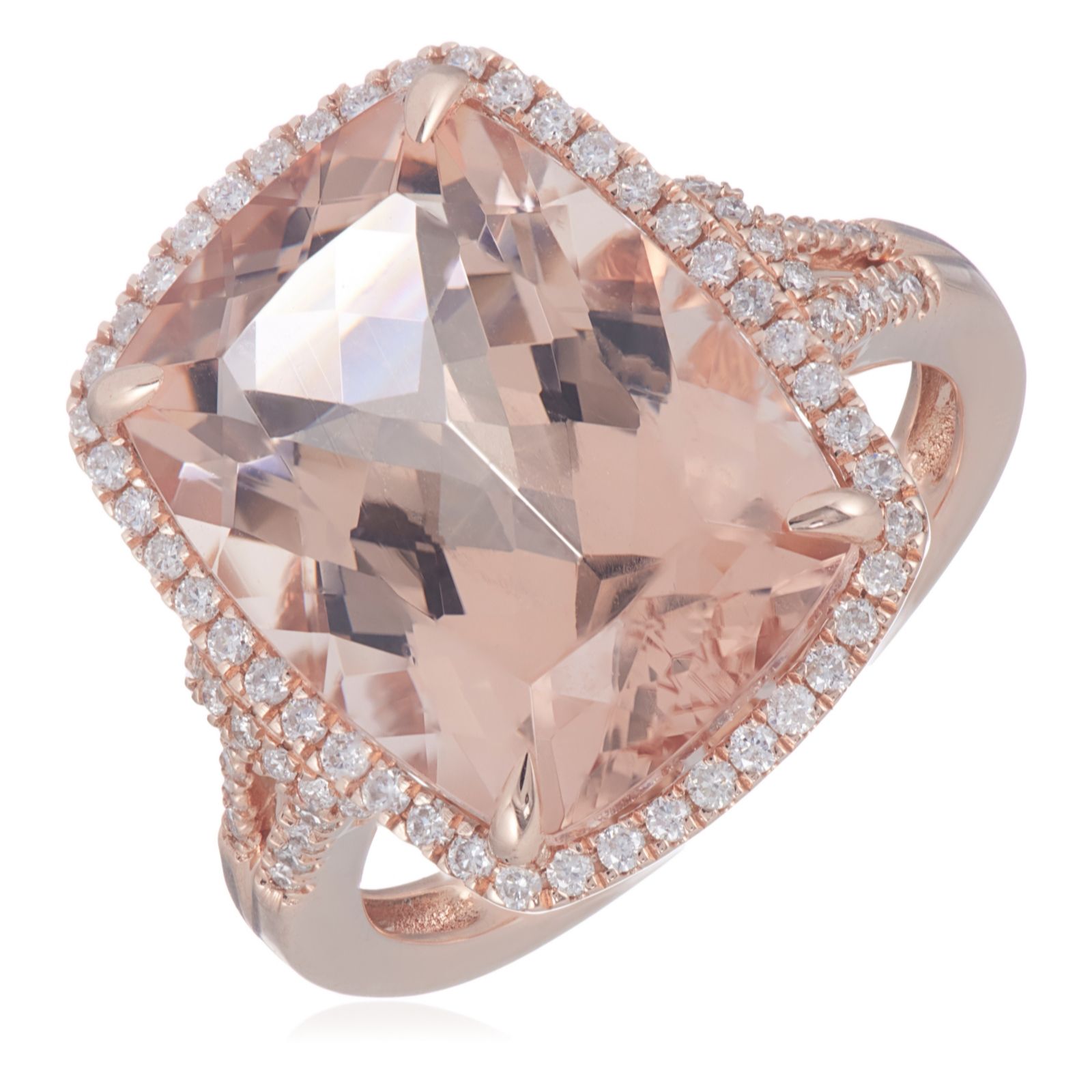 Bring a touch of opulence to your jewellery collection with this made-to-order ring from Oisha, showcasing a breathtaking cushion-cut morganite centre stone set in warm 14 carat rose gold. Accented by a halo and shoulders of twinkling round brilliant-cut white diamonds, this elegant piece seamlessly blends sophistication and sparkle, making it a perfect choice for memorable occasions or everyday luxury.