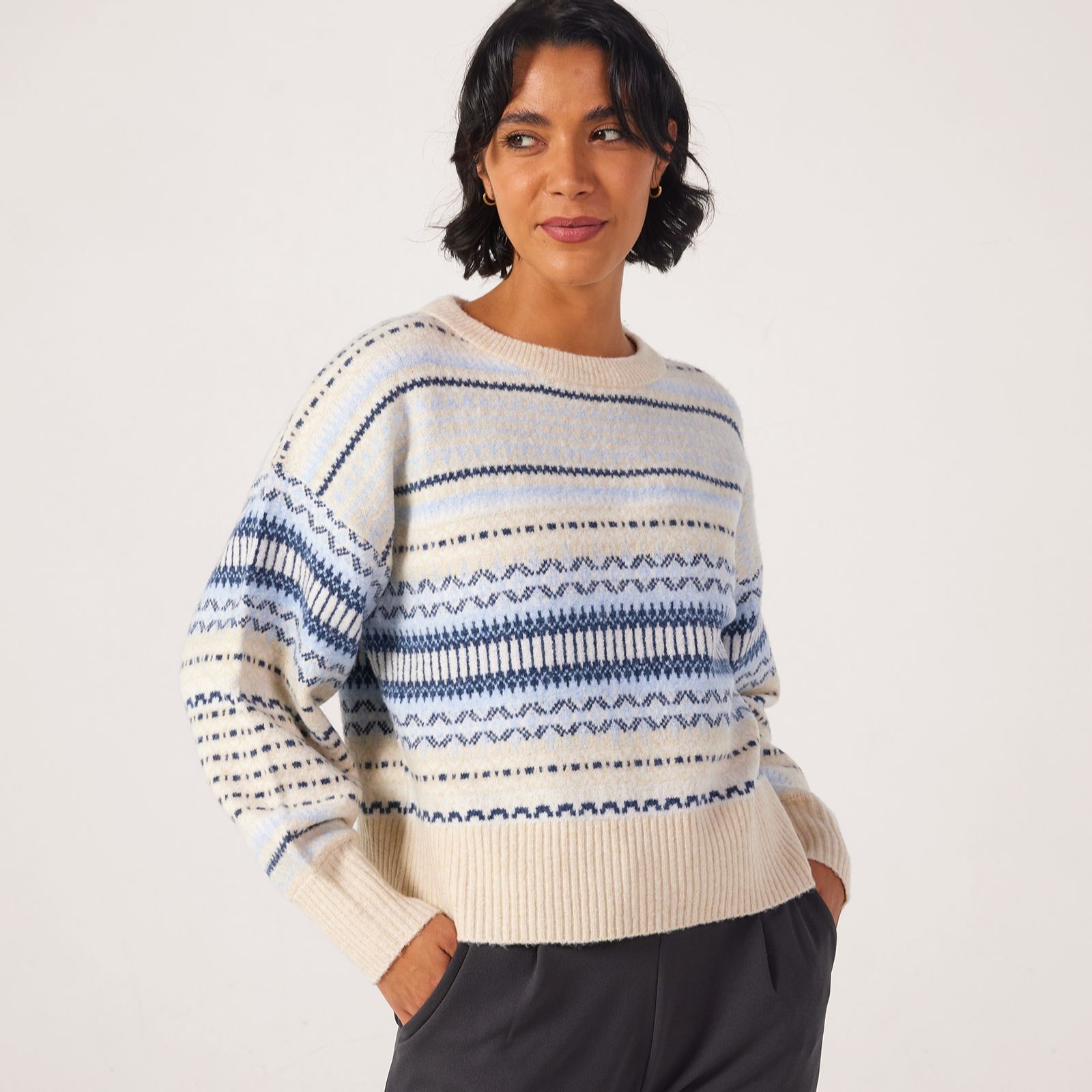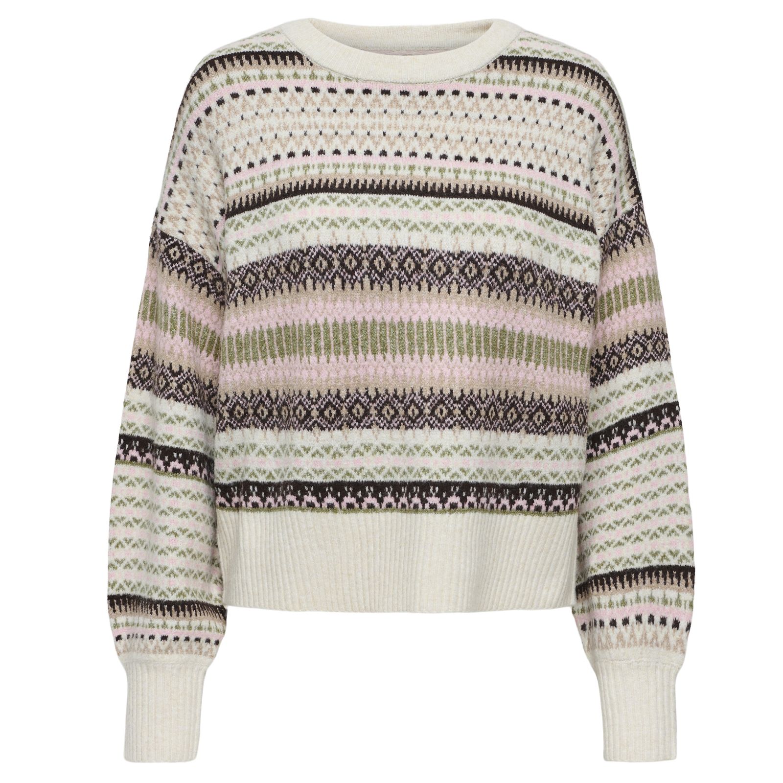 Bring a playful touch to your everyday style with the Arianne Fairisle Jumper from Only. This knitted pullover showcases a charming Fairisle pattern, dropped shoulders, and high cuffs, creating a relaxed yet polished look that's perfect for school runs, office days, or weekend outings. Pair it with your favourite jeans or a tailored skirt for an effortlessly chic ensemble.