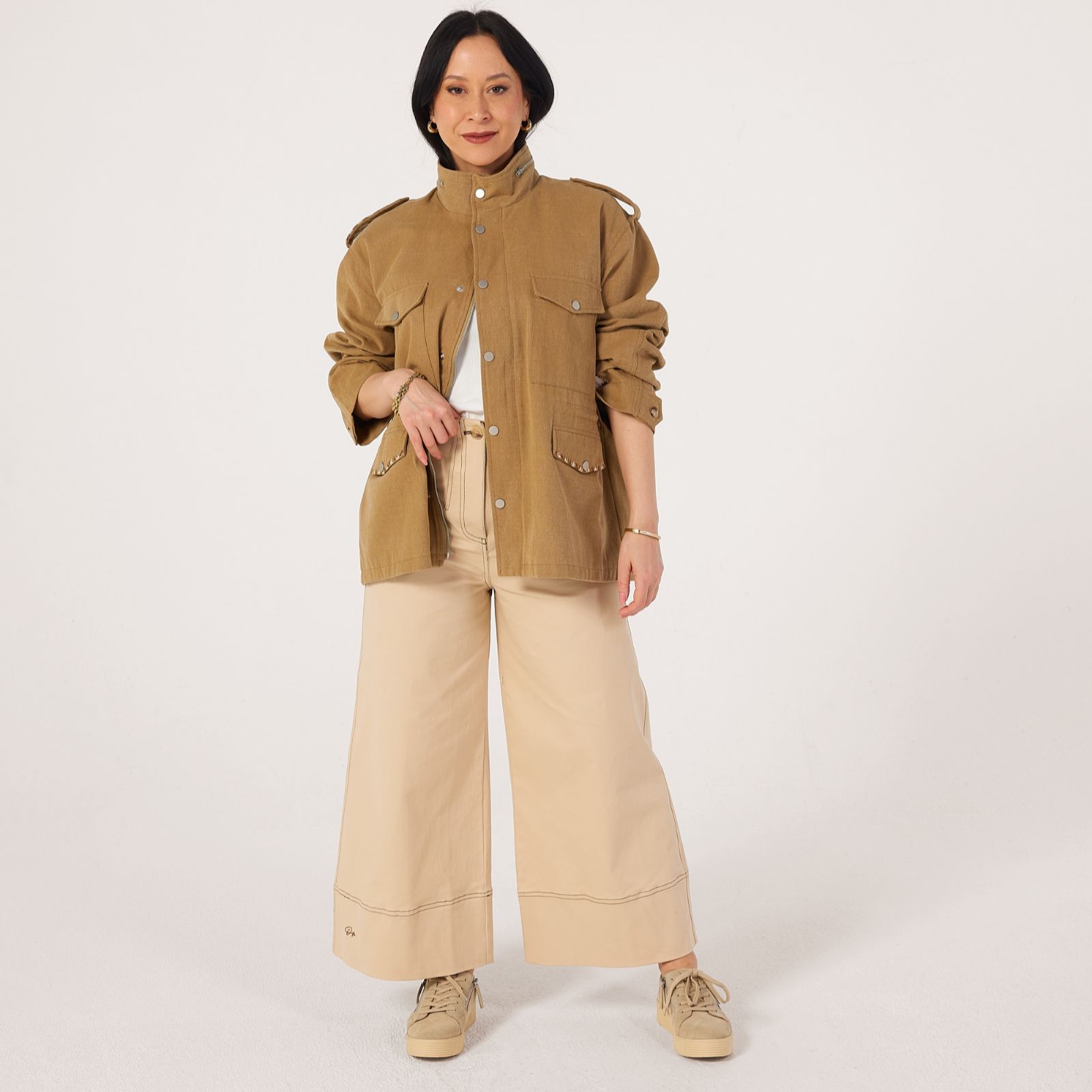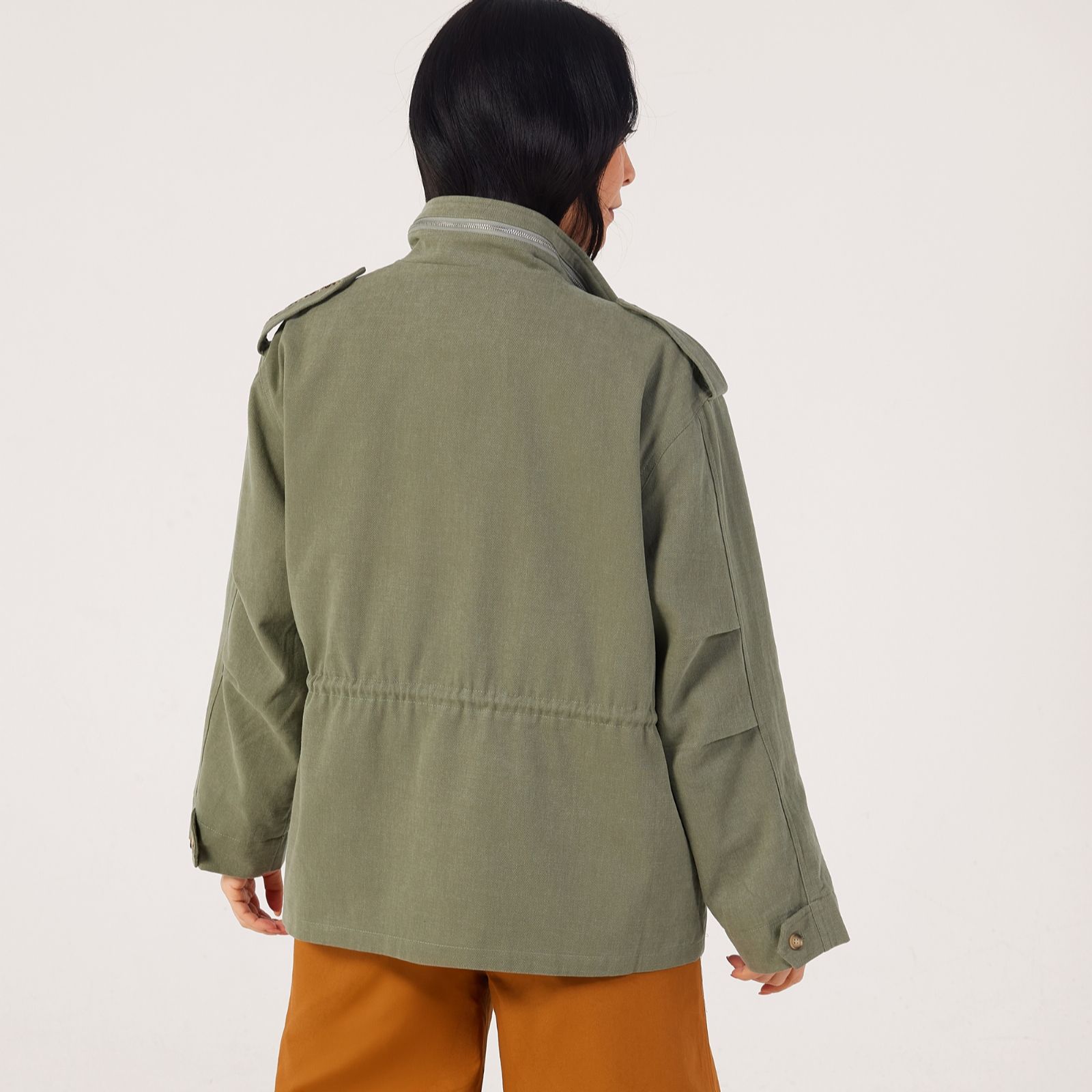 - Stand collar with snaps and hidden zip