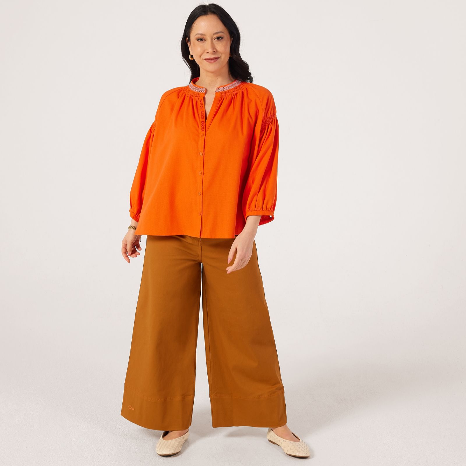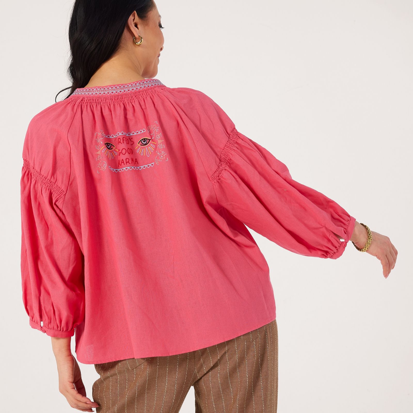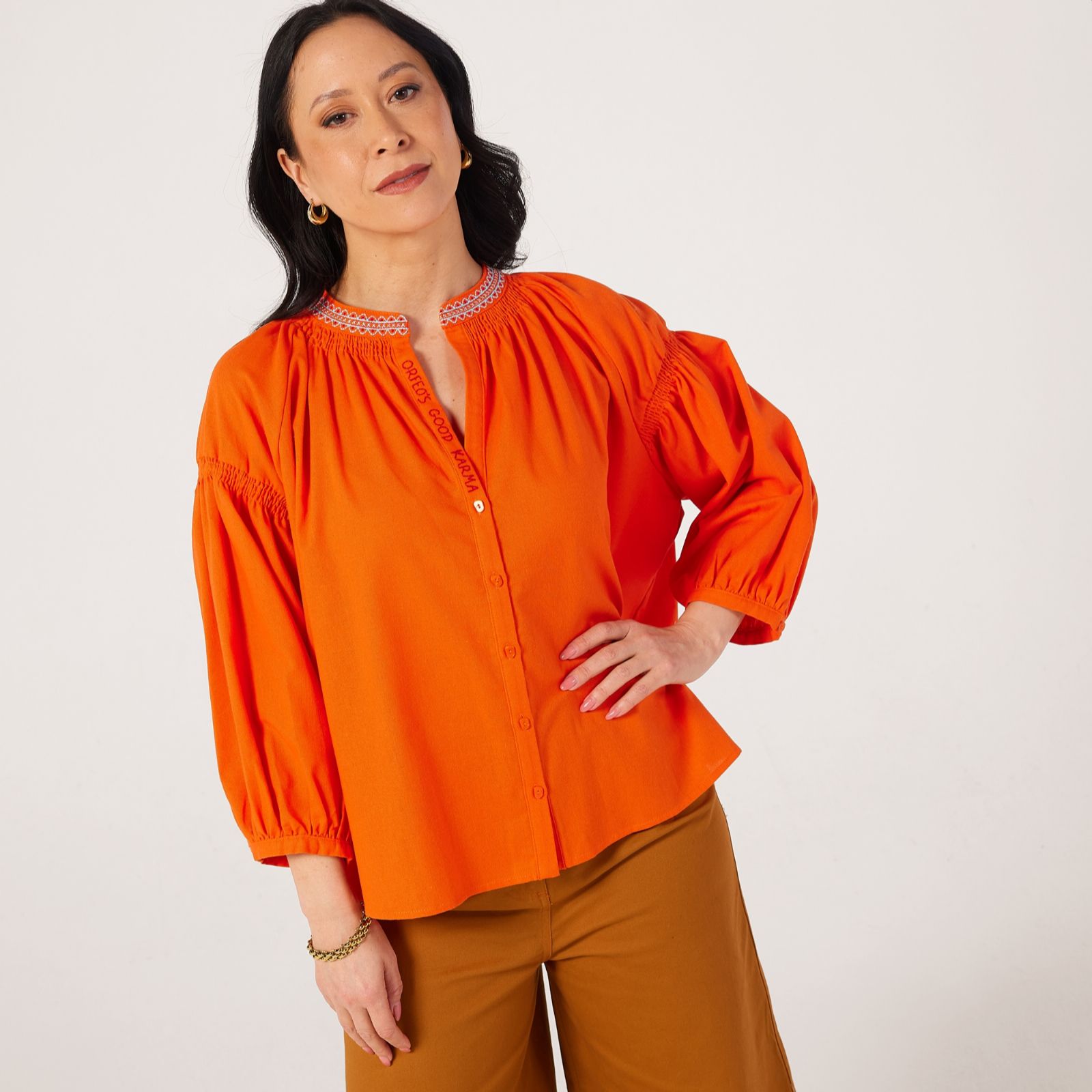 Radiating a touch of boho elegance, the Daniele blouse from Orfeo Paris is designed to catch the light with its fluid drape and relaxed silhouette. Featuring a buttoned V-neckline adorned with 'Good Karma' embroidery, airy 3/4 balloon sleeves, and a gathered back yoke, its as charming from the back as it is from the front thanks to its placed embroidery detail. Perfect for casual days or dressed-up evenings, it pairs beautifully with tailored trousers or denim for effortless style.