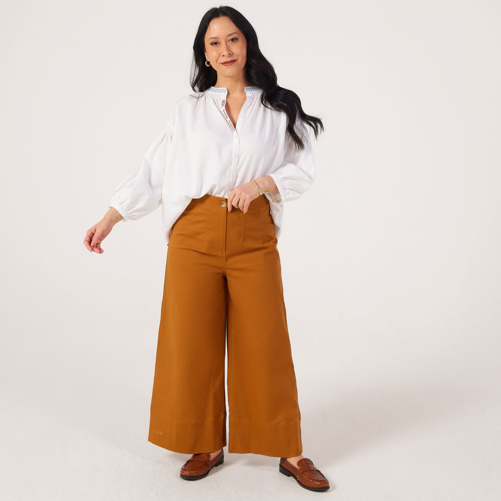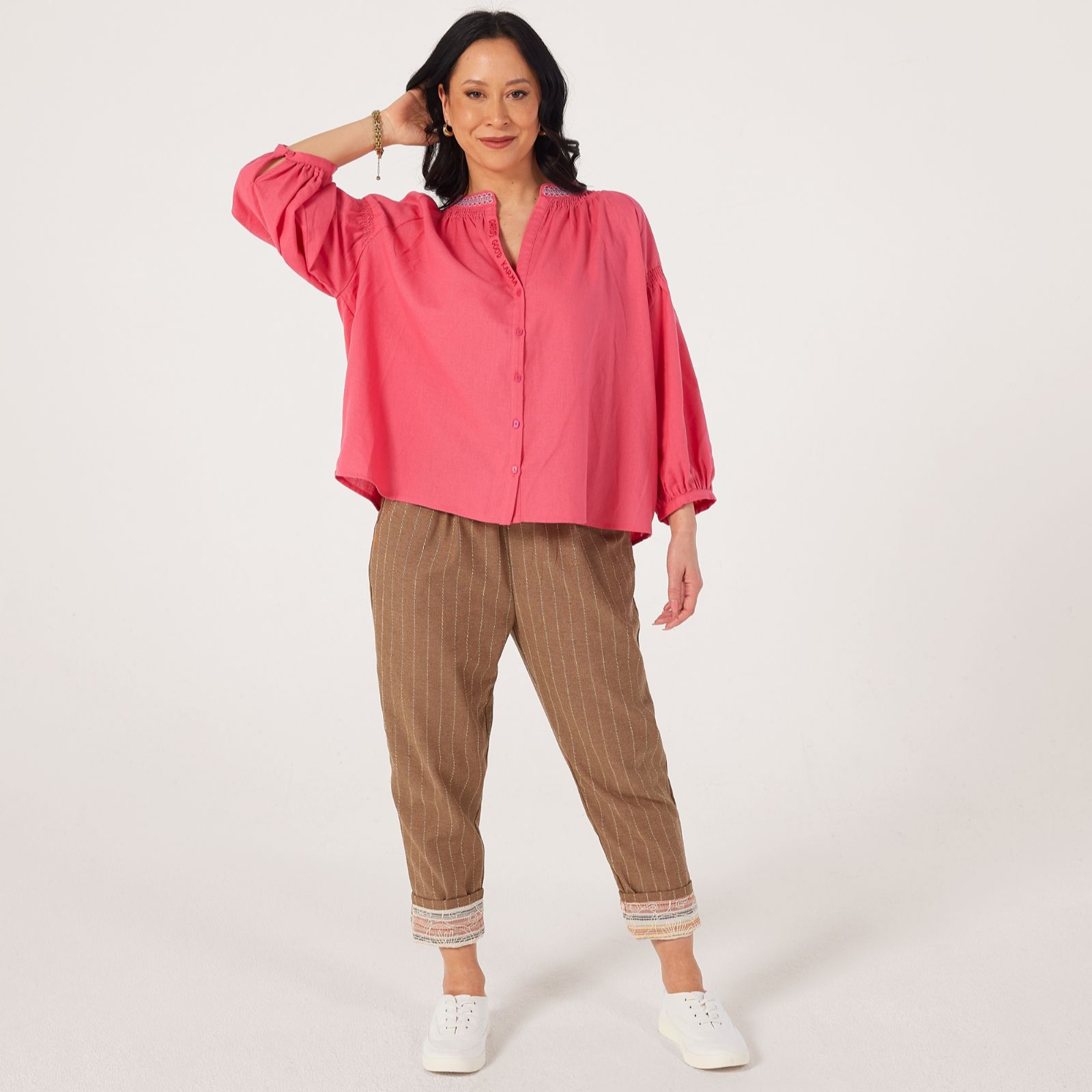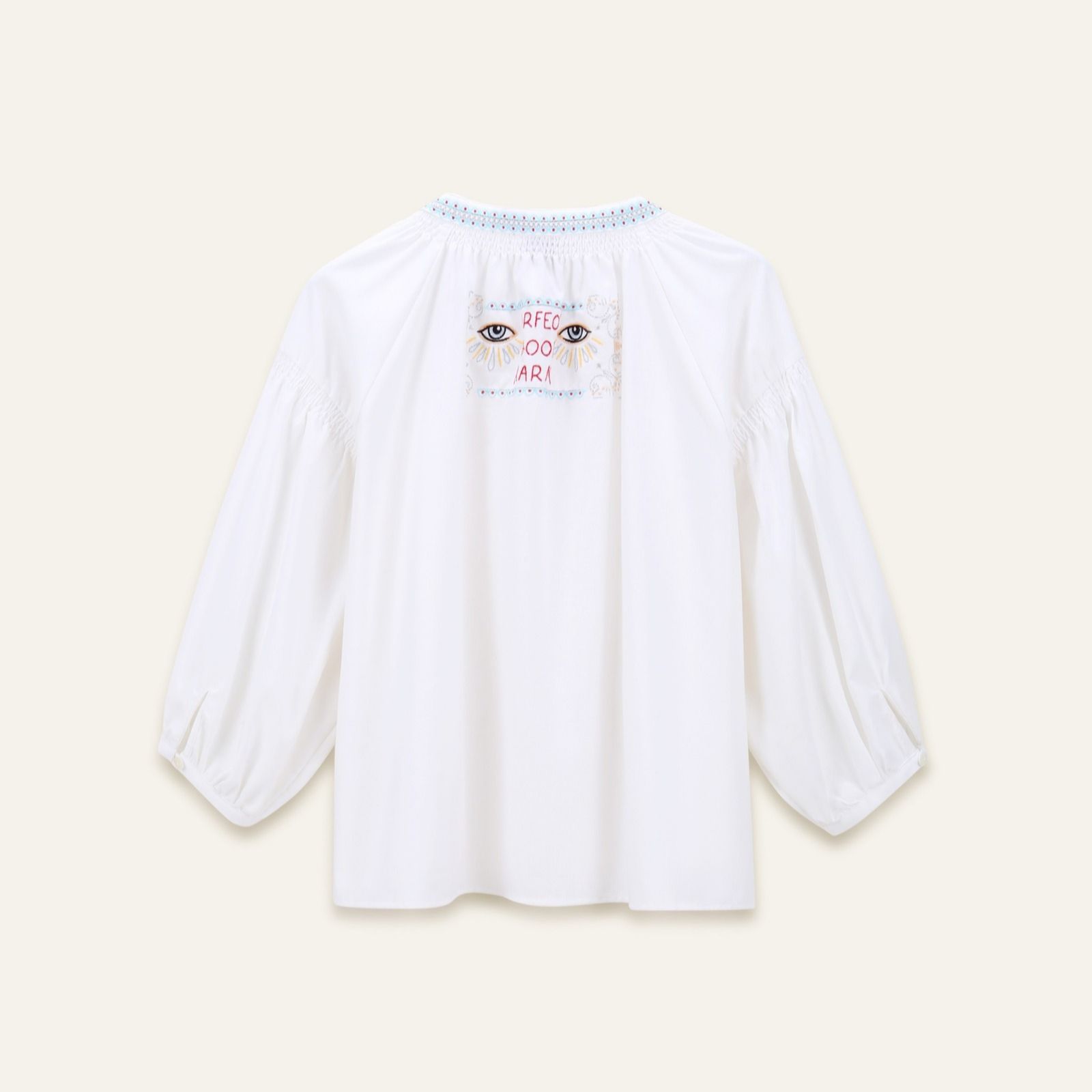 Radiating a touch of boho elegance, the Daniele blouse from Orfeo Paris is designed to catch the light with its fluid drape and relaxed silhouette. Featuring a buttoned V-neckline adorned with 'Good Karma' embroidery, airy 3/4 balloon sleeves, and a gathered back yoke, its as charming from the back as it is from the front thanks to its placed embroidery detail. Perfect for casual days or dressed-up evenings, it pairs beautifully with tailored trousers or denim for effortless style.