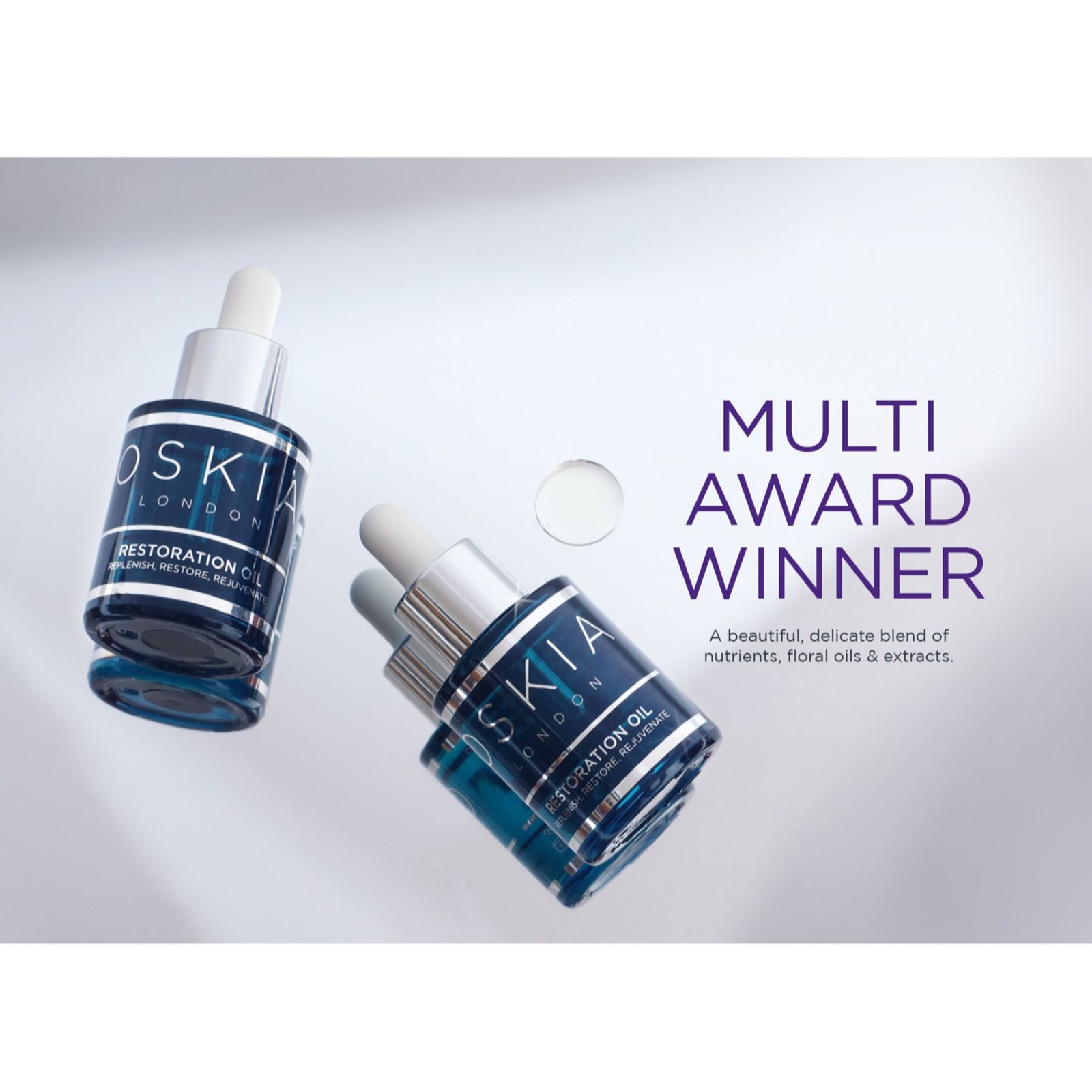 - 1 x Restoration Oil (30ml) – a delicate blend of floral oils and botanical extracts including acmella flower, sea fennel, lupin seed oil, algae extract, rice bran oil, turmeric, starflower, sunflower seed and evening primrose oil, plus rose hip seed oil
