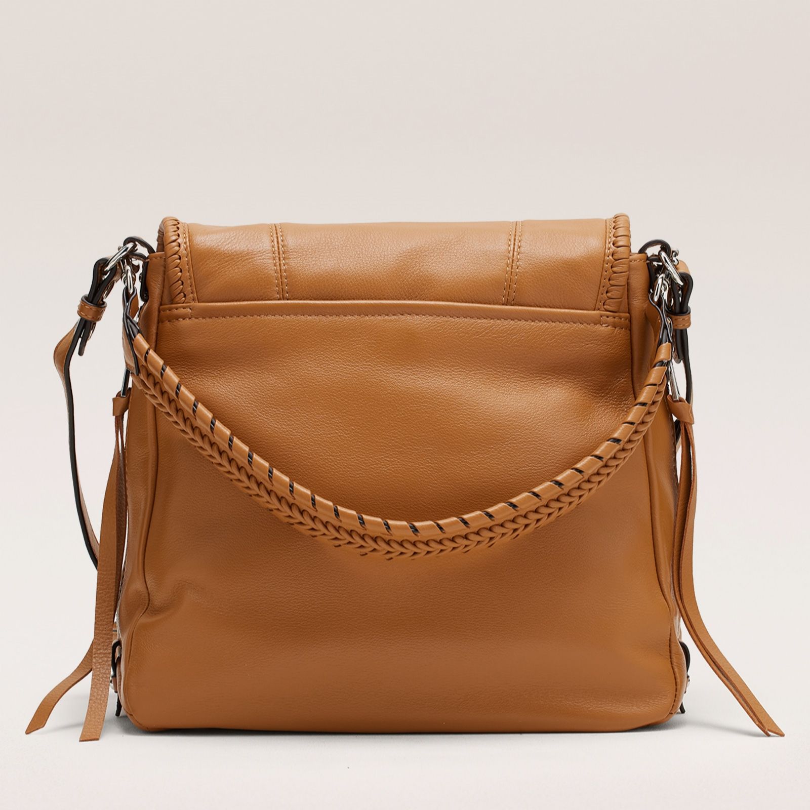 - Exterior: 1 slip pocket, flap entry with magnetic snap, 2 zip pockets, removable shoulder strap, adjustable and removable cross-body strap, dome stud feet