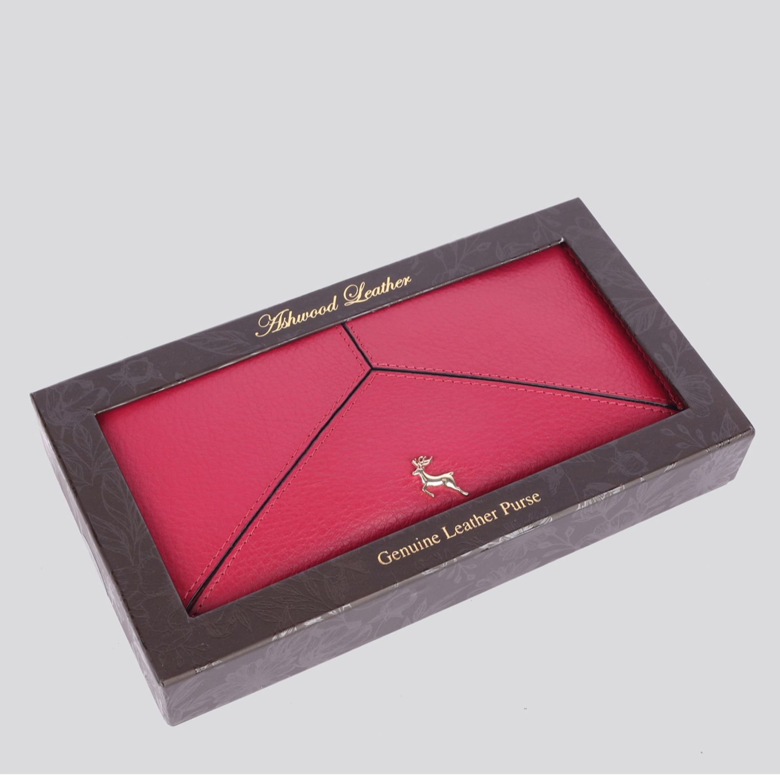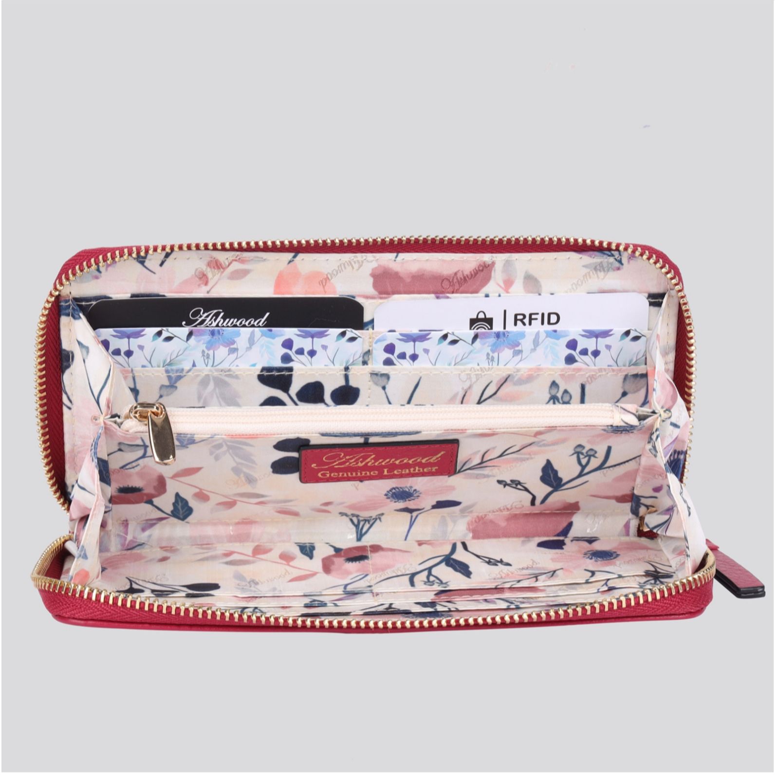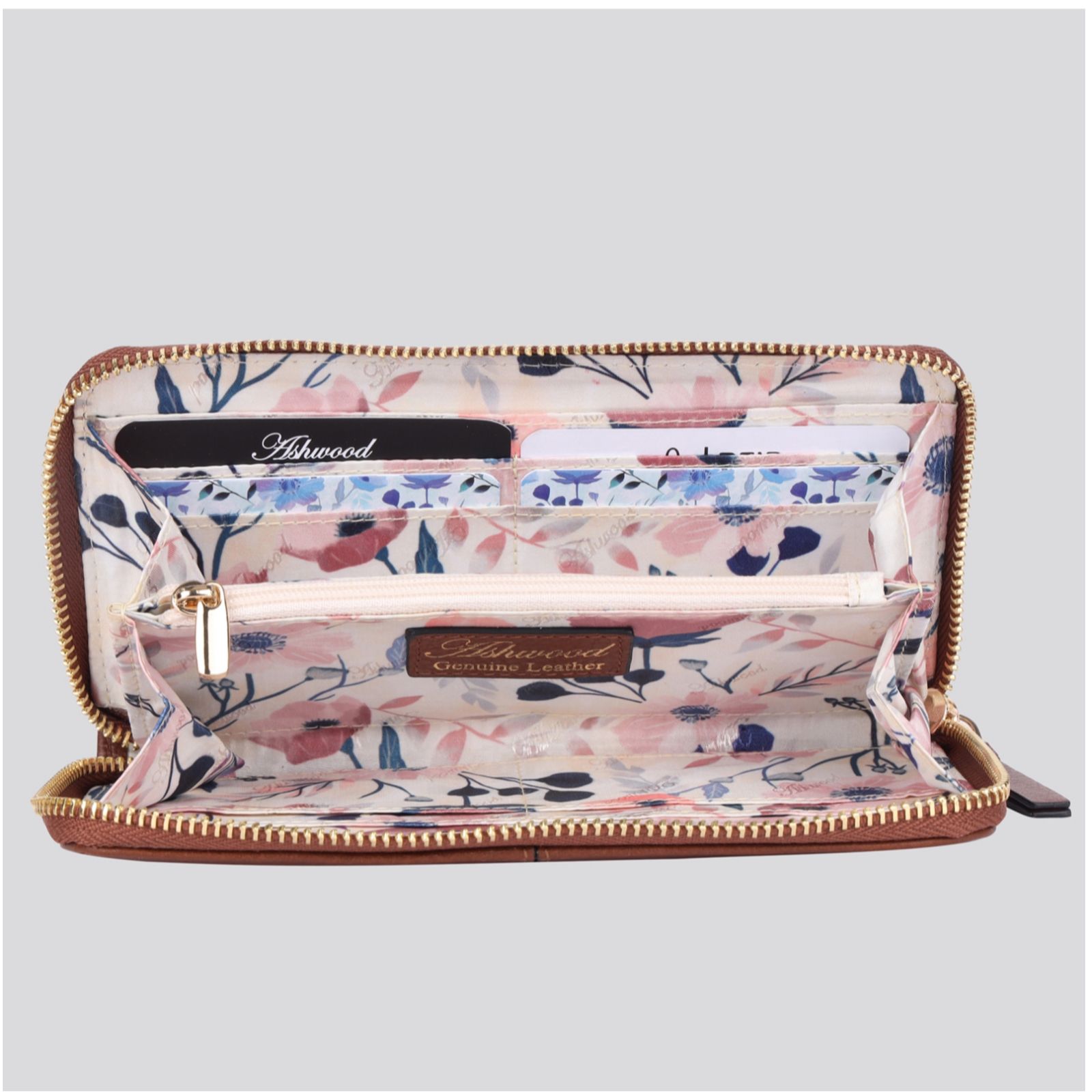 Exude timeless sophistication with the leather boxed purse from Ashwood, crafted with a beautiful floral jacquard lining. Designed with a zip-around closure, twin gusseted compartments and a central zip pocket, it keeps cards, notes and receipts neatly organised while offering RFID protection. Perfect for everyday use or gifting, it's a stylish companion that blends practicality with elegance.