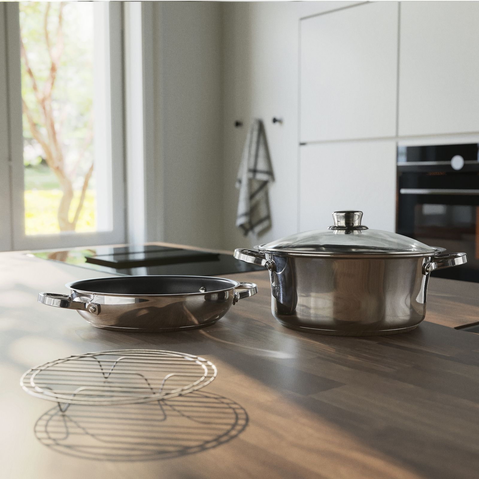 - stewing, boiling, steaming, frying, braising, even baking - there's little that this wonderfully versatile cookware set cannot do. You can even use the grill pan as a heavy lid for your stockpot for waterless cooking.
