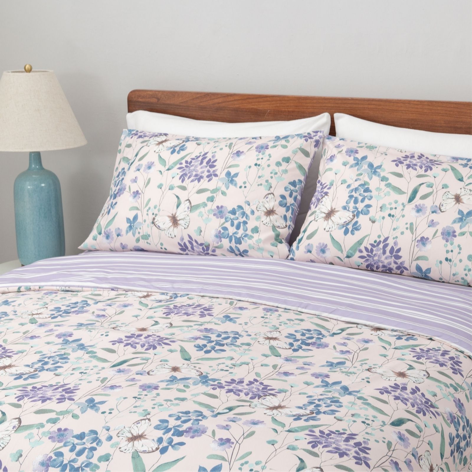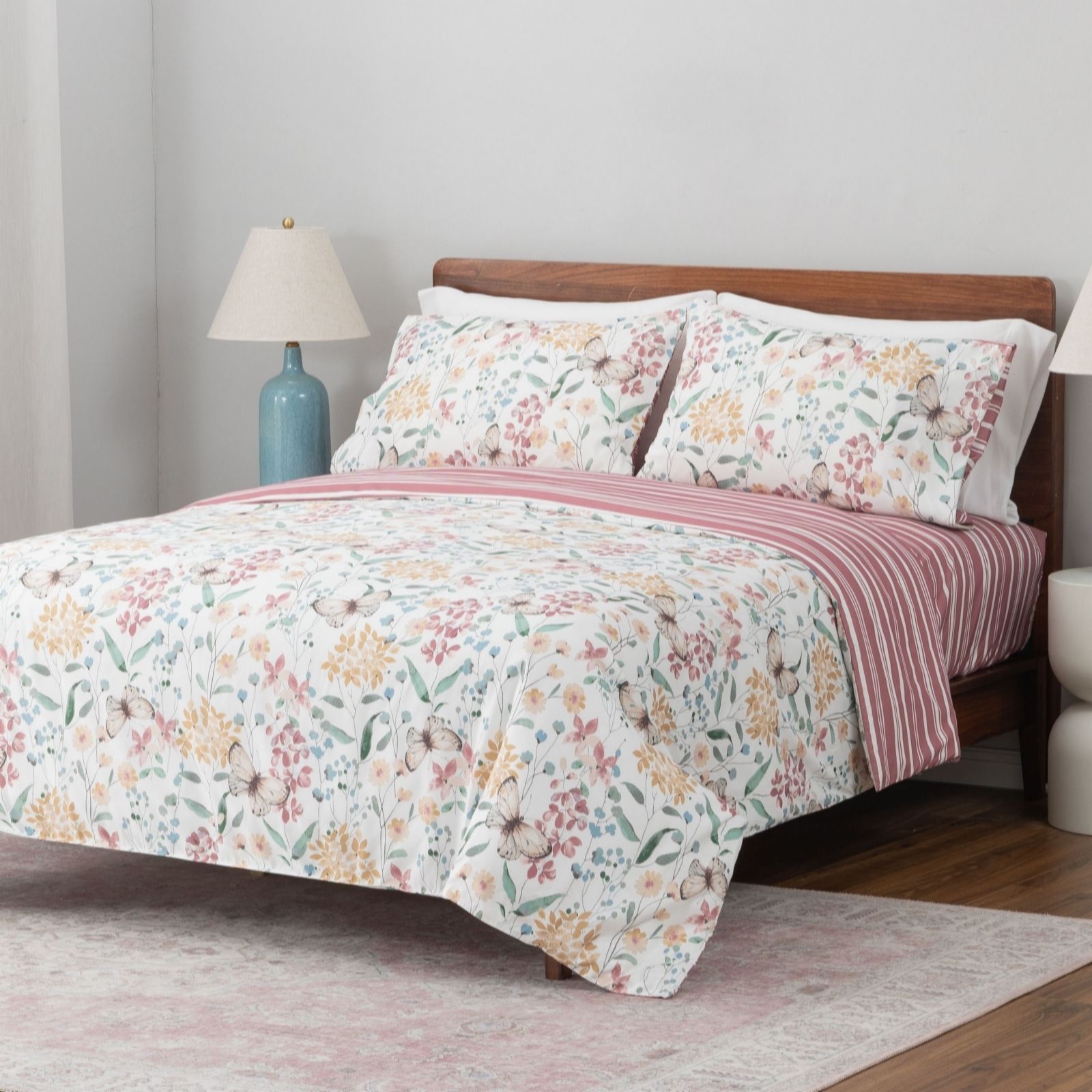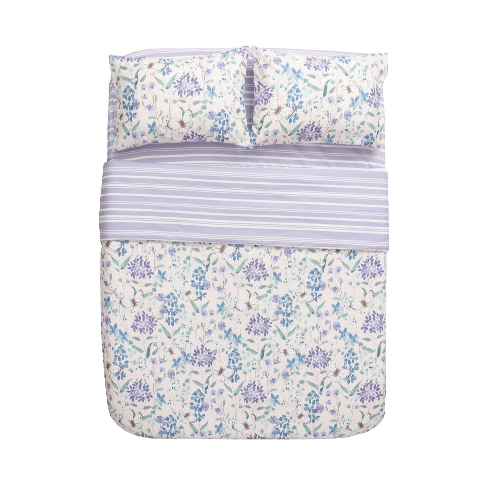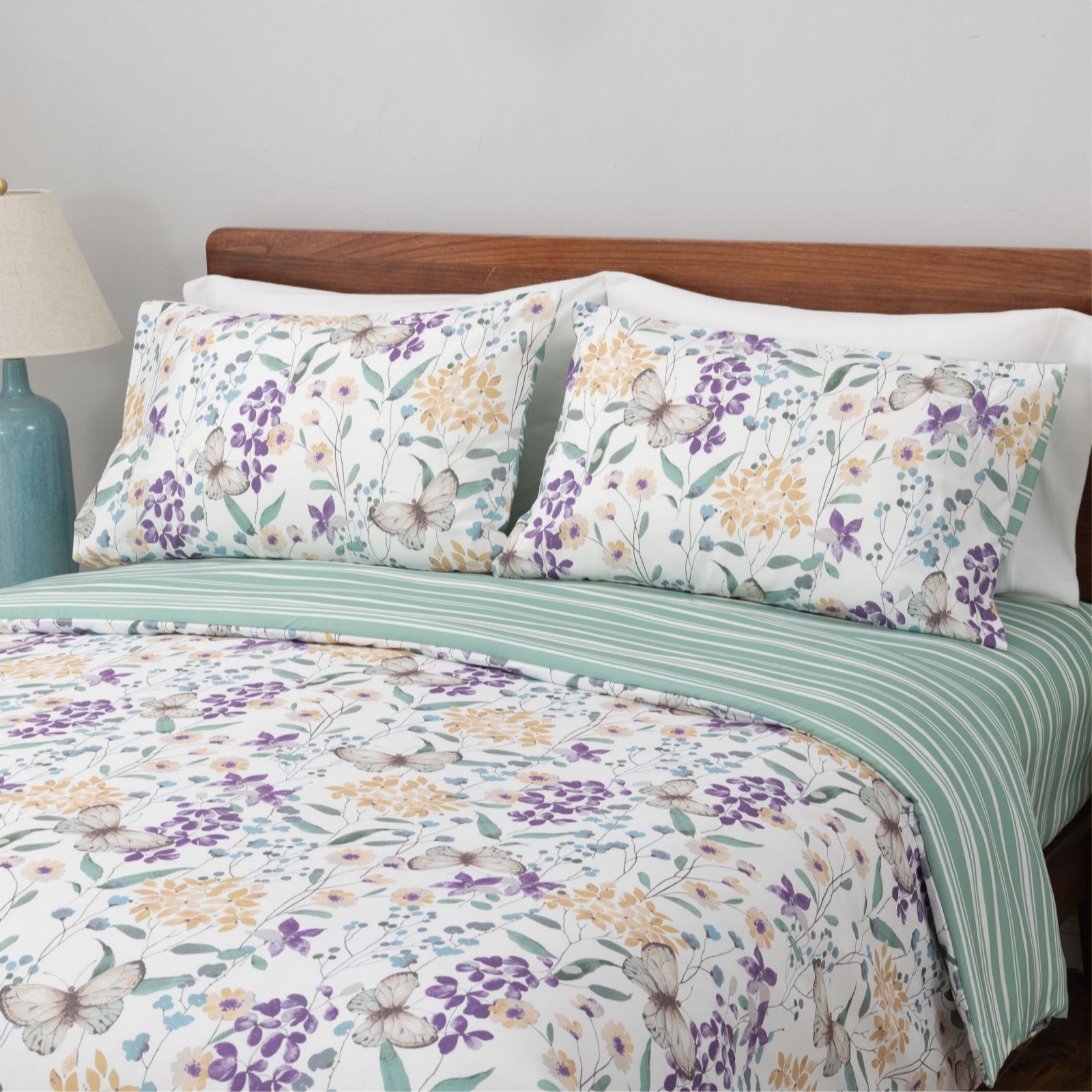 Transform your bedroom into a serene retreat with the Reversible Butterfly Floral 4 Piece Duvet Set from Cozee Home. This enchanting set includes a duvet cover, two pillowcases, and a fitted sheet, all made from 100% polyester. The duvet cover and pillowcases showcase a delightful Butterfly Garden design on one side, with a Variegated Simple Stripe pattern on the reverse, offering versatility and style. Perfect for year-round comfort, it effortlessly enhances any bedroom decor with its charming aesthetics.