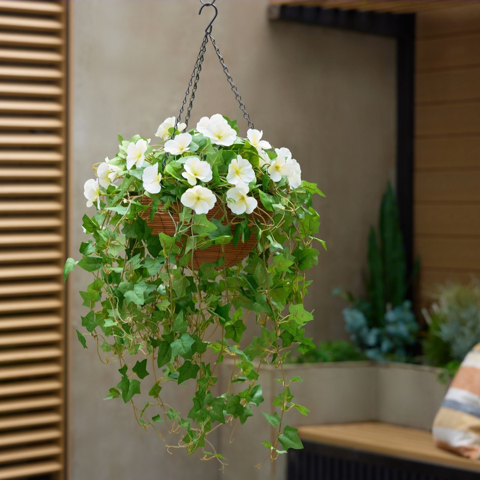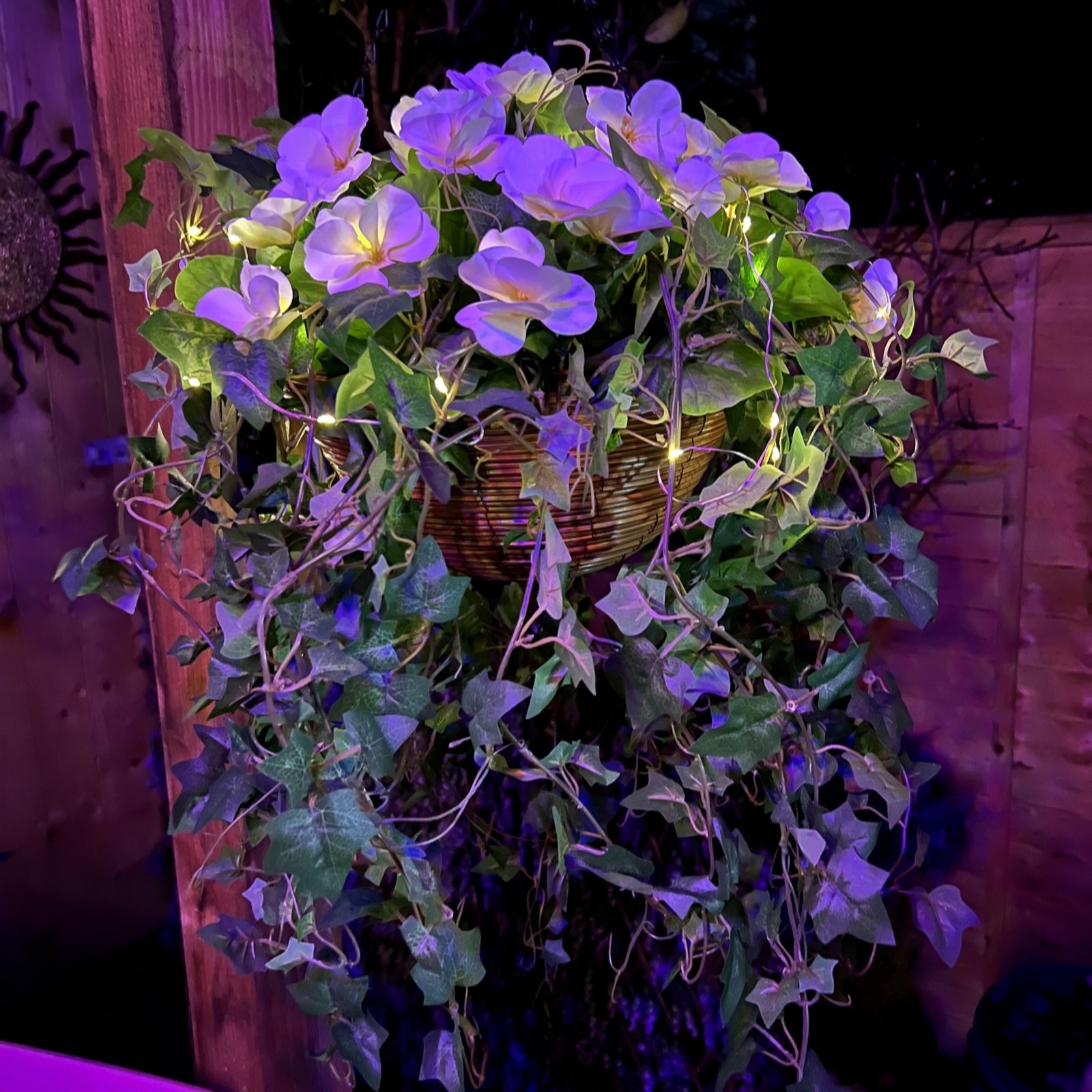 Beautify your outdoor space with this pre-lit faux pansy and trailing ivy hanging basket from Garden Reflections. Designed to instantly elevate any outdoor area with colour and style, this lifelike piece comes with battery-operated LED lights and a timer, ensuring a lovely glow through all seasons. Whether you're adorning a fence or enhancing your balcony, this charming hanging basket will infuse your space with elegance and warmth.