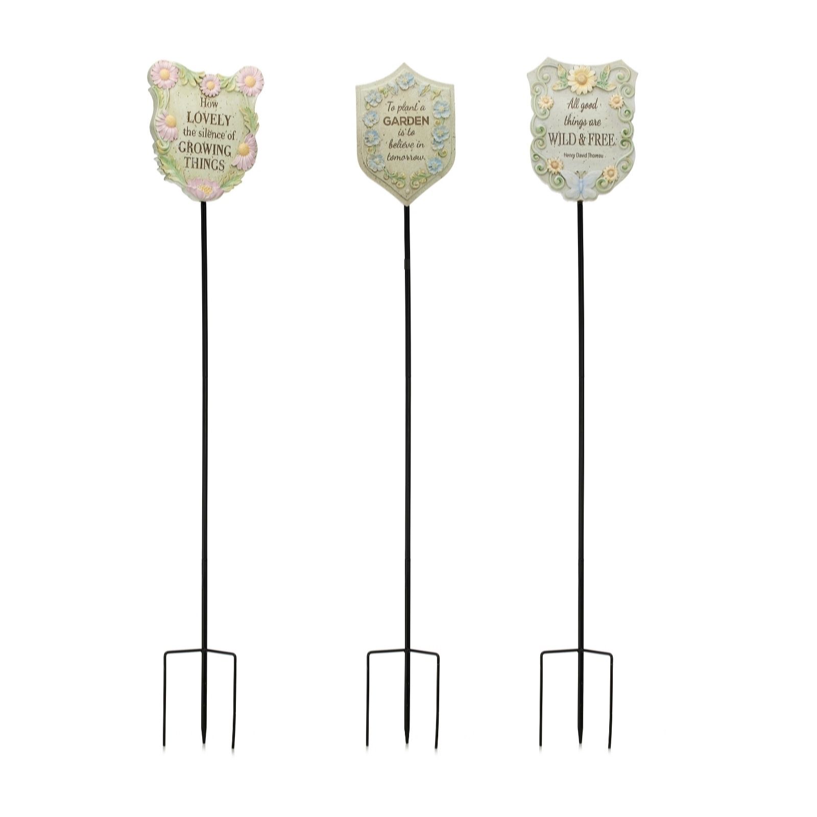 Add charm to your garden with the Garden Reflections Set of 3 Garden Sign Stakes. These beautifully crafted stakes from Garden Reflections feature intricate designs that bring a whimsical feel to any outdoor space. Made from a durable blend of polyresin, stonepowder, and iron, these stakes are perfect for flower beds, pathways, or planters. Ideal for avid gardeners or anyone looking to enhance their garden's aesthetic, these stakes are a delightful addition.