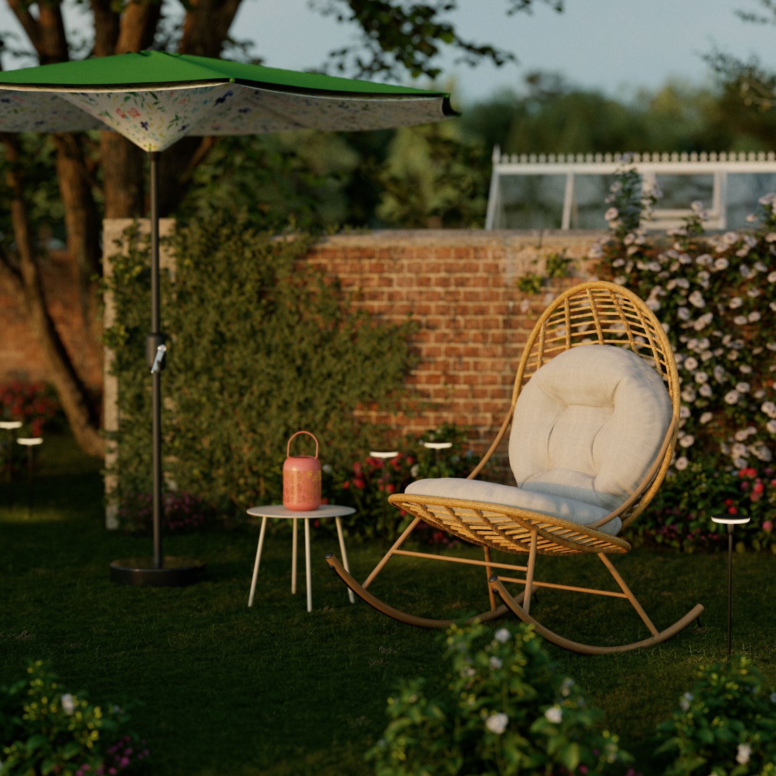 Bring charming country style and practical shade to your outdoor space with the garden umbrella from Garden Stories. Featuring a rustic floral print lining beneath a durable canopy, this parasol offers protection from the sun and light rain, plus a tilt function for flexible positioning. Perfect for summer gatherings, relaxing afternoons or al fresco dining, it opens effortlessly with a hand crank and adds an elegant touch to any patio or garden set-up.