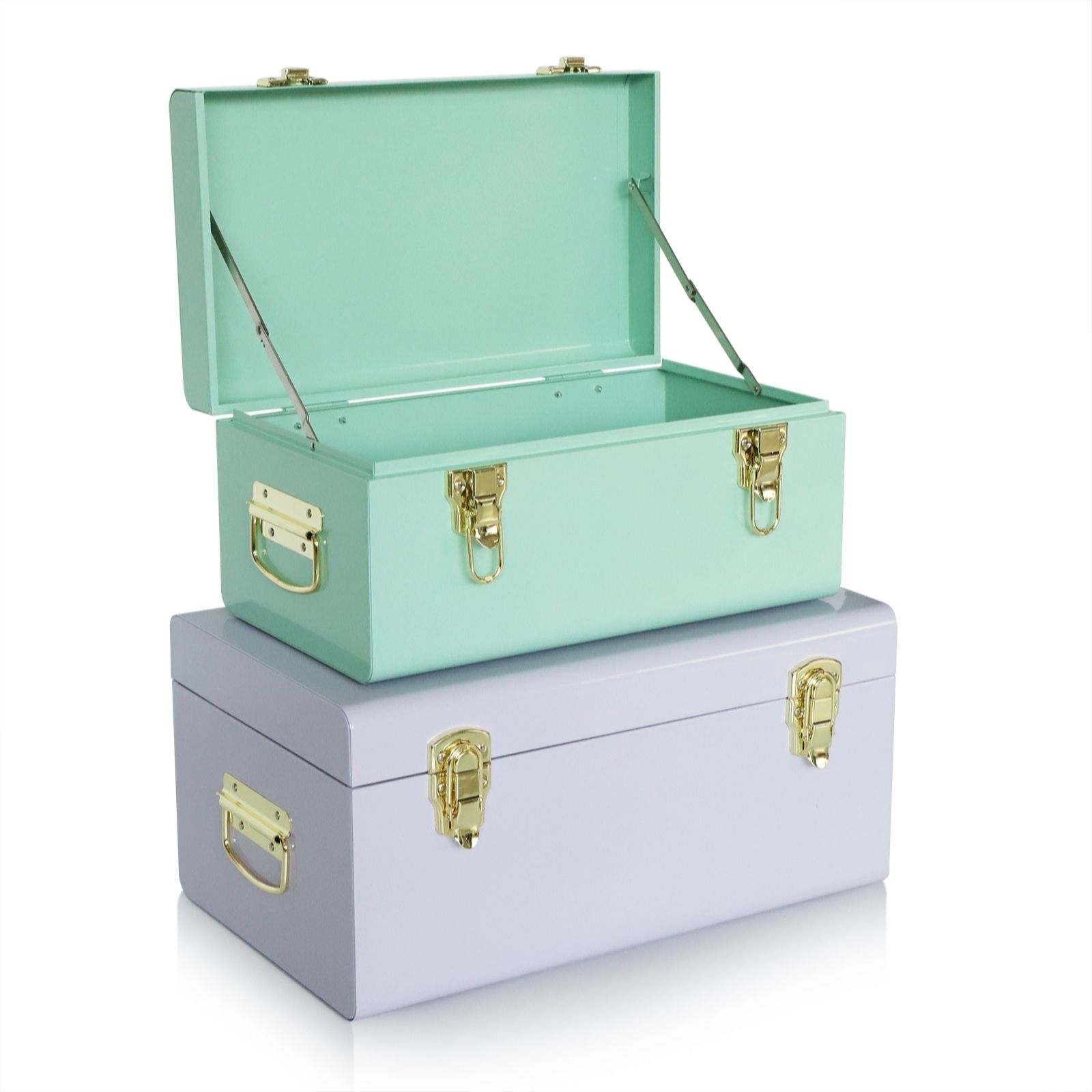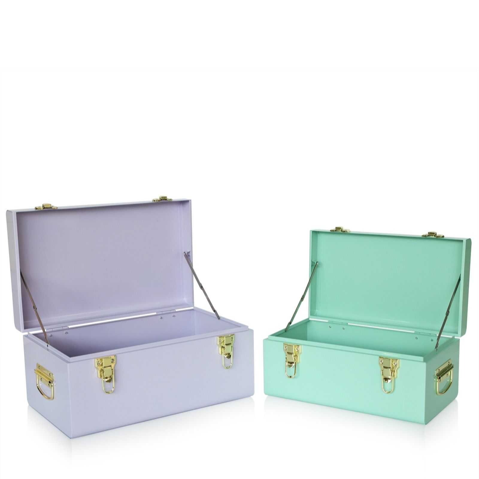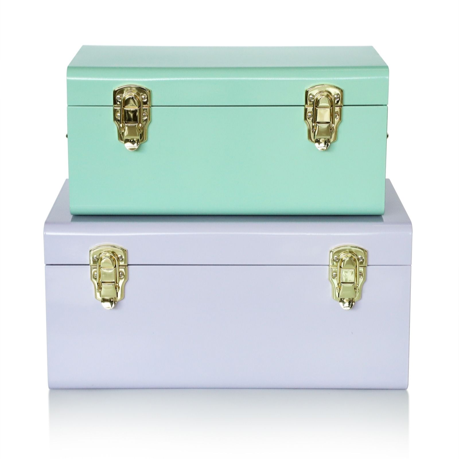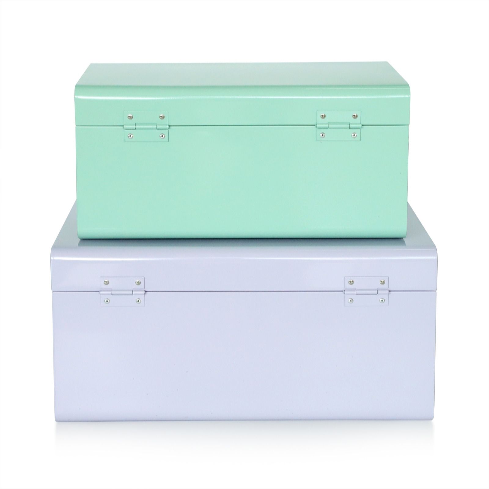 Add charm and functionality to your home with the Home Stories Sorbet Collection Set of 2 Metal Storage Trunks. These beautifully designed trunks feature a delightful mint green and pink finish, perfect for brightening up any room. Crafted from durable metal, they are ideal for storing linens, toys, and seasonal decorations. Use them individually or stack them together for both aesthetic appeal and practical storage solutions.