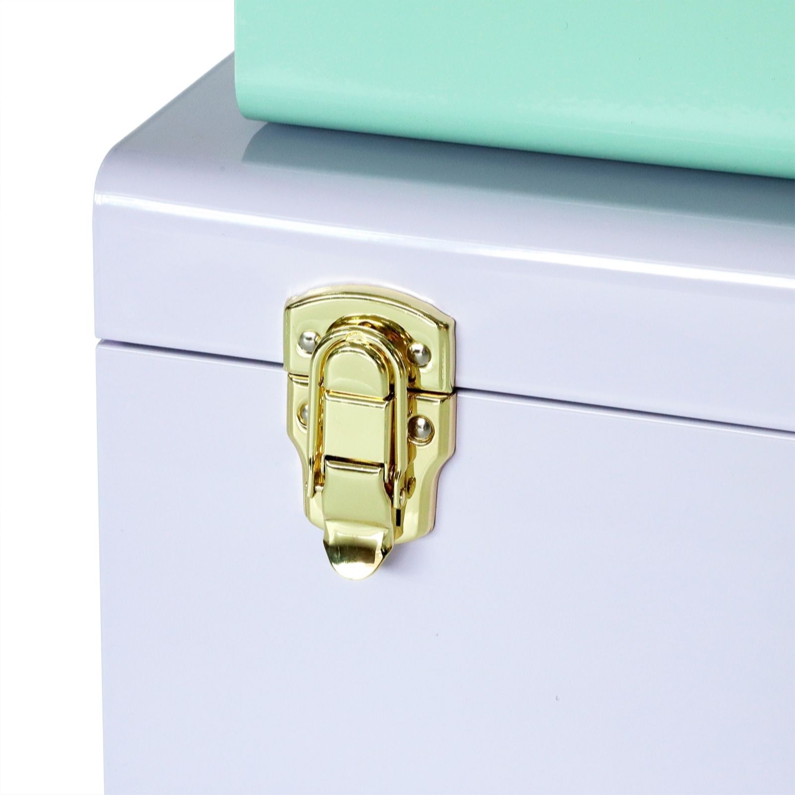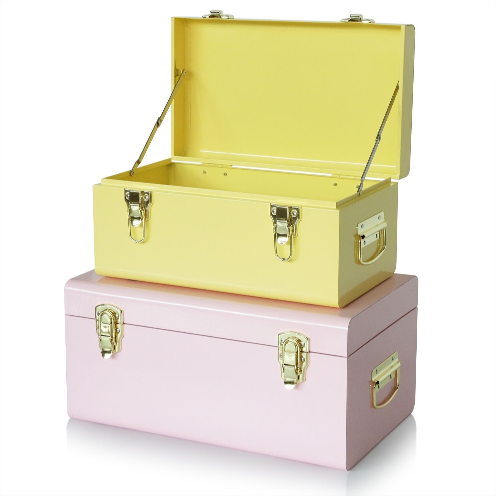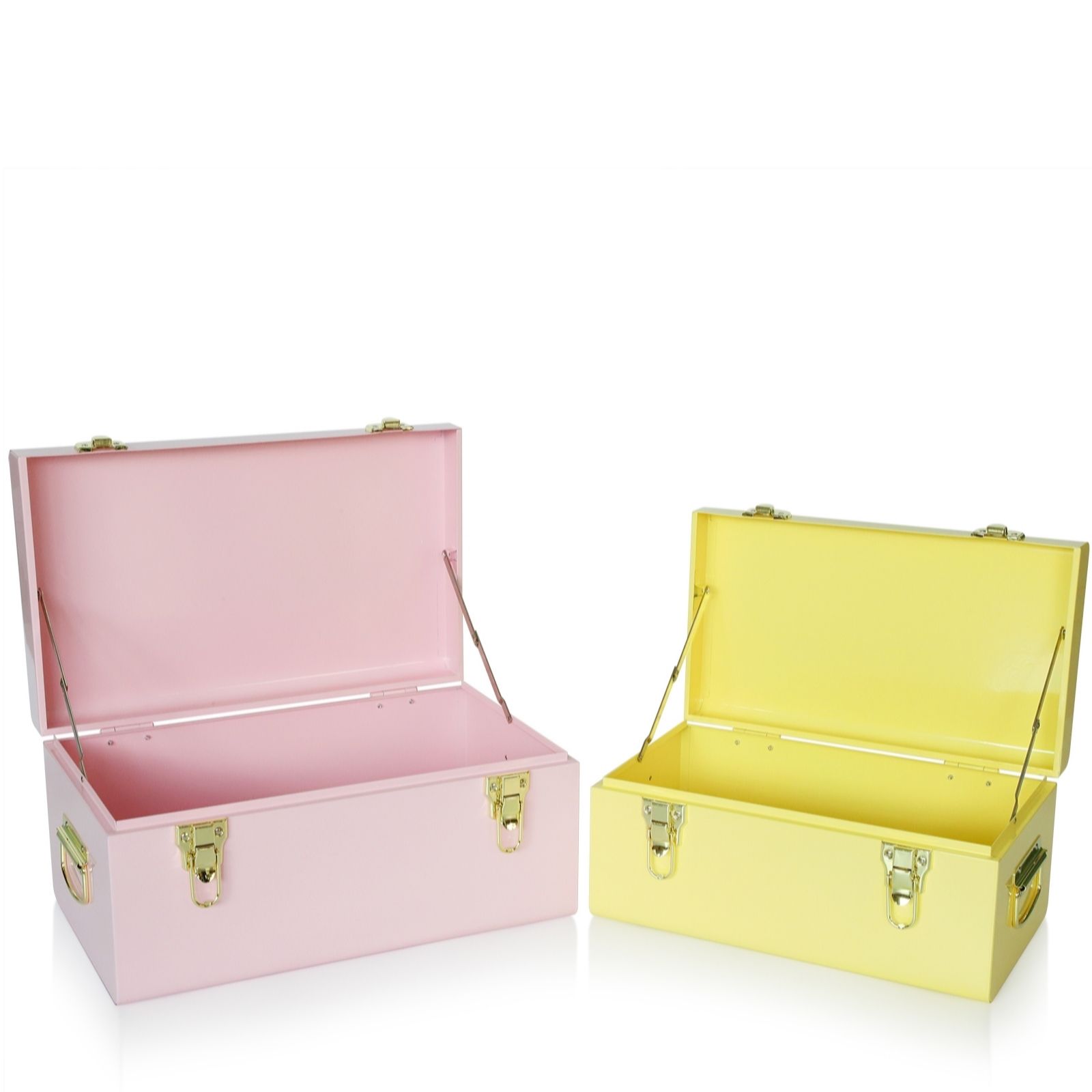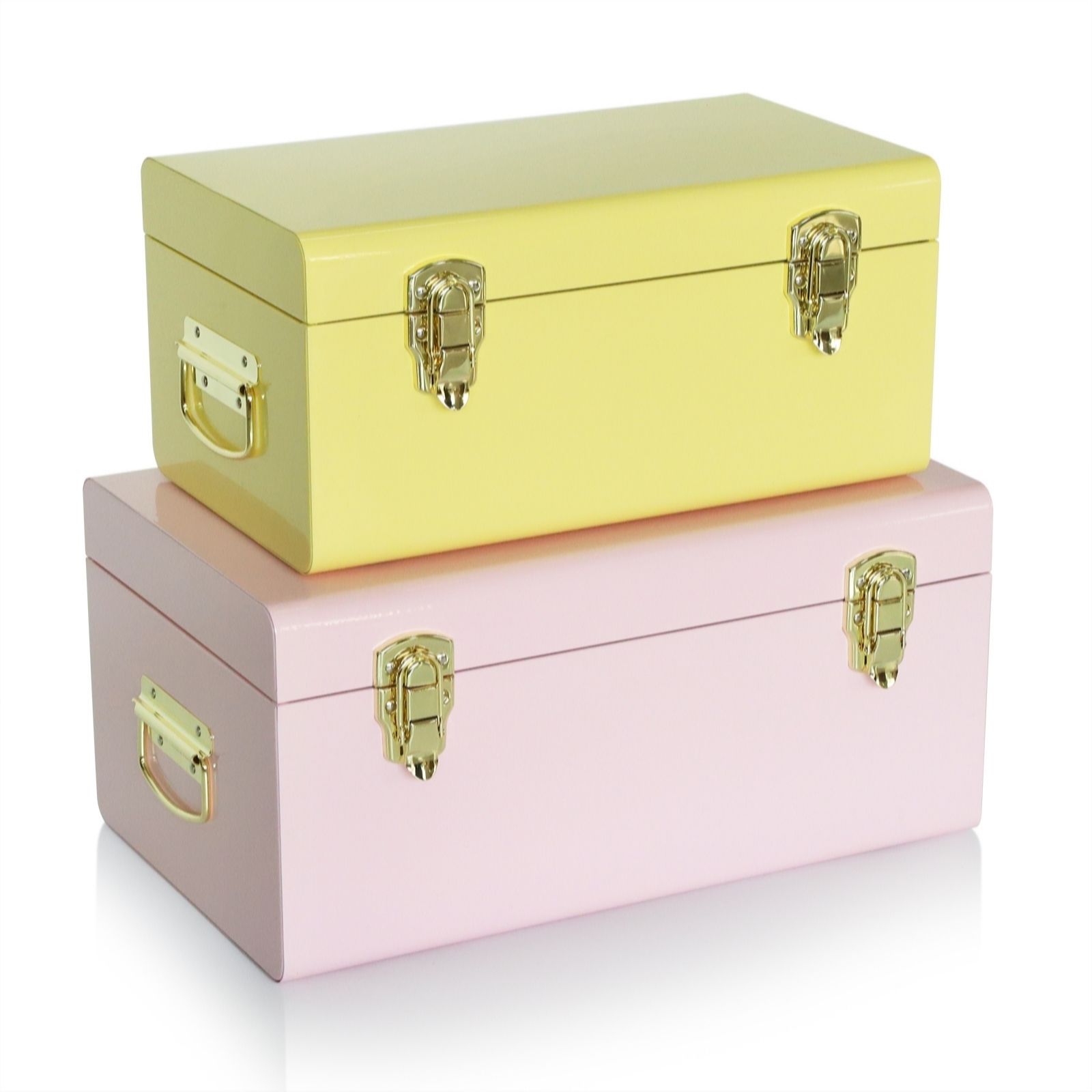 Add charm and functionality to your home with the Home Stories Sorbet Collection Set of 2 Metal Storage Trunks. These beautifully designed trunks feature a delightful mint green and pink finish, perfect for brightening up any room. Crafted from durable metal, they are ideal for storing linens, toys, and seasonal decorations. Use them individually or stack them together for both aesthetic appeal and practical storage solutions.