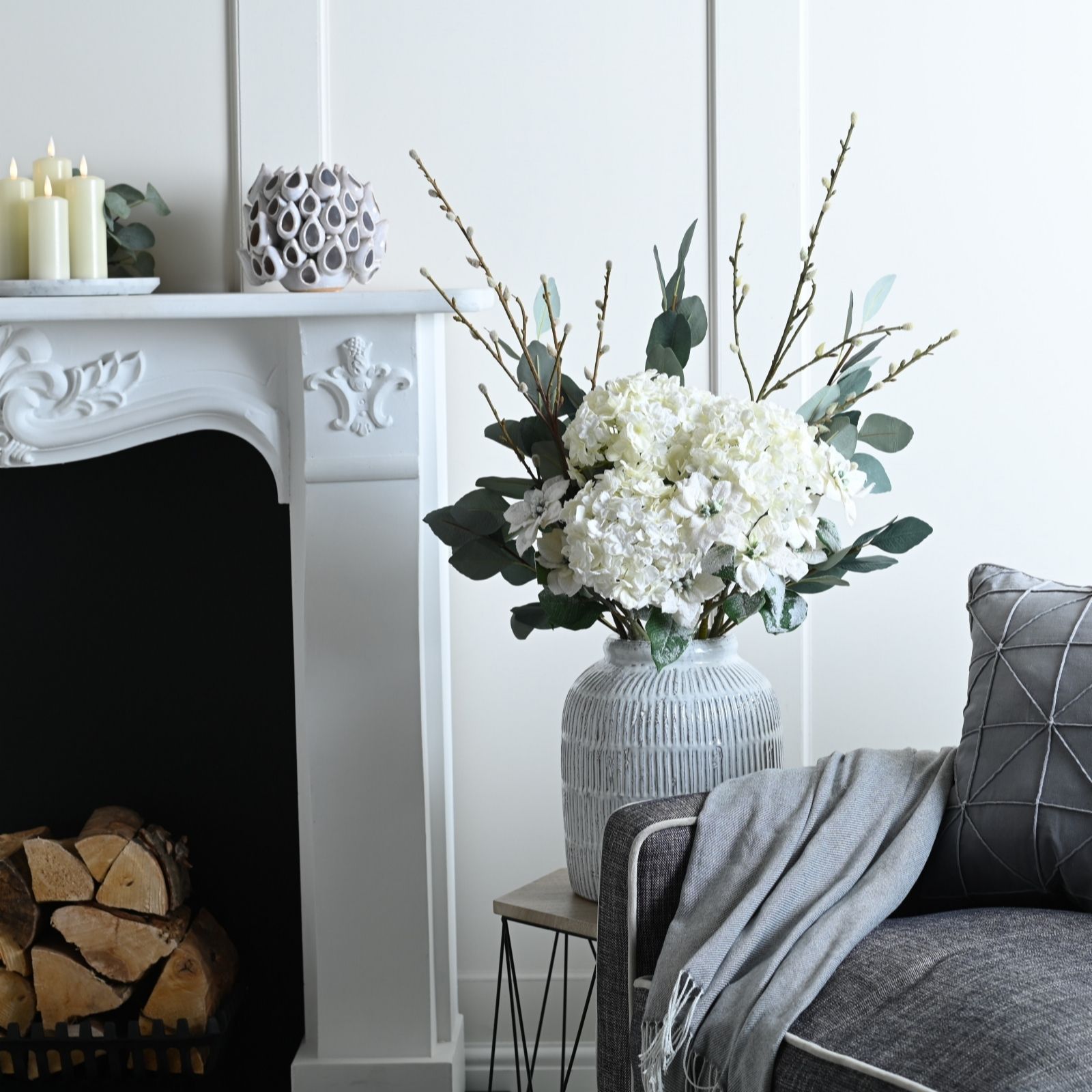 Embrace the magic of winter with the Ottersbrook Winter Floristry Bouquet, a stunning creation that captures the serene beauty of the season. This elegant faux bouquet features a harmonious blend of green eucalyptus branches, willow branches, cream hydrangea stems and festive Christmas flowers, all crafted from high-quality materials. Perfect for adding a festive touch to your home, this bouquet is ideal for centrepieces, mantels, or as a charming gift to bring winter's wonder into any space.